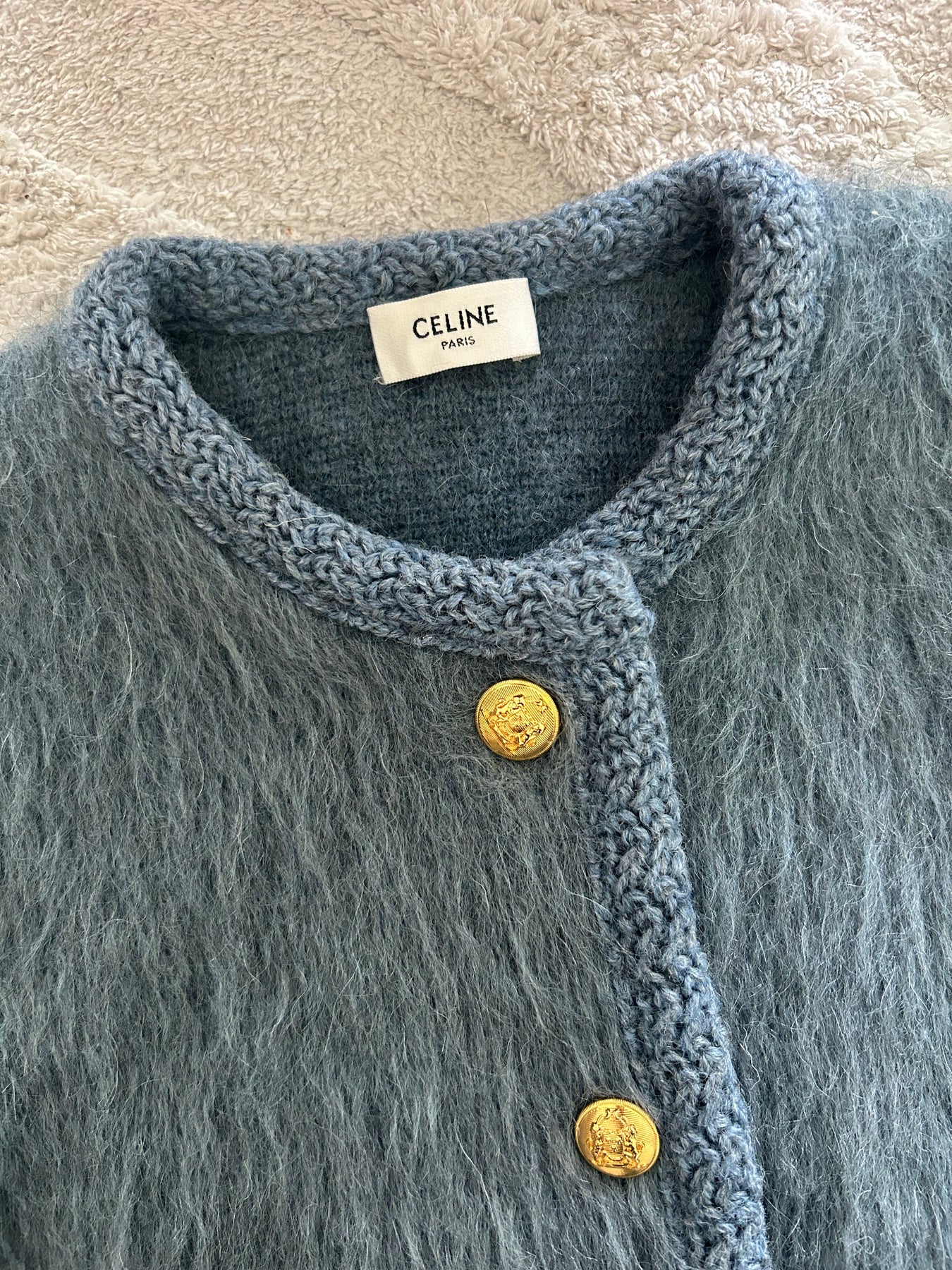Beautiful CELINE classic cardigan jacket in a stunning blue brushed mohair material finished with gold signature buttons font closure and braided trim. A timeless piece that keeps on giving elegance and sophistication as well as comfort years after years.