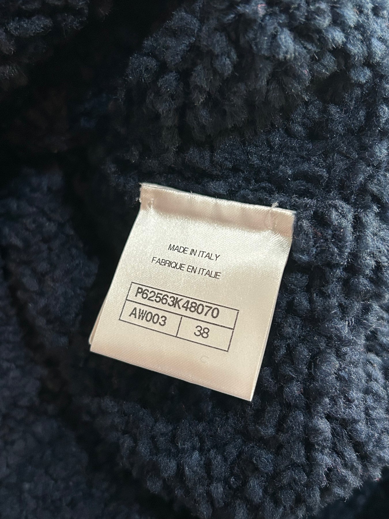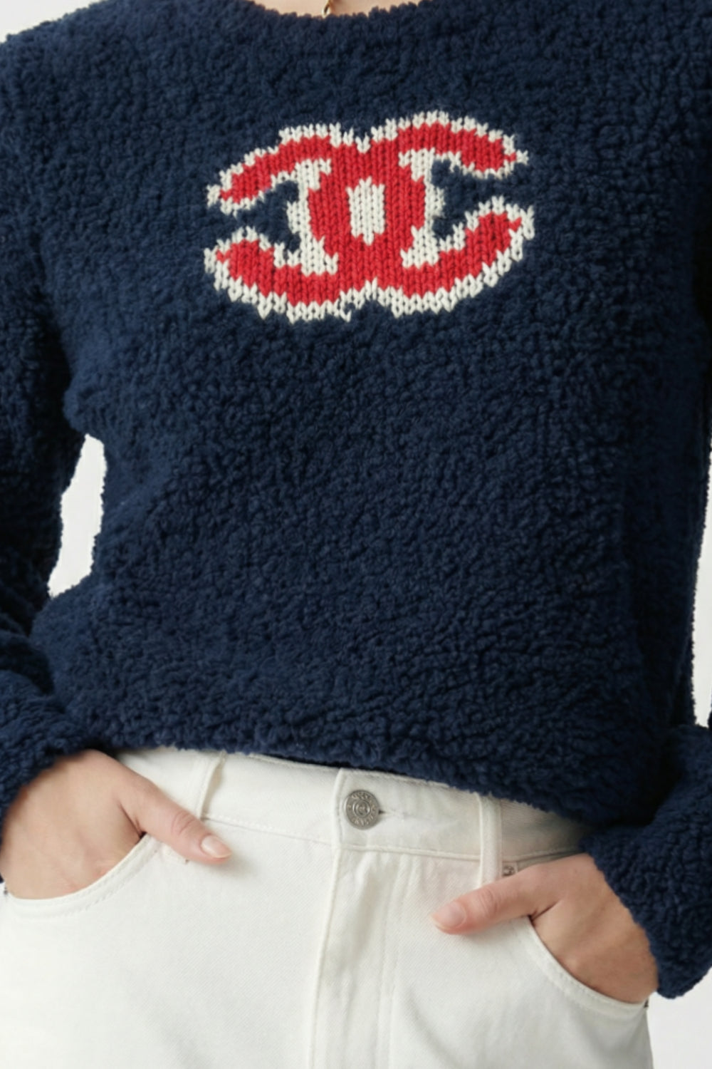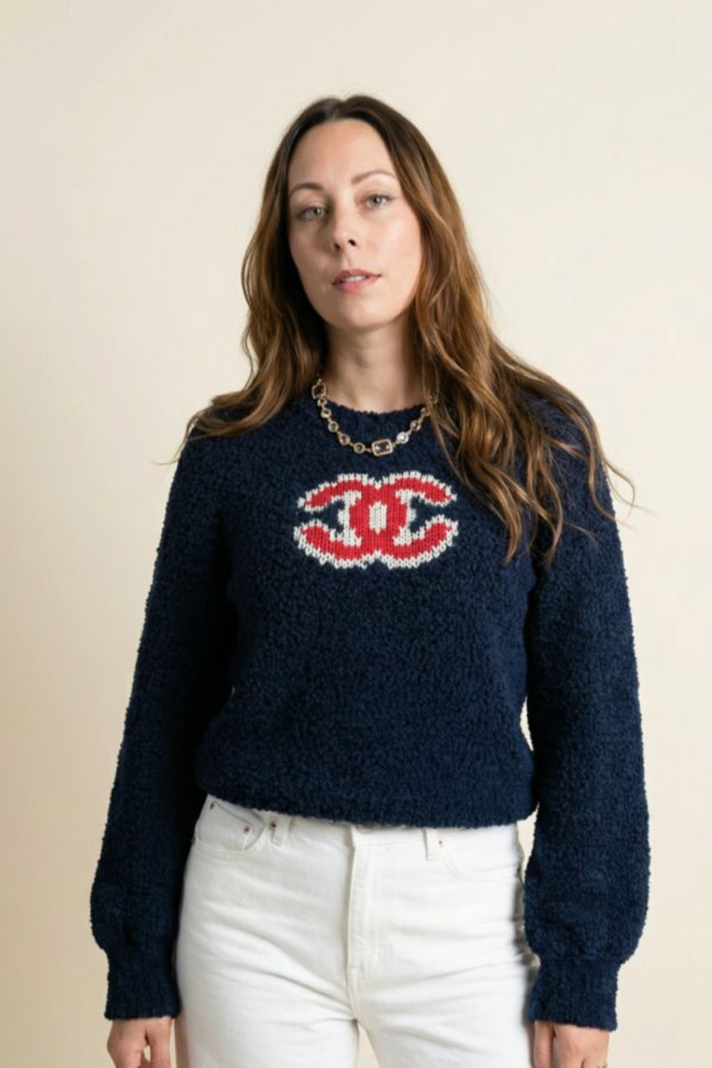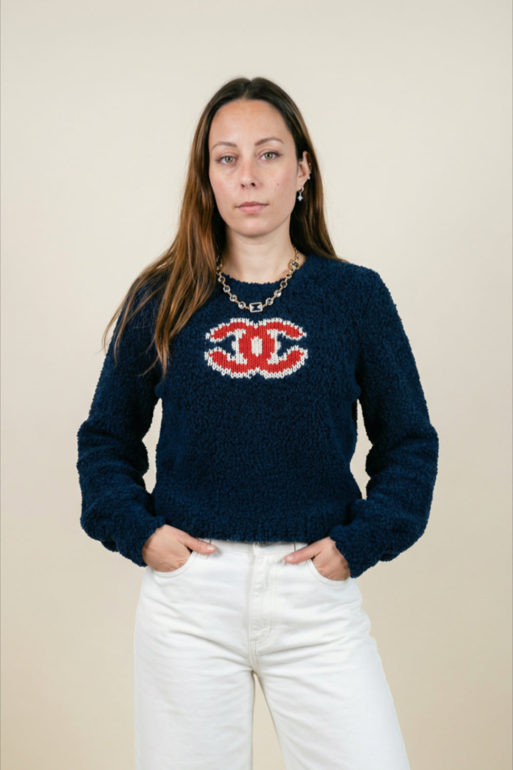 CHANEL Coco Neige Teddy Wool Cashmere Navy Blue Sweater With Red & White CC Logo Front size 38