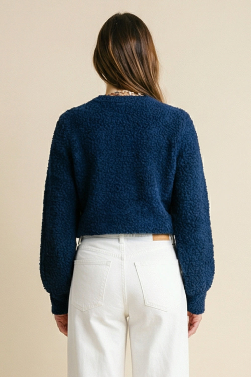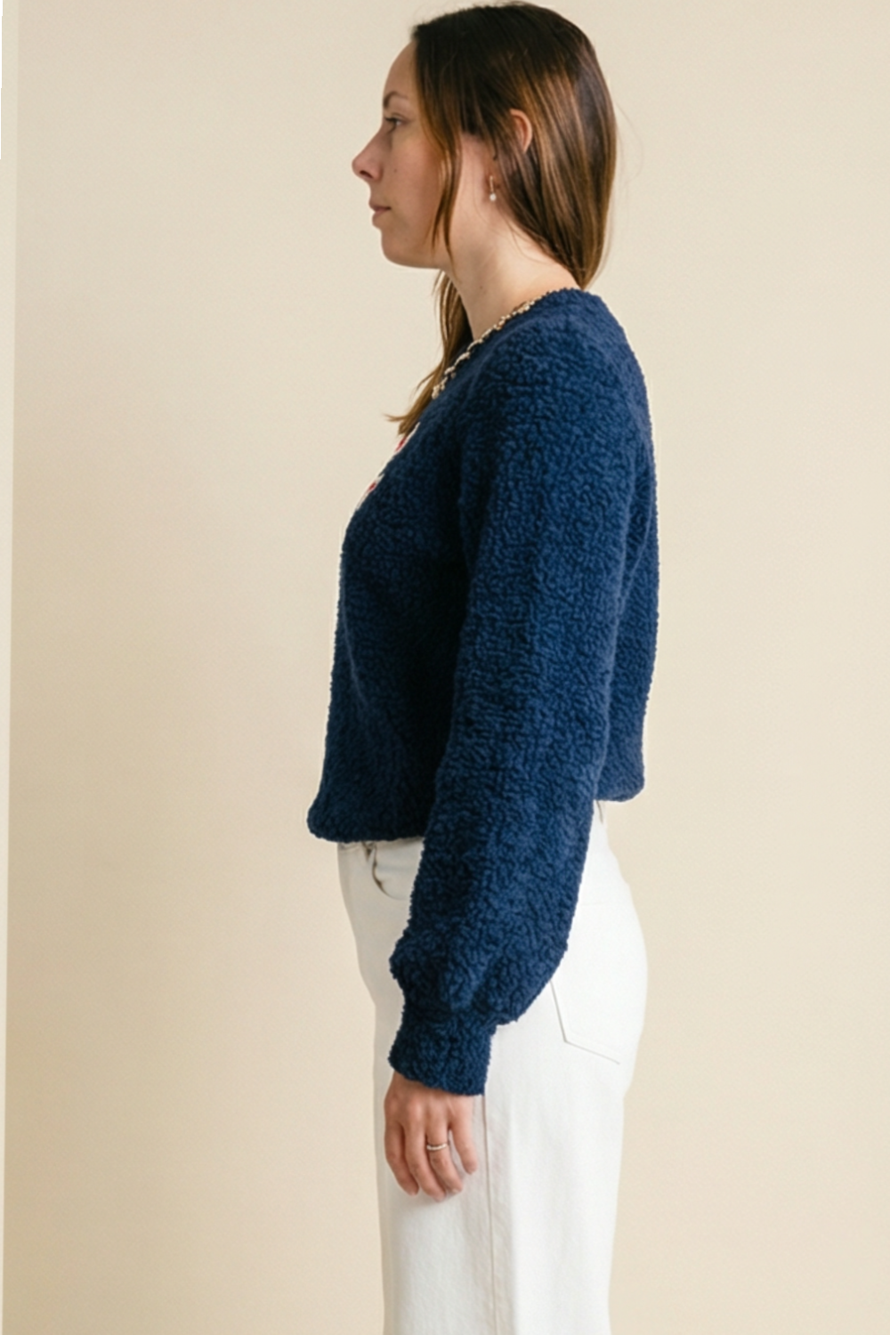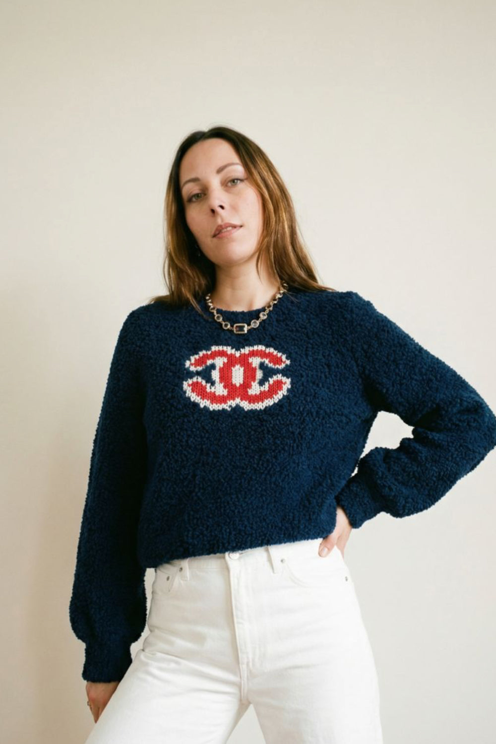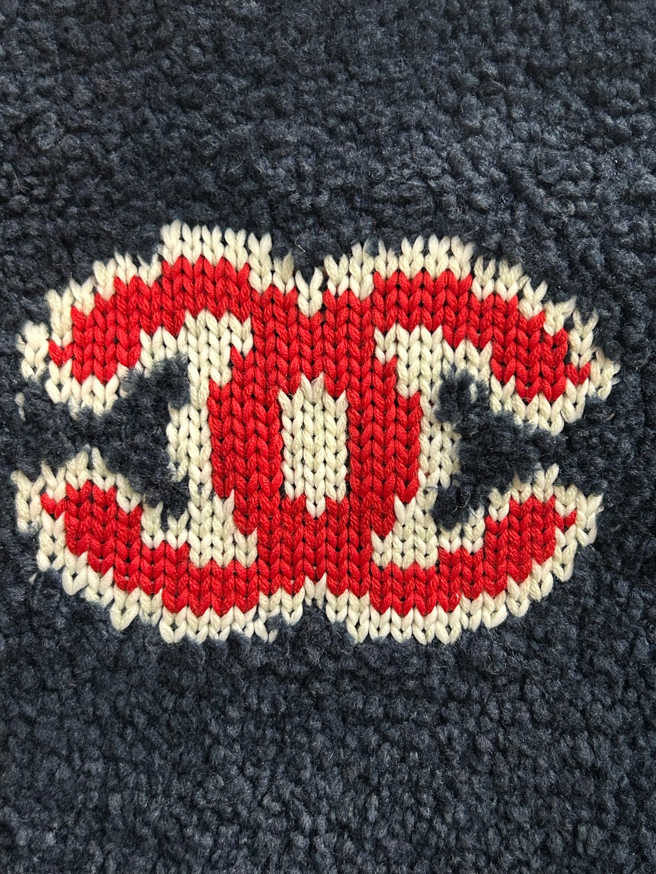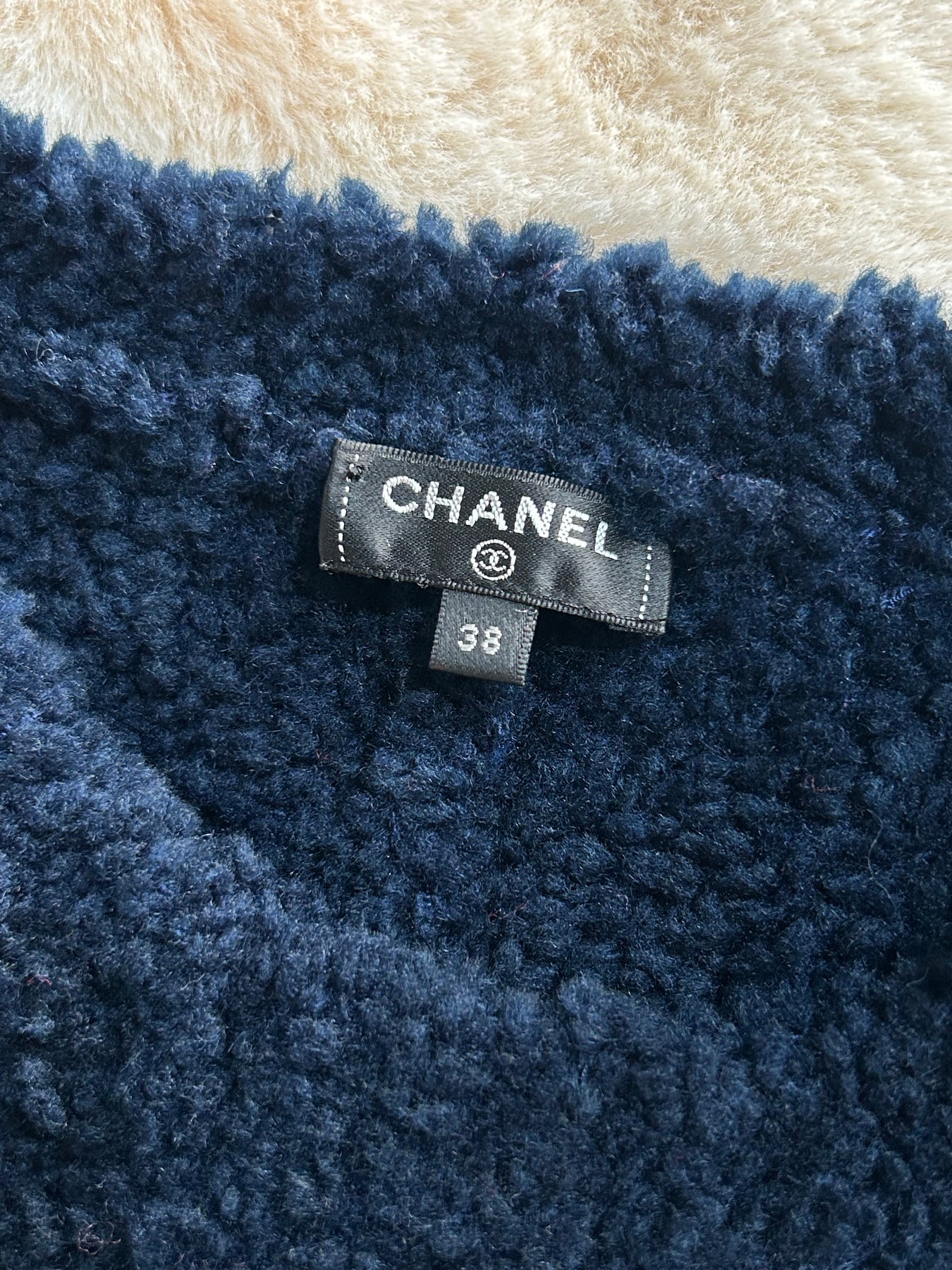 CHANEL Coco Neige Teddy Wool Cashmere Navy Blue Sweater With Red & White CC Logo Front size 38