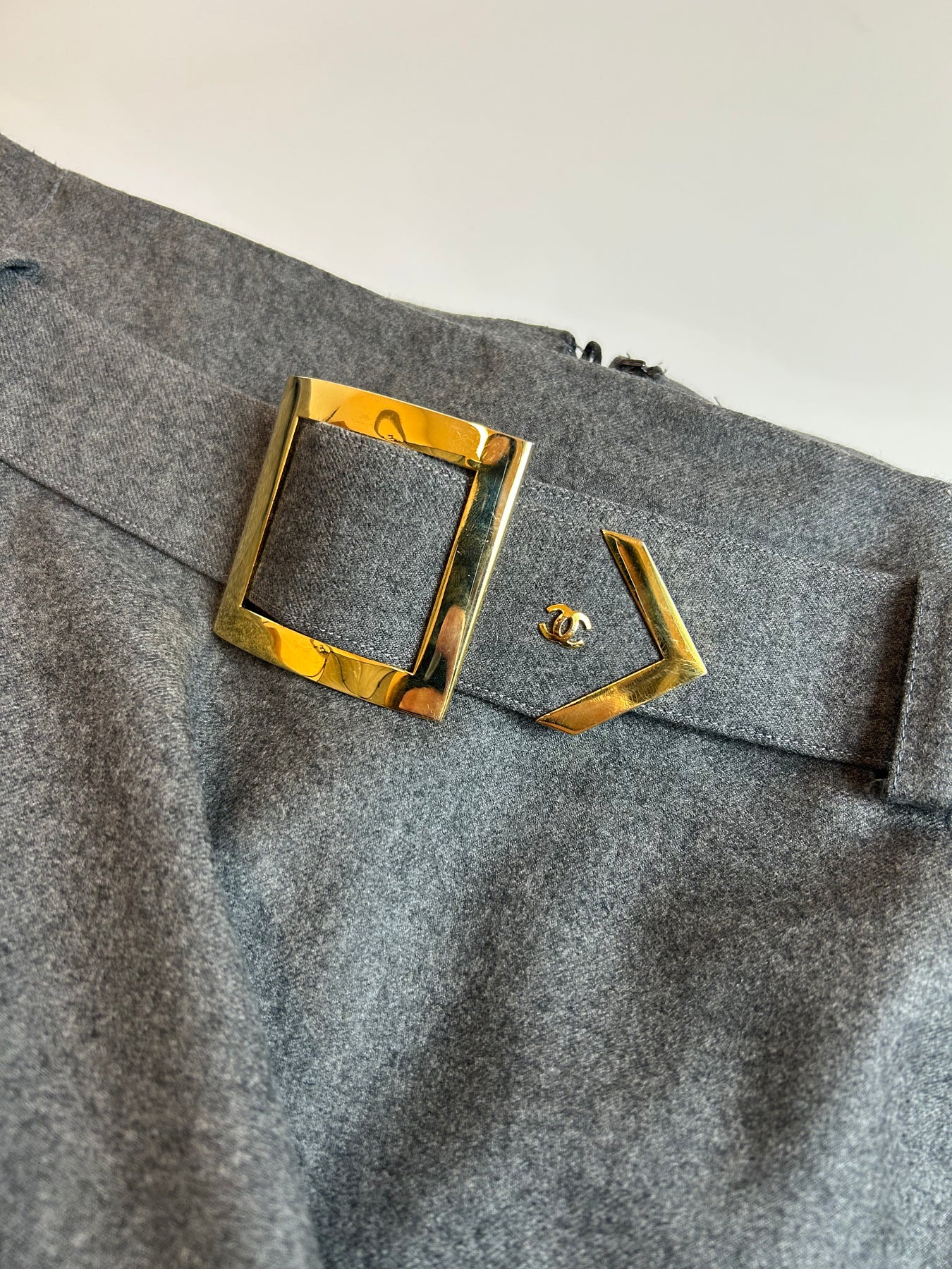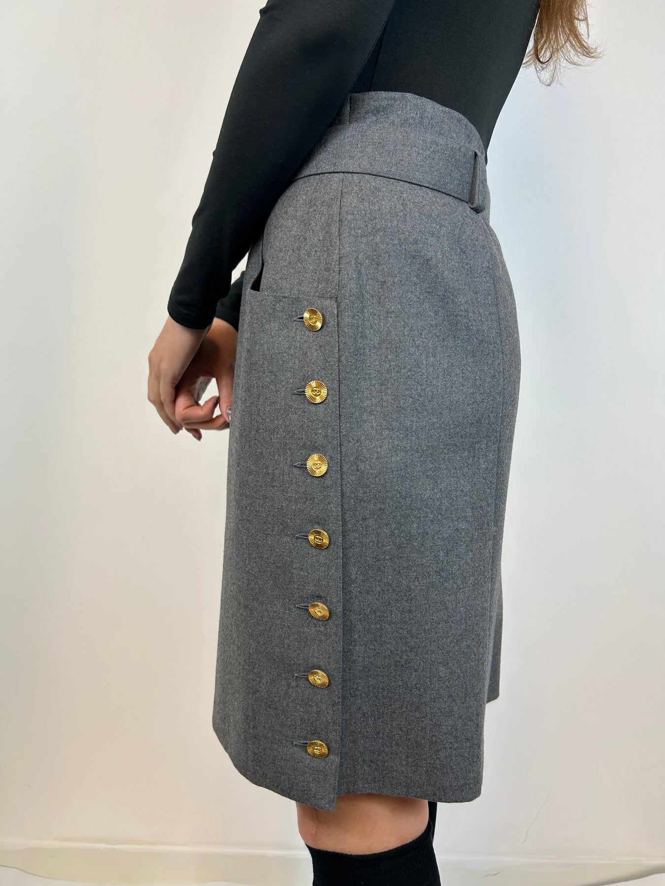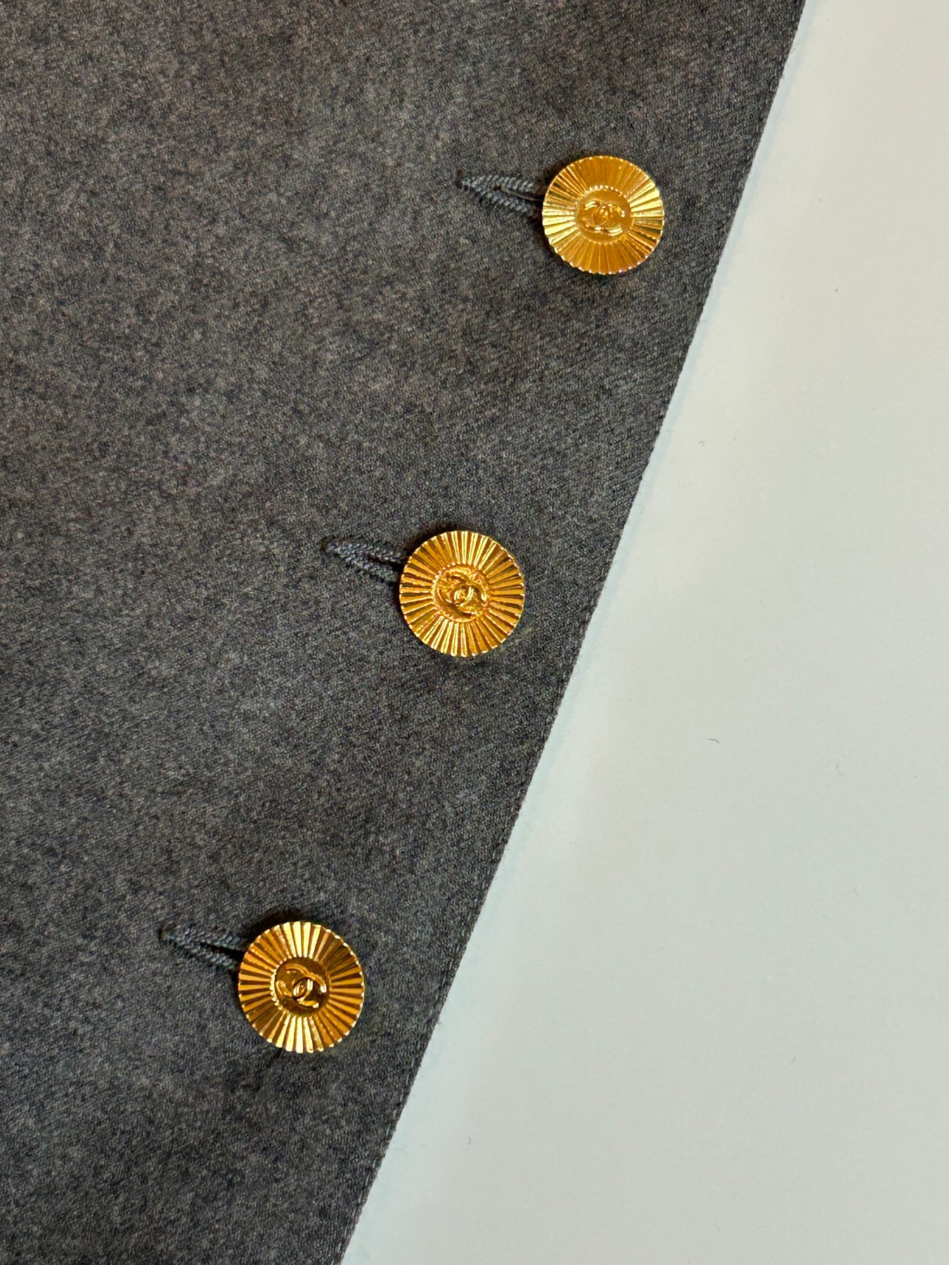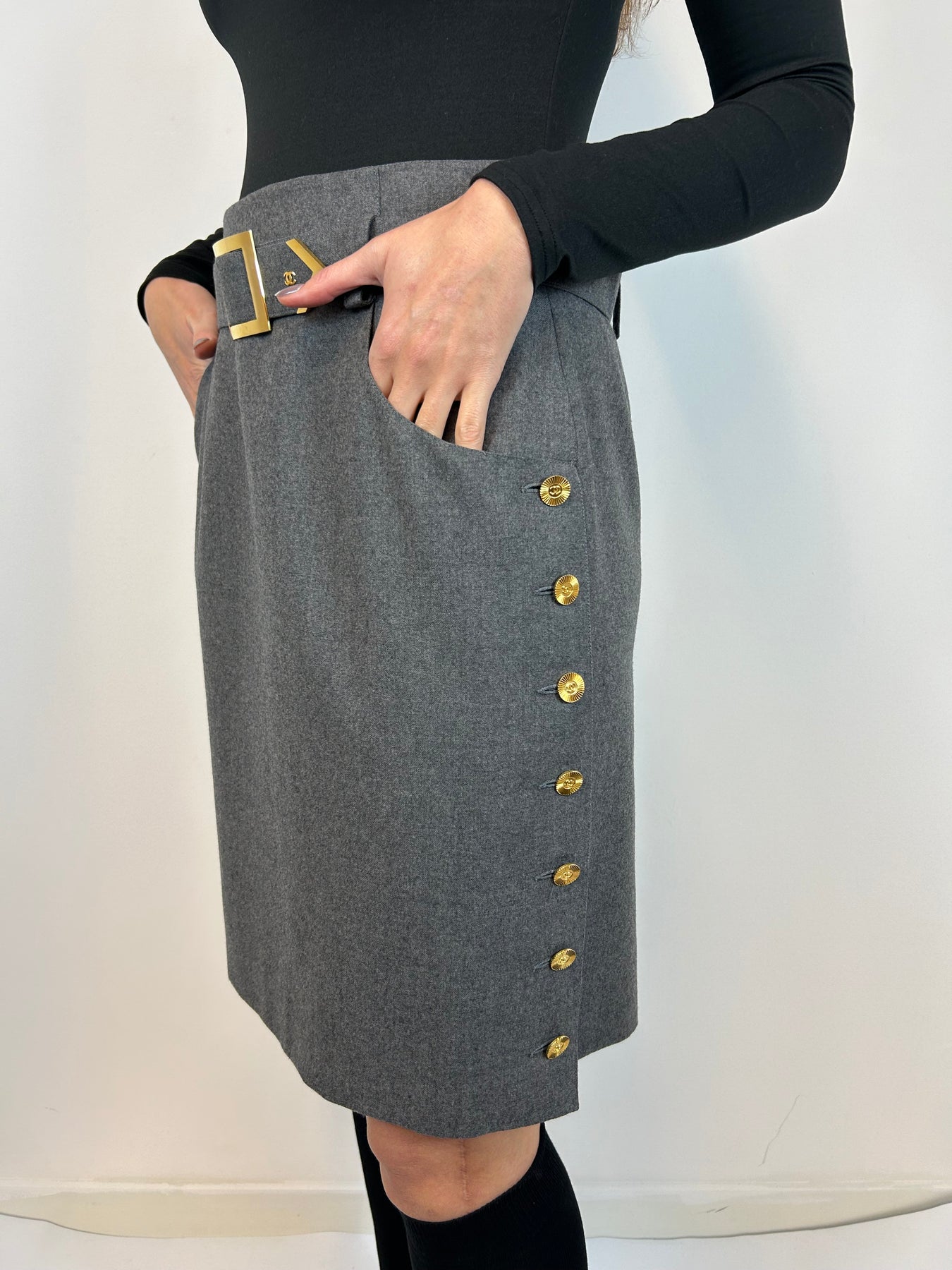 CHANEL 1990's Vintage Grey Wool Gold CC sunburst buttons skirt with CC belt