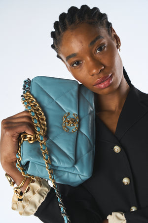 Shop this stunning and elegant blue shiny calfskin class handbag by CELINE. With a gold clasp closure in the front, it opens to a leather interior with two compartments including one with two small slit pockets and an extra zipper compartment. Its strap is adjustable and removable. Wear it as a clutch, crossbody or over the shoulder.