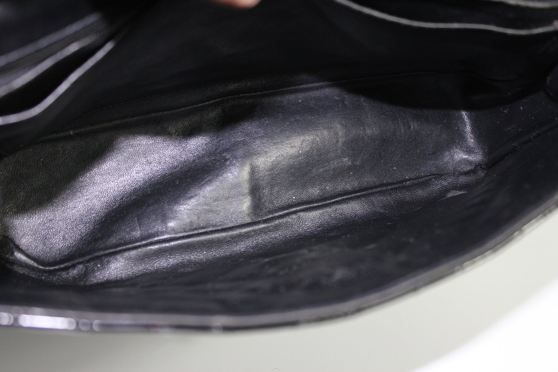Good condition. Corners and patent leather are in very good condition, looking upclose the patent leather shows a delicate shimmer throughout, is non-sticky, no tarnish to the hardware. Interior show signs of wear, the original serial sticker was misplaced after a cleaning.