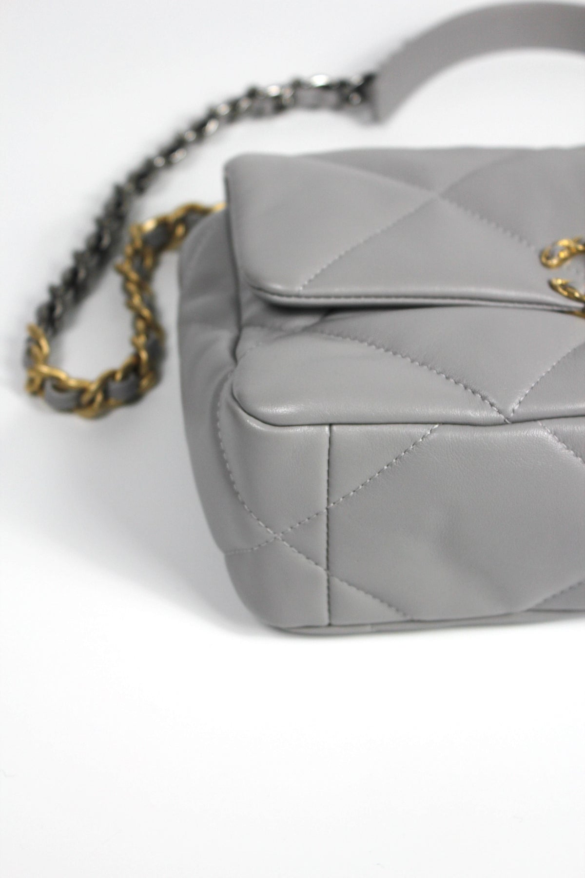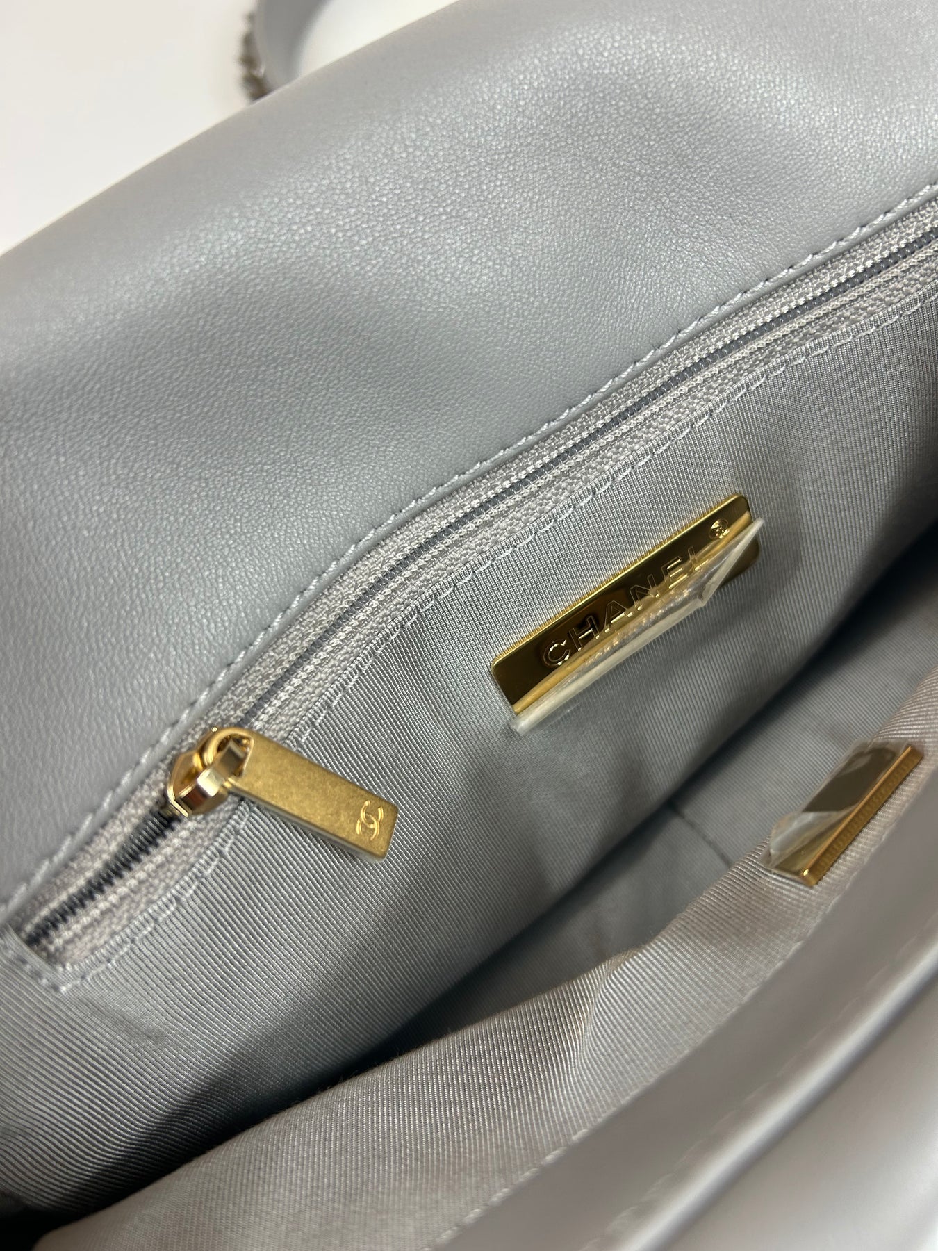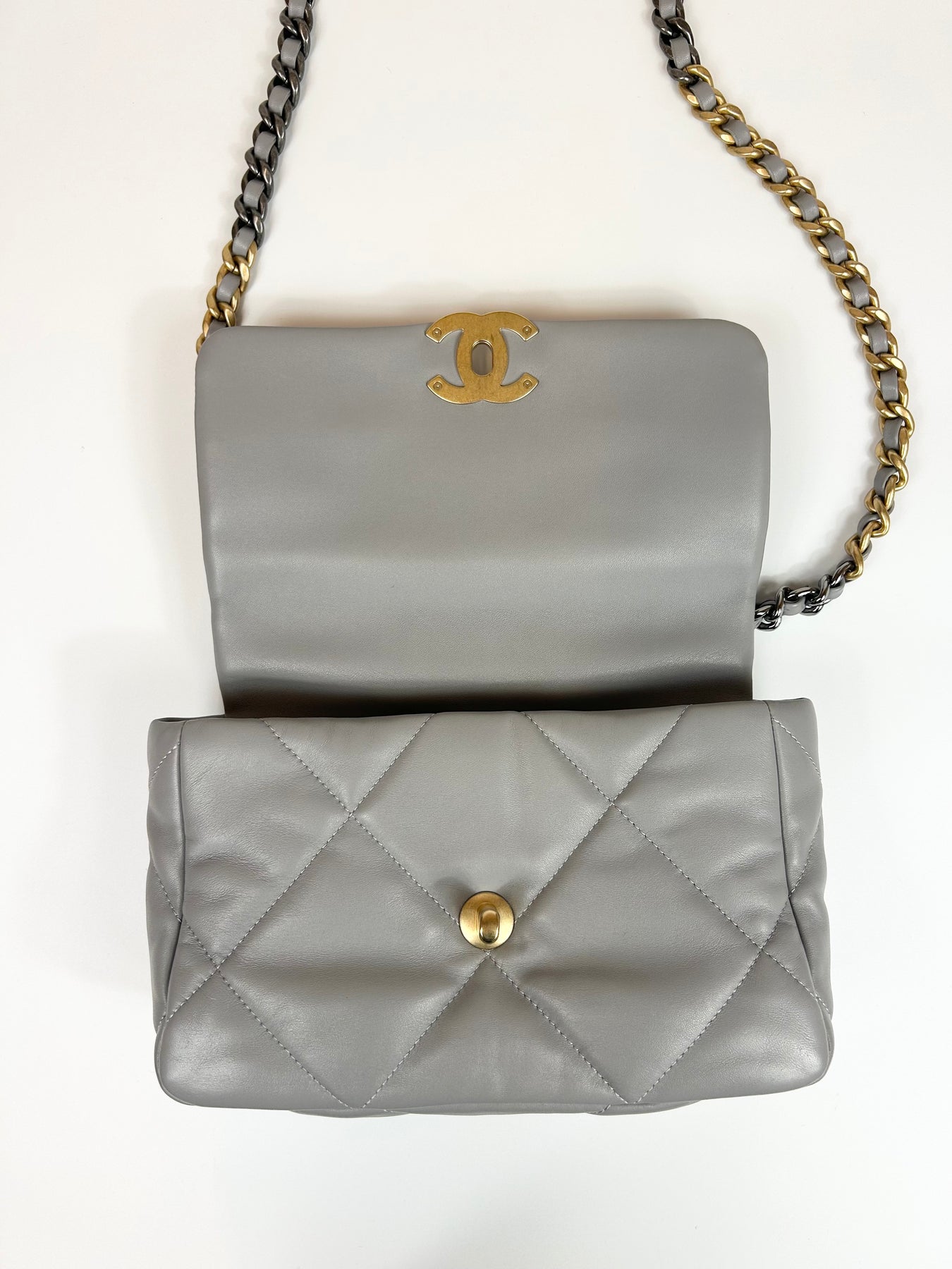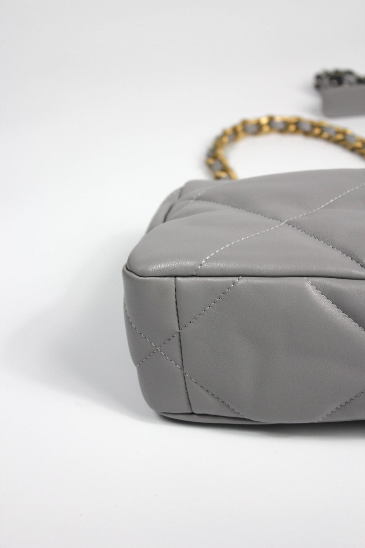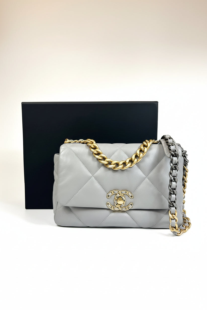 CHANEL Small 19 light grey lambskin leather with gold, ruthenium and silver hardware with box