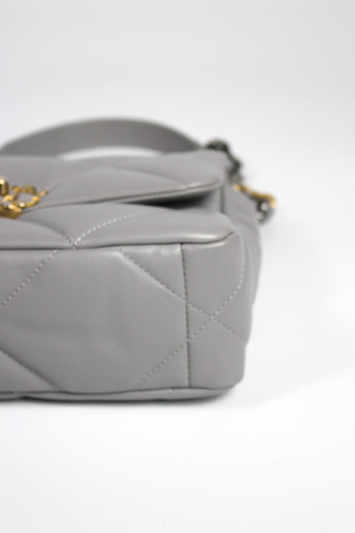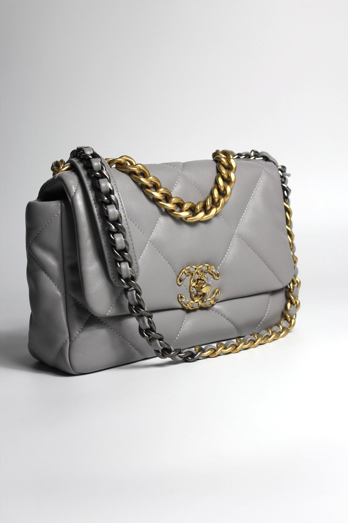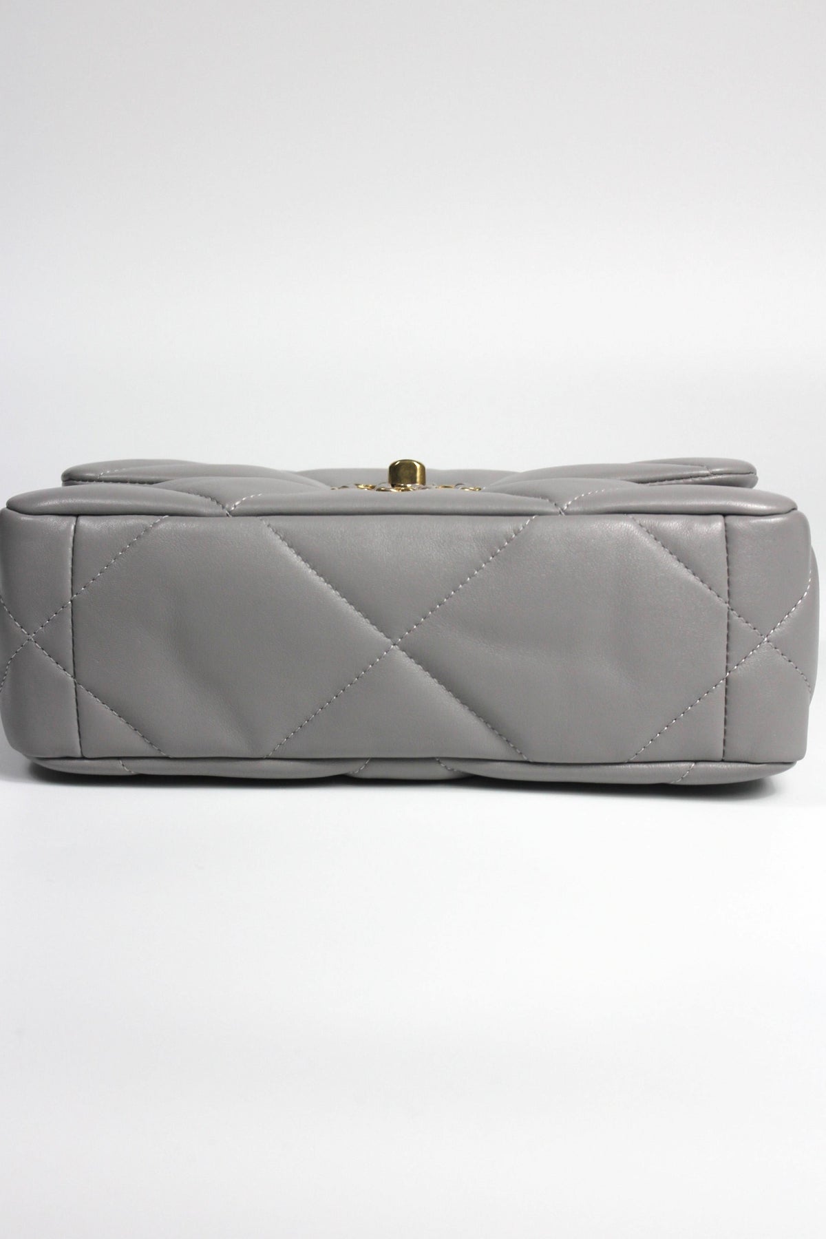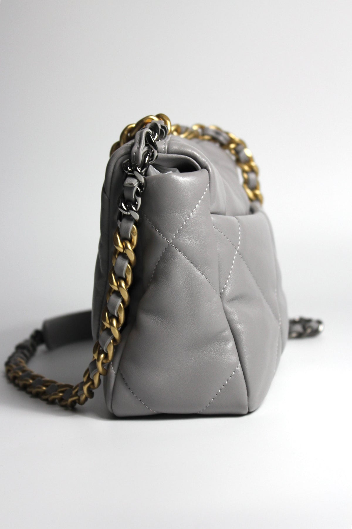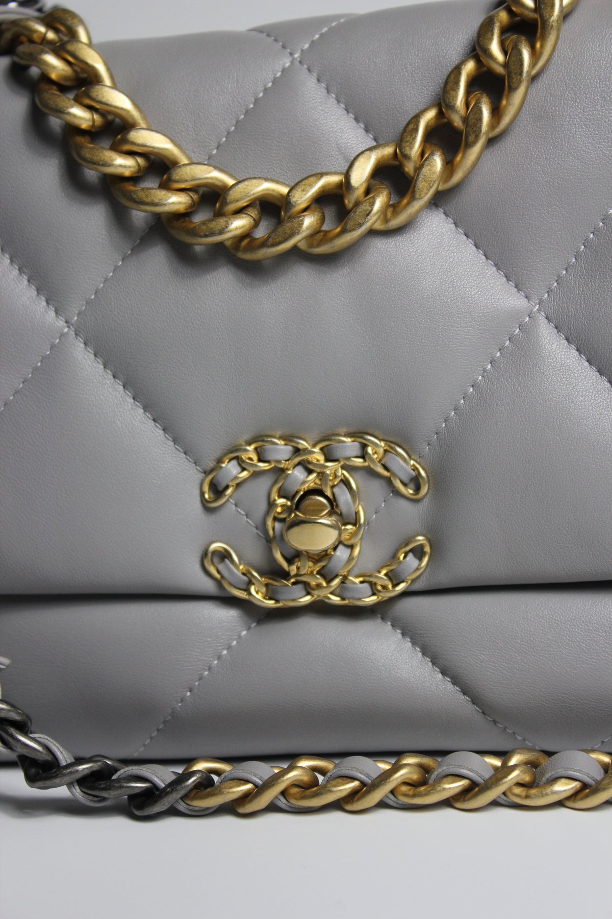 CHANEL Small 19 light grey lambskin leather with gold, ruthenium and silver hardware with box