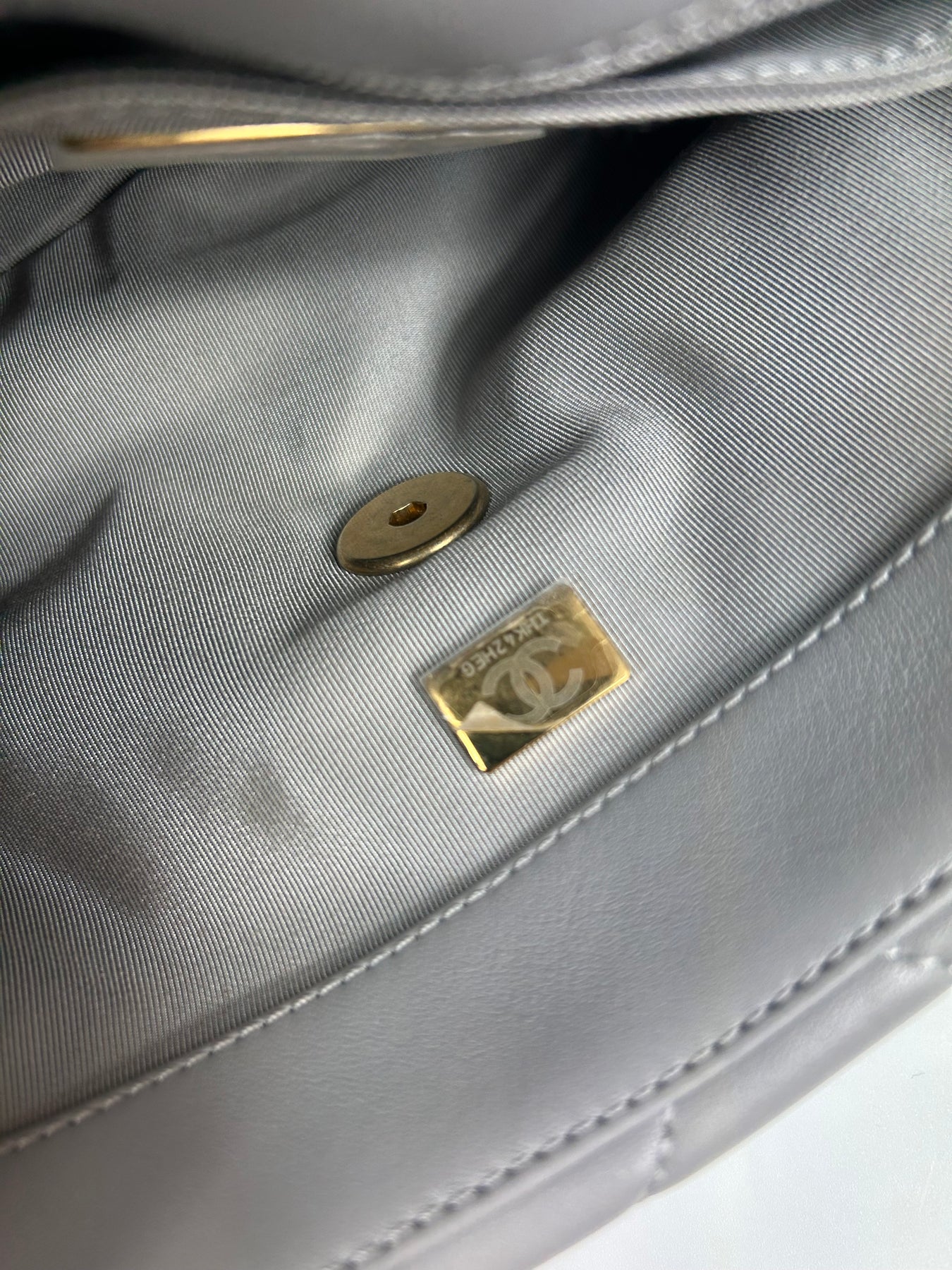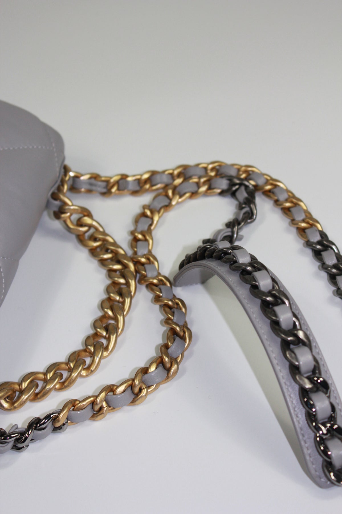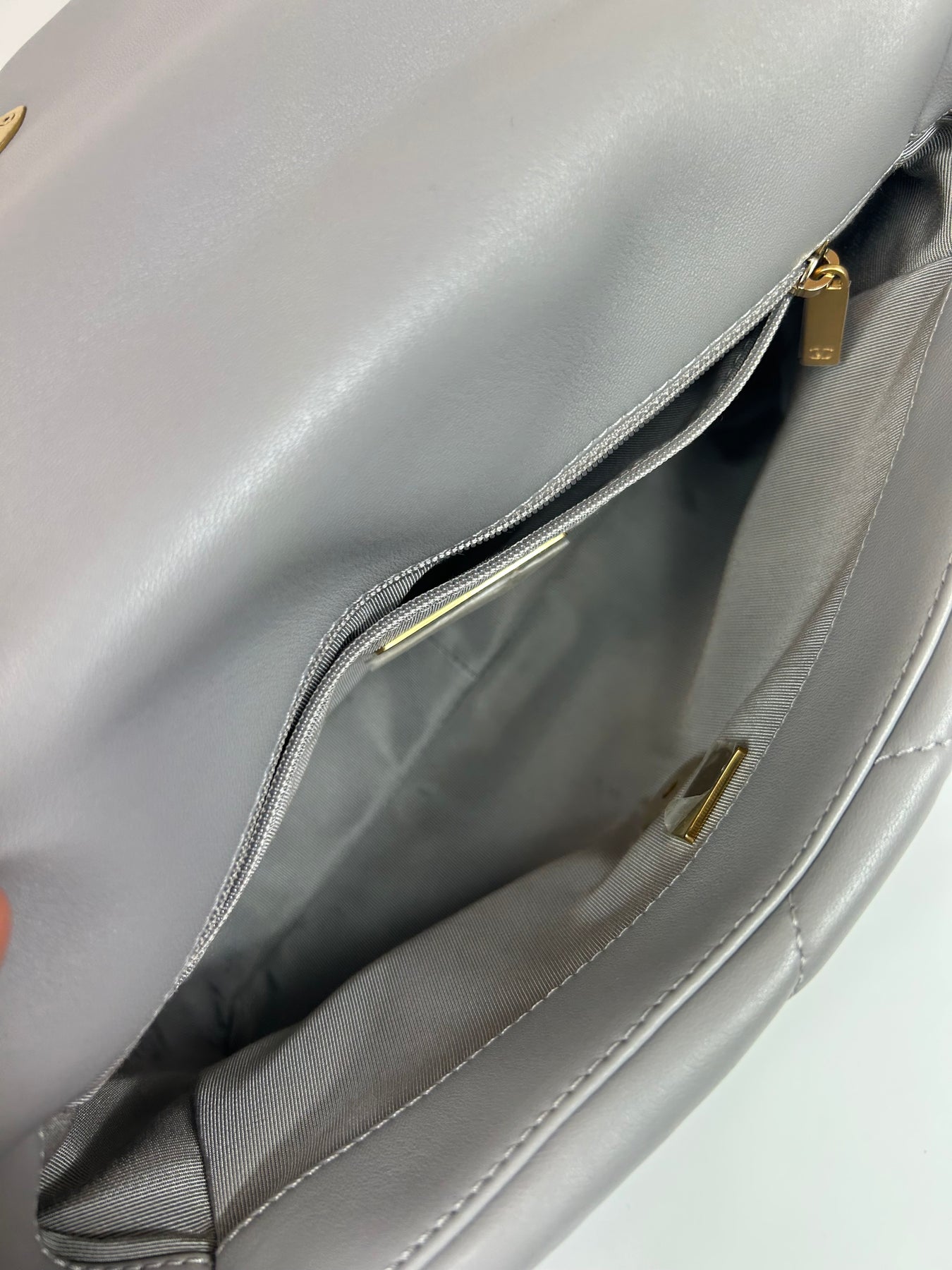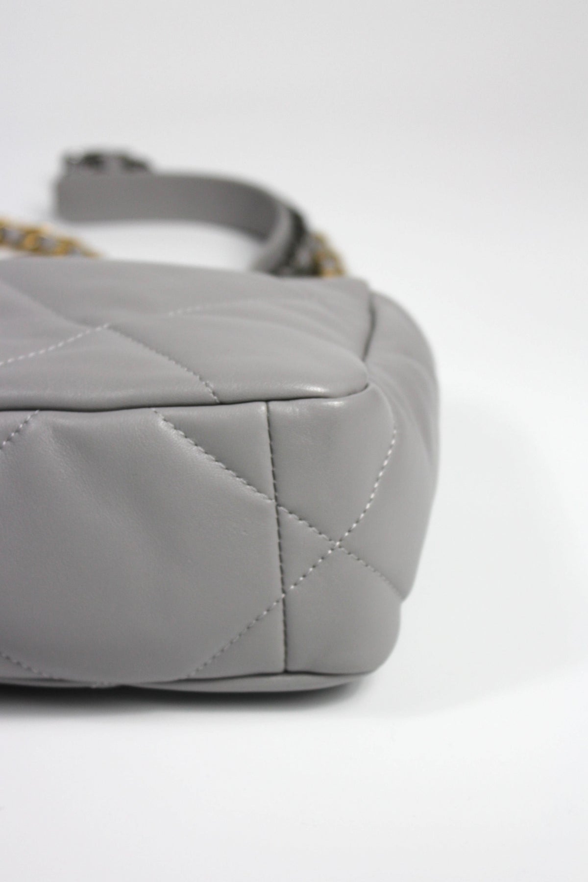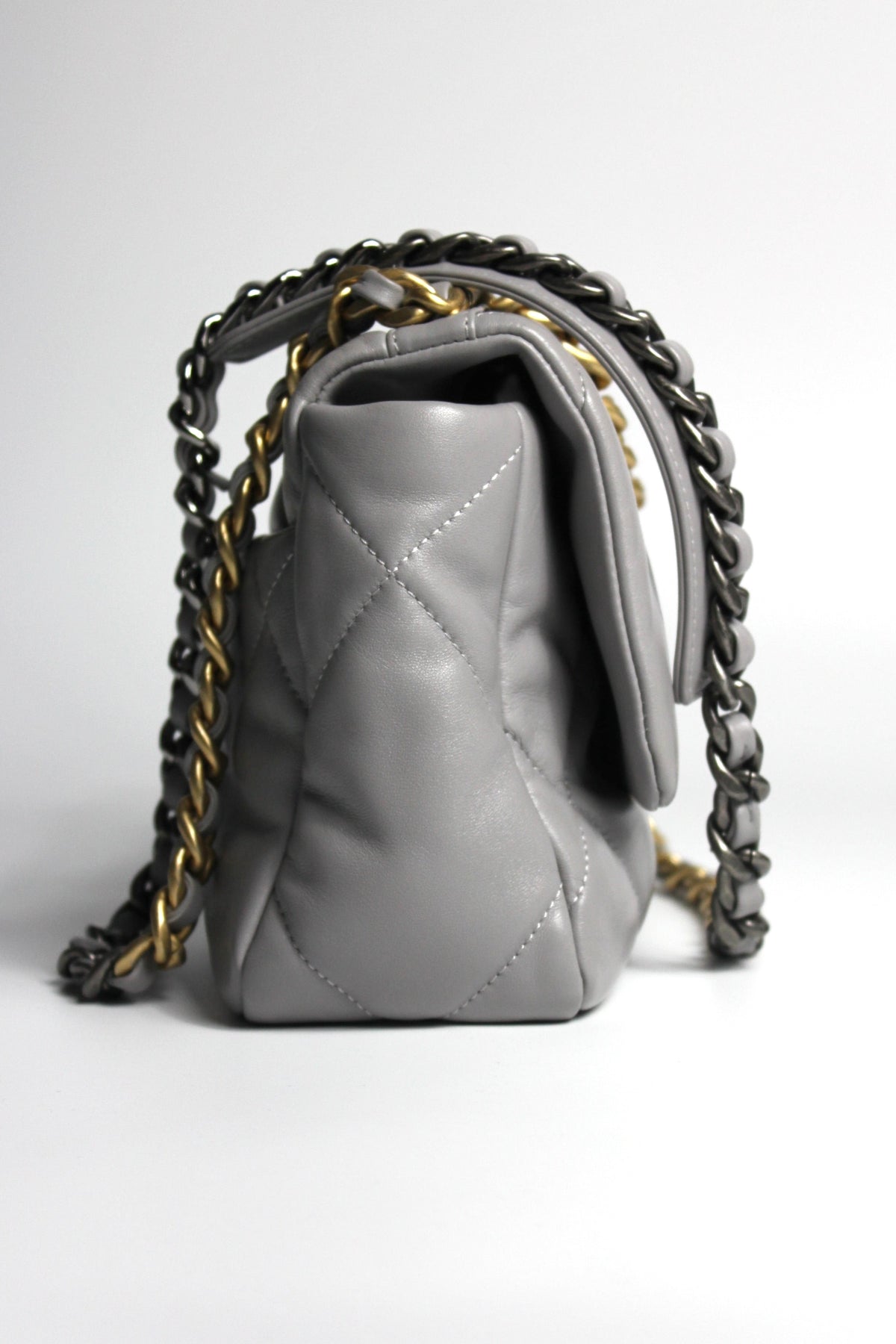 CHANEL Small 19 light grey lambskin leather with gold, ruthenium and silver hardware with box