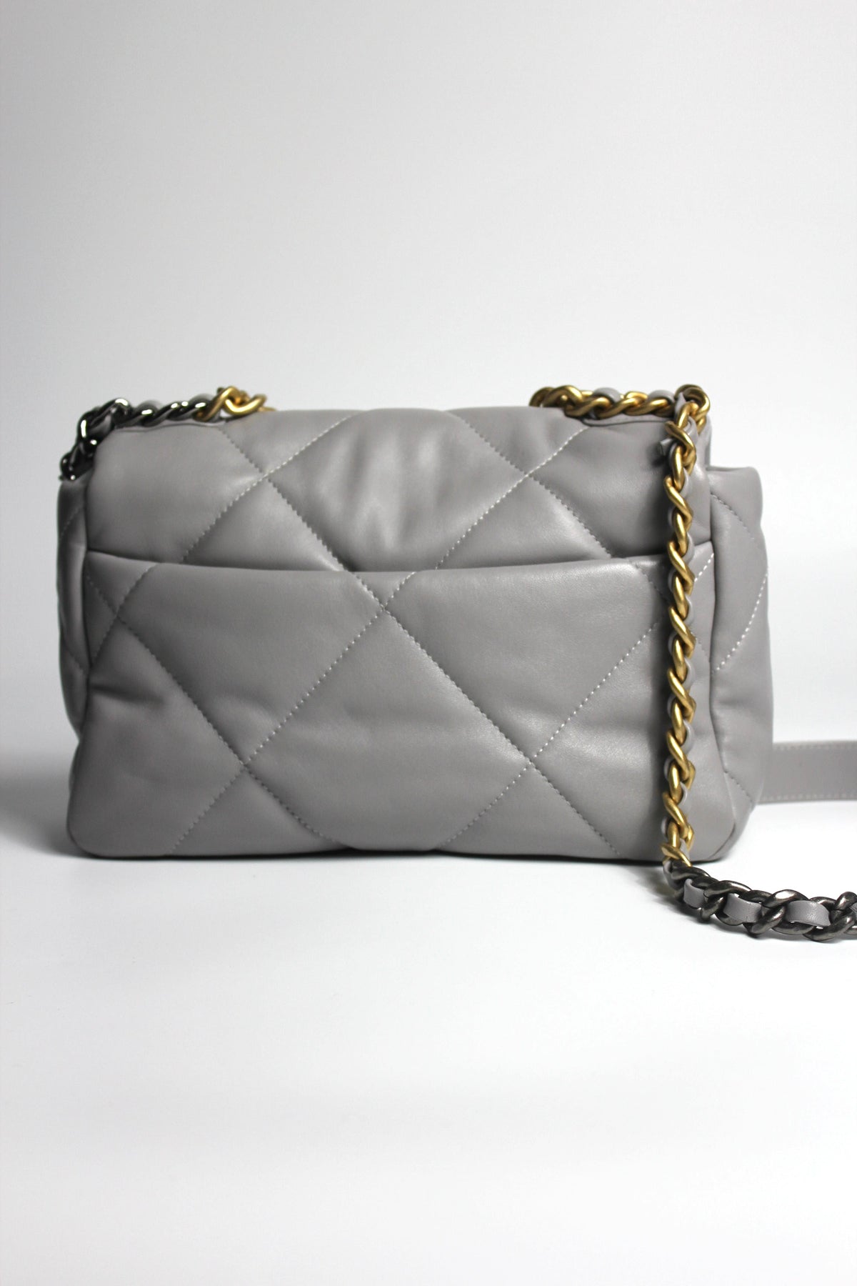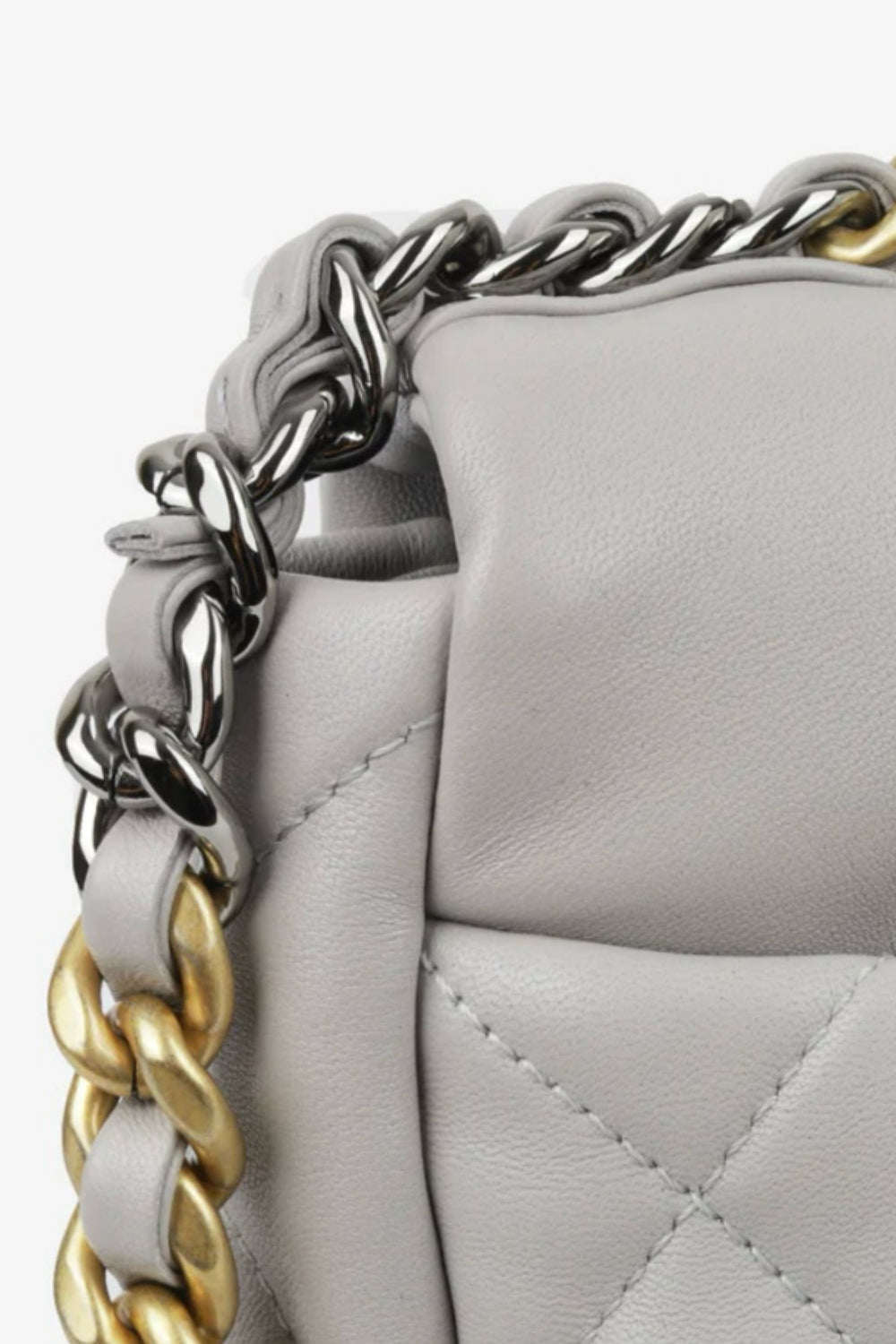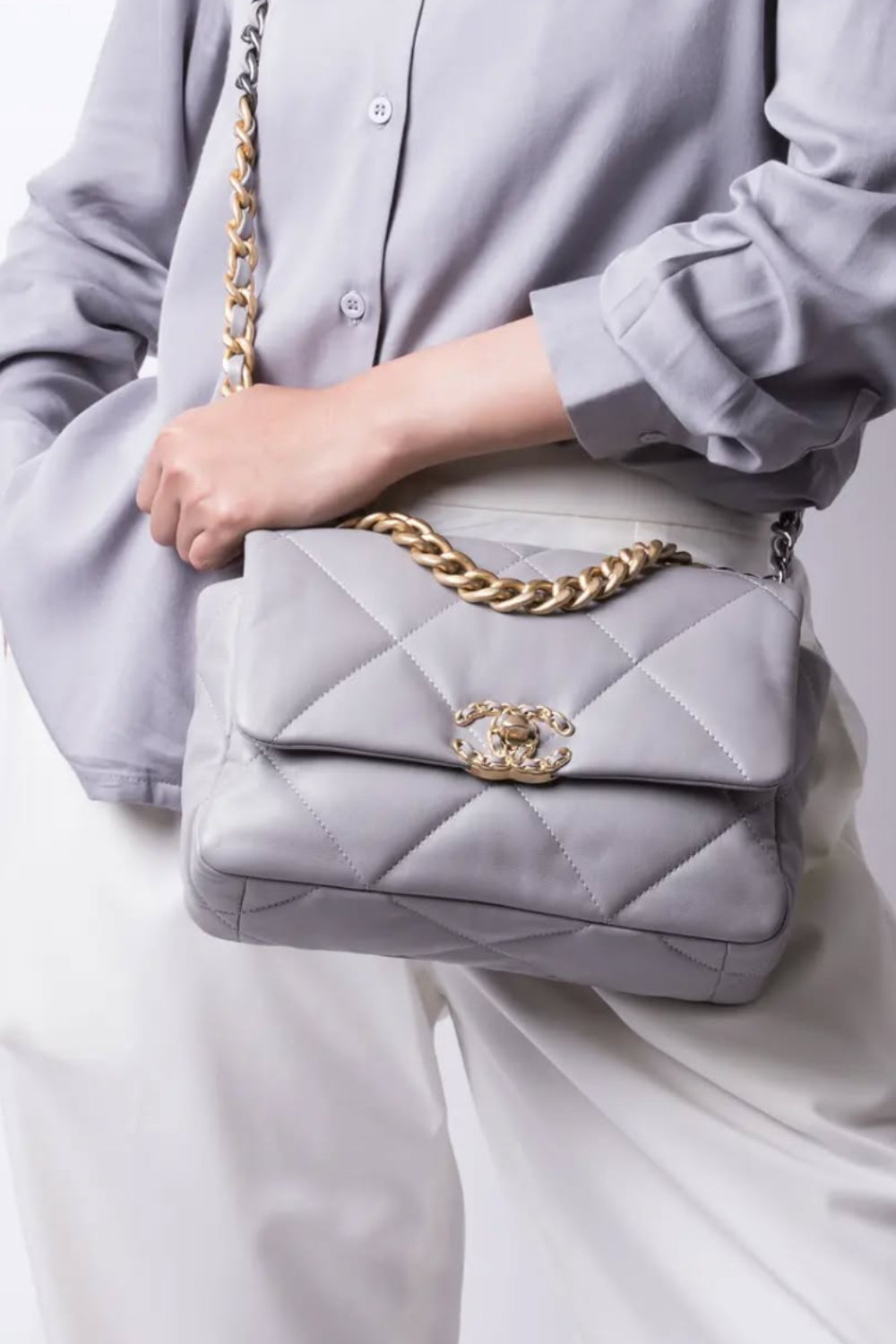 The CHANEL 19 small leather handbag is a great choice for day to evening with its short chain handle to carry by hand or long chain strap to wear crossbody. Spacious enough to carry all essentials, it is made in a subtle light grey/ dove grey soft lambskin leather paired with tri-color hardware. Gold, ruthenium and silver. Introduced in 2019, the 19 handbag was an instant hit and quickly become a new permanent of the French luxury house with a yearly price increase. It is reminiscing of the Boy bag with its chunky chain and features large diamond quilted stitching with a classic intertwined cc turnlock closure.