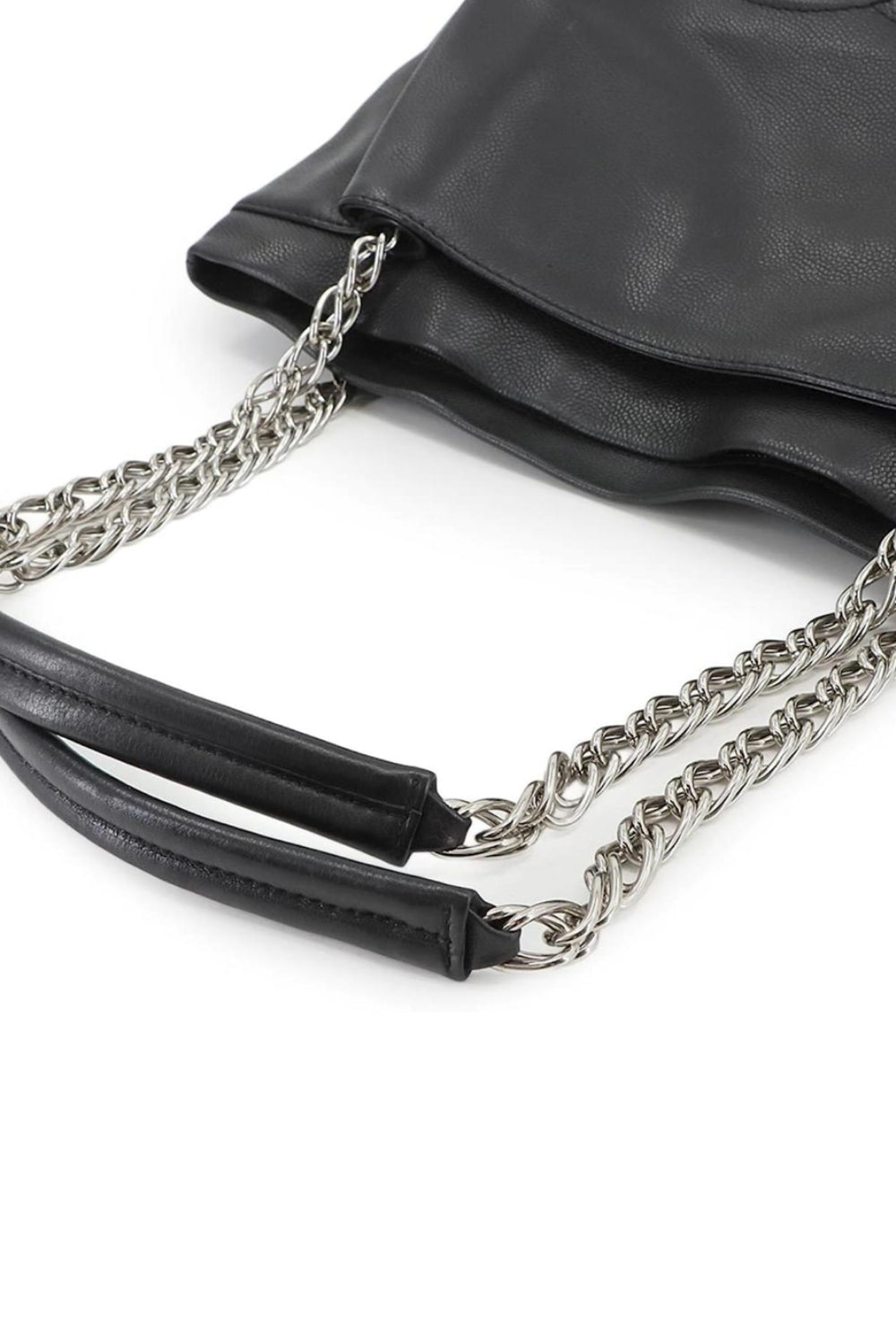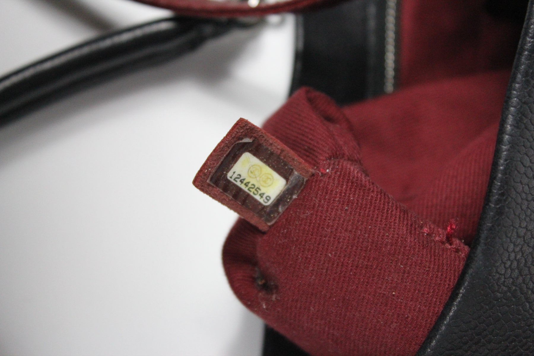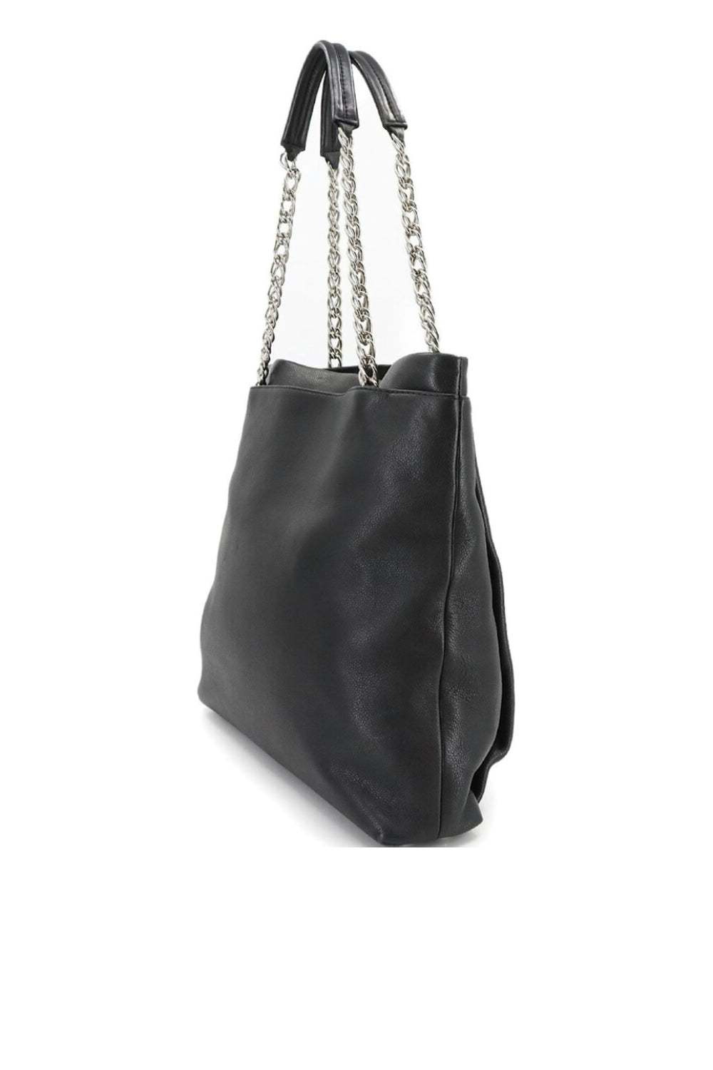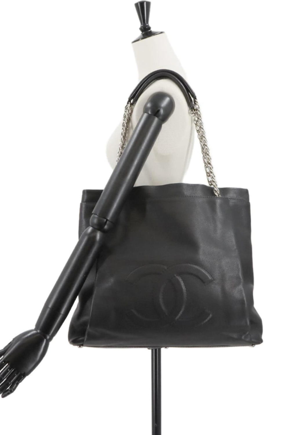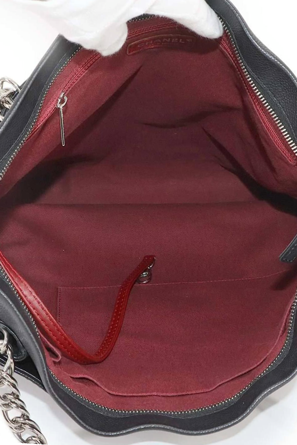 This CHANEL Caviar Tuck Tote features a top handle, metal chain shoulder strap, and the signature Chanel logo embossed on the front. The bag is large in size and has a structured shape. It is perfect for everyday use to carry all essentials or special occasions.