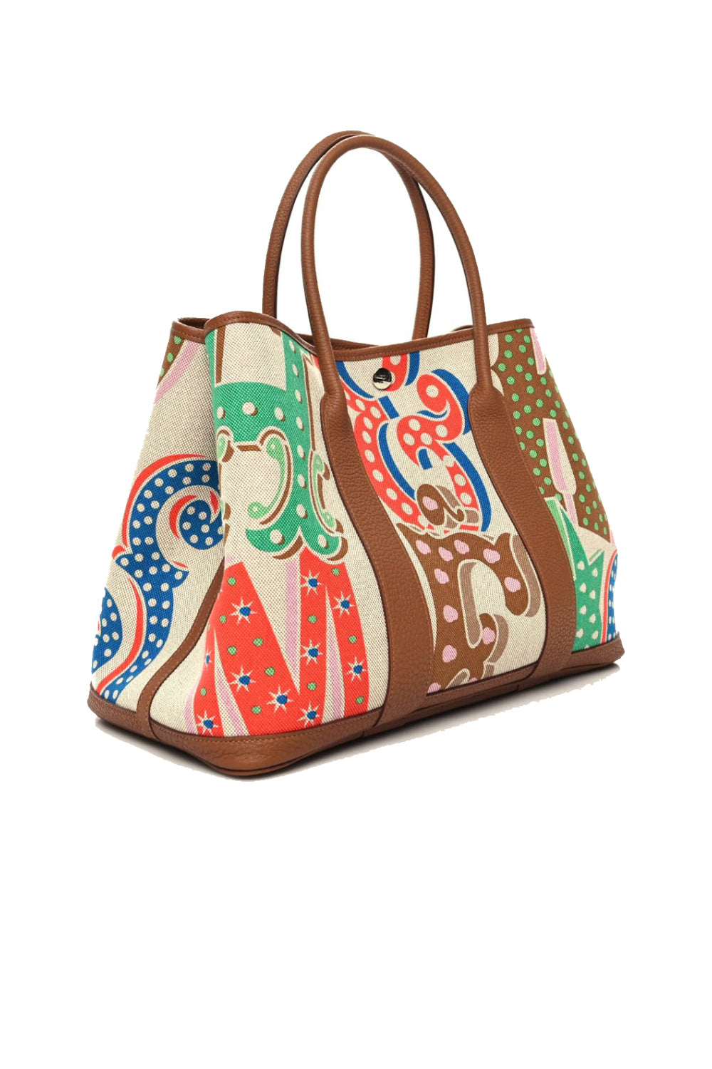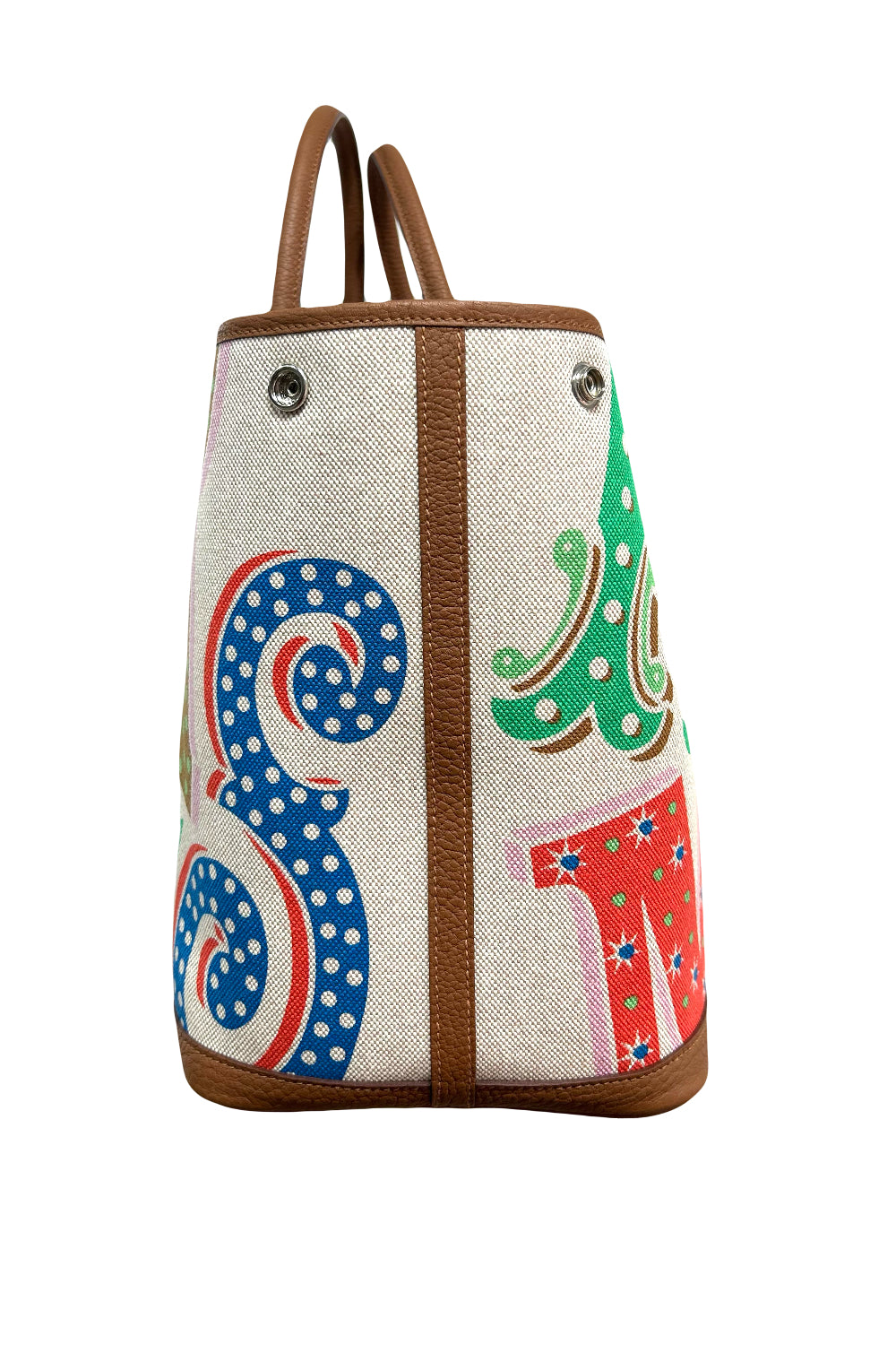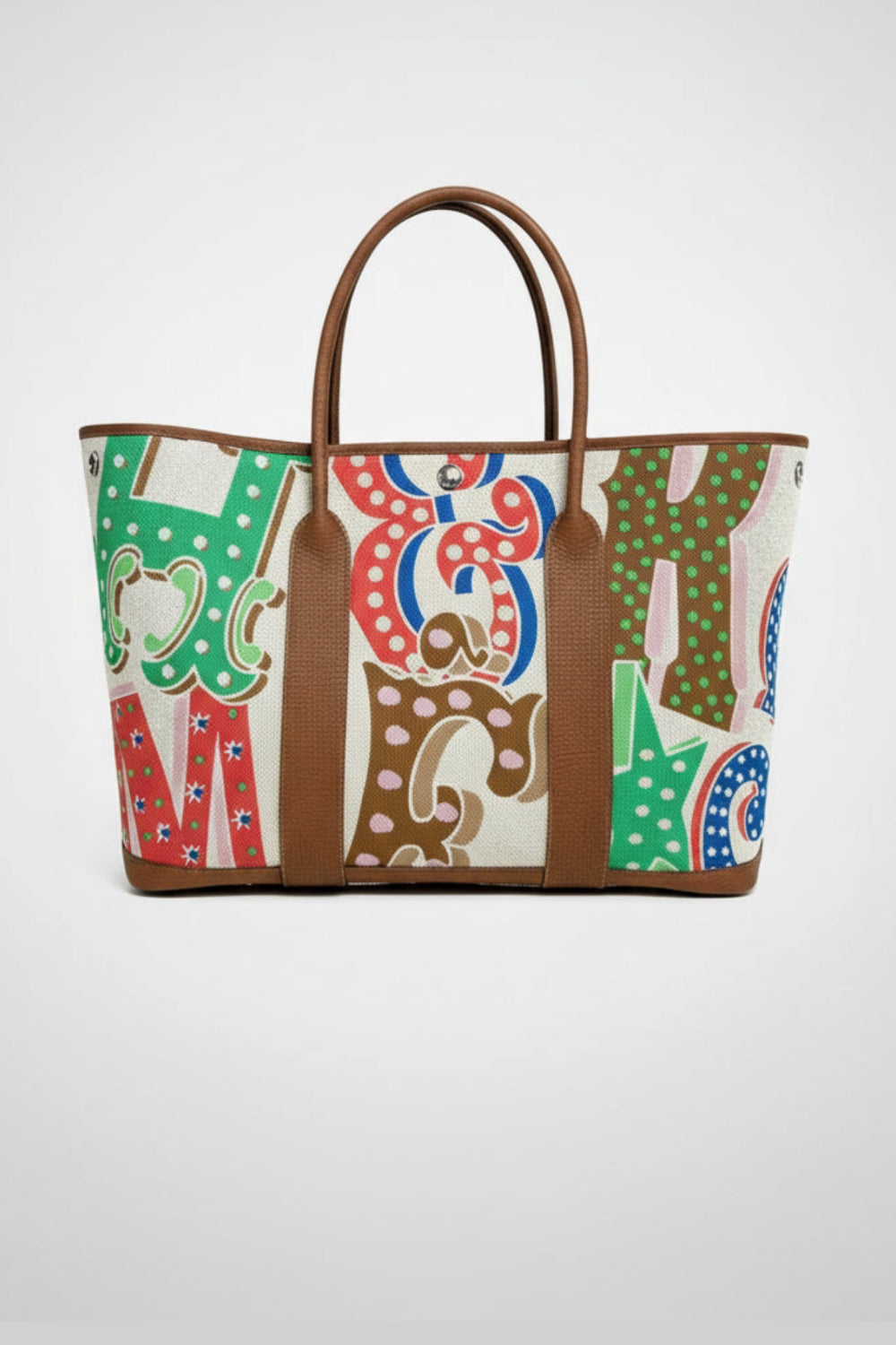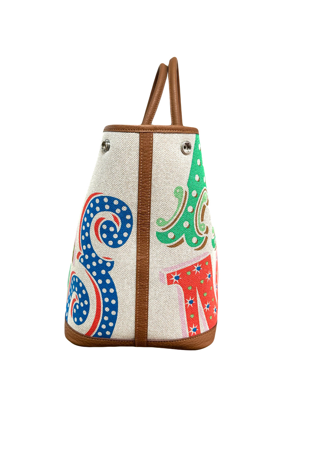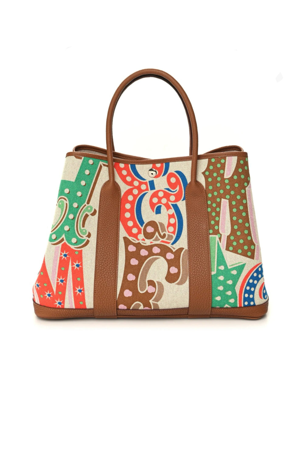 Shop this stunning HERMES Garden Party Electric Tote bag made of Toile in ecru, capucine and Gold negonda leather. It features "HERMES" Multi color letters and the classic palladium Clou de selle buttons closure. Ideal to carry all your essentials.