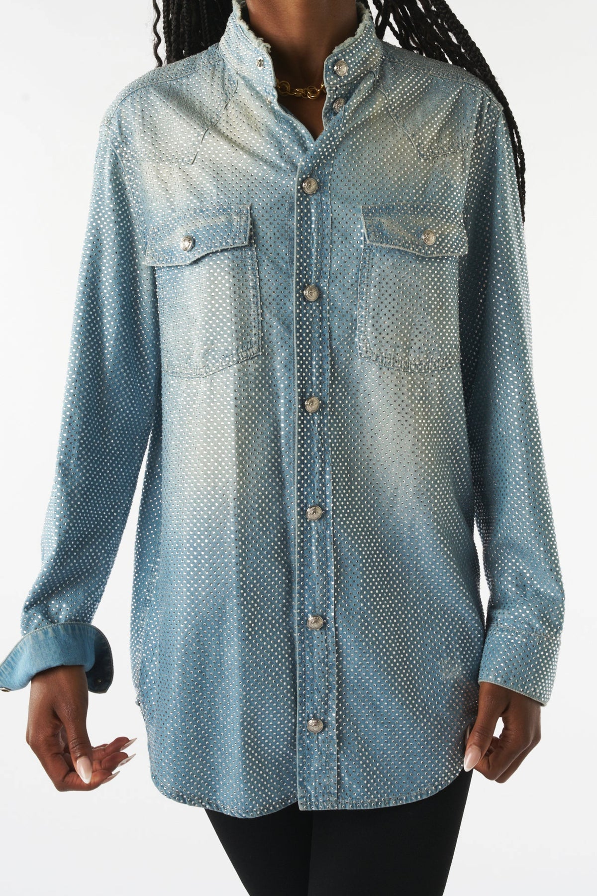 BALMAIN crystals embellished all over distressed denim shirt size 36 oversized