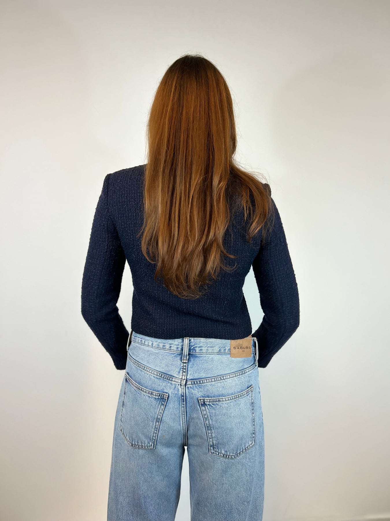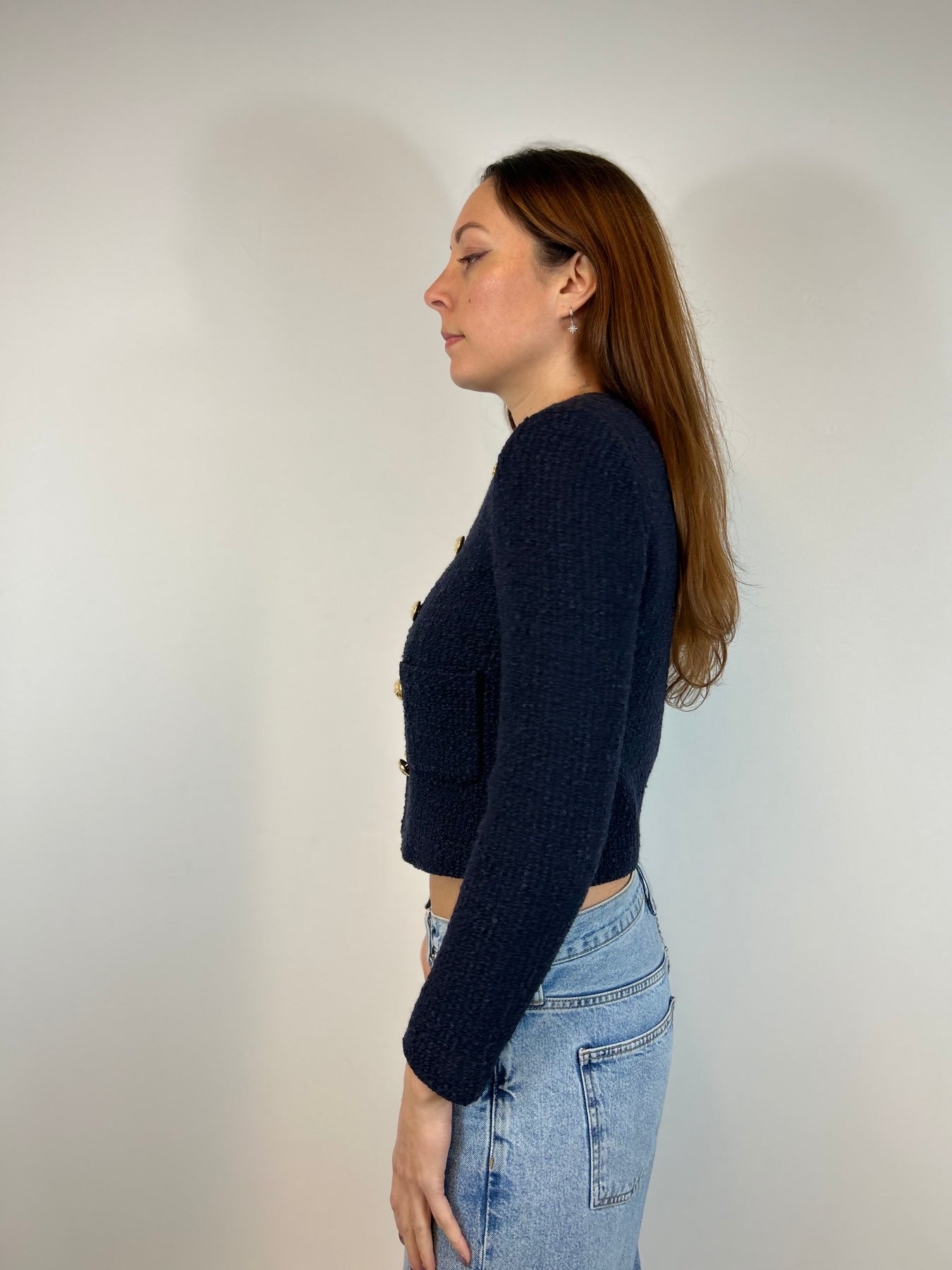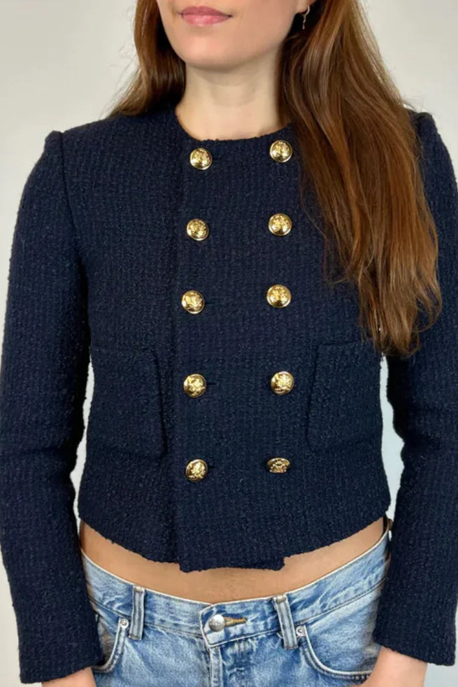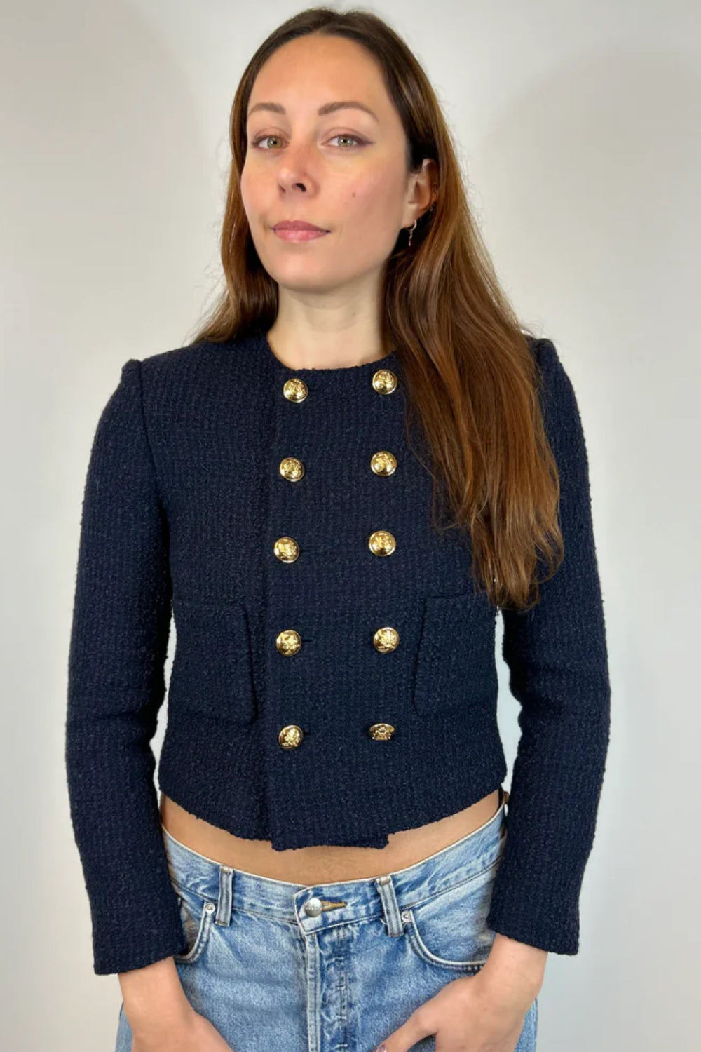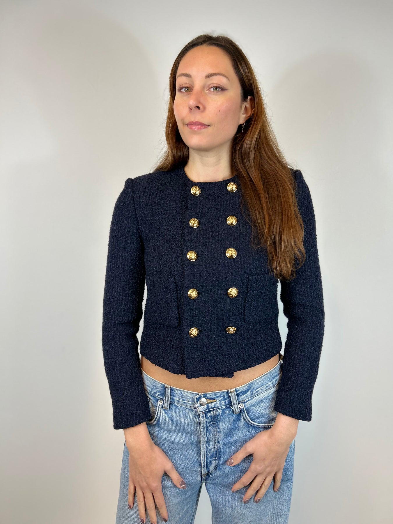 A beautiful short double breasted jacket made by CELINE featuring gold signature coat of arm buttons at the front and cuffs. Easy to dress up with scarves and accessories, or down with jeans, the light shimmering thread through it, the impeccable cut and gold buttons will automatically add elegance to any look.