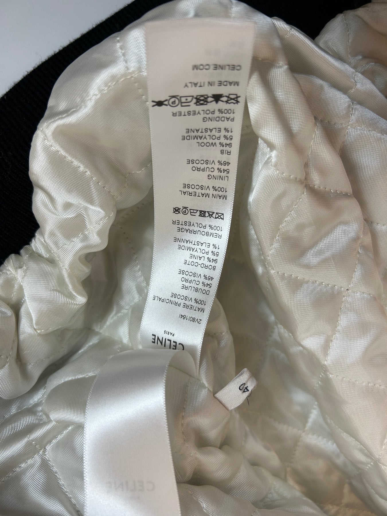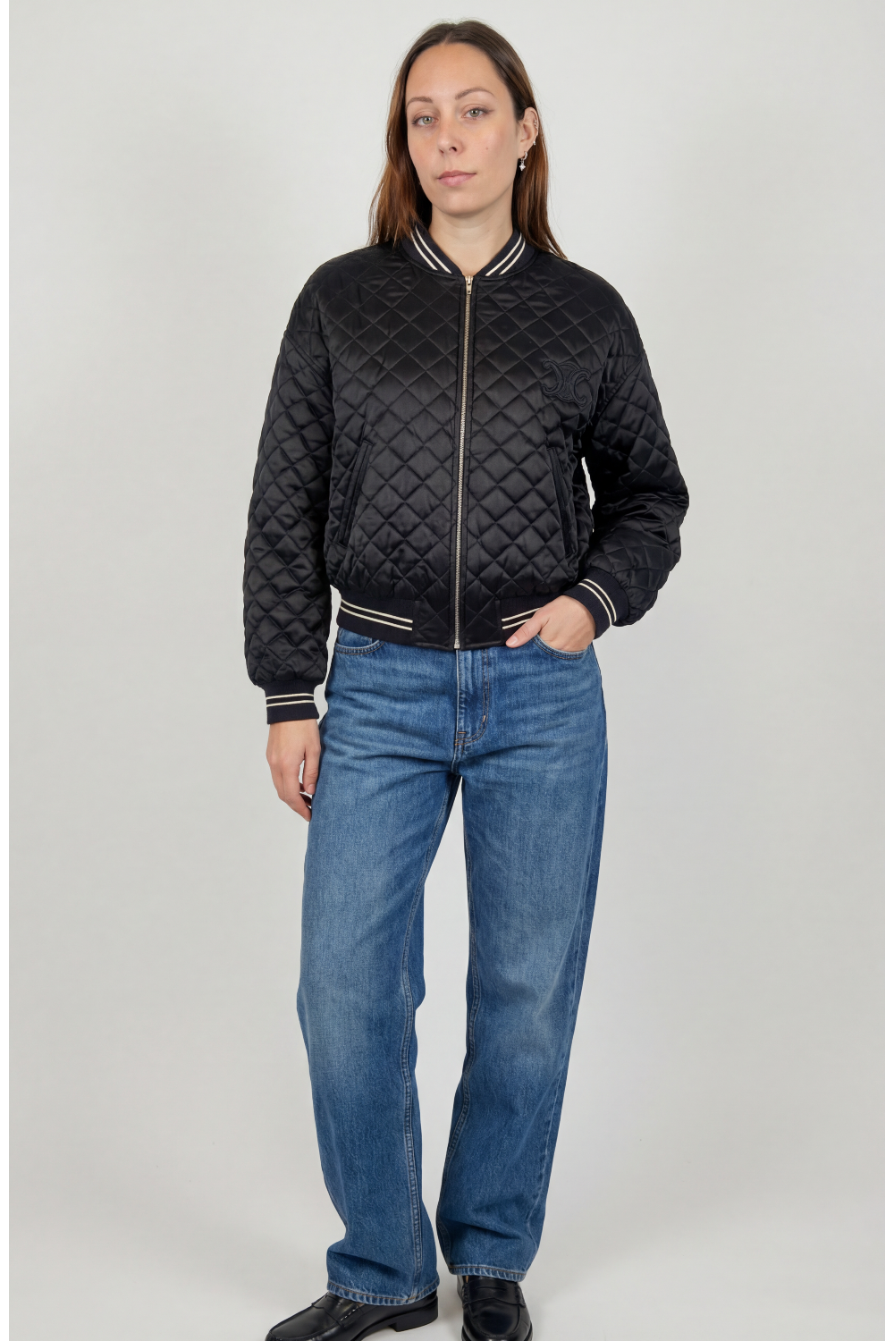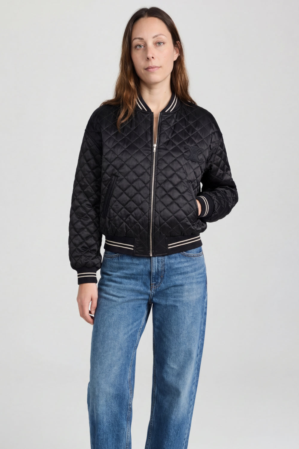 The French Luxury House of Celine surely knows how to execute effortless chic - This CELINE Bomber jacket features the iconic "Triomphe" logo and is made of a quilted fabric interior lining for optimal comfort. The contrasting black and white striped collar adds to the "American aesthetic" of the bomber jacket done with a satin-finished look. Wear with mini skirt, slim jeans or anything you already own.