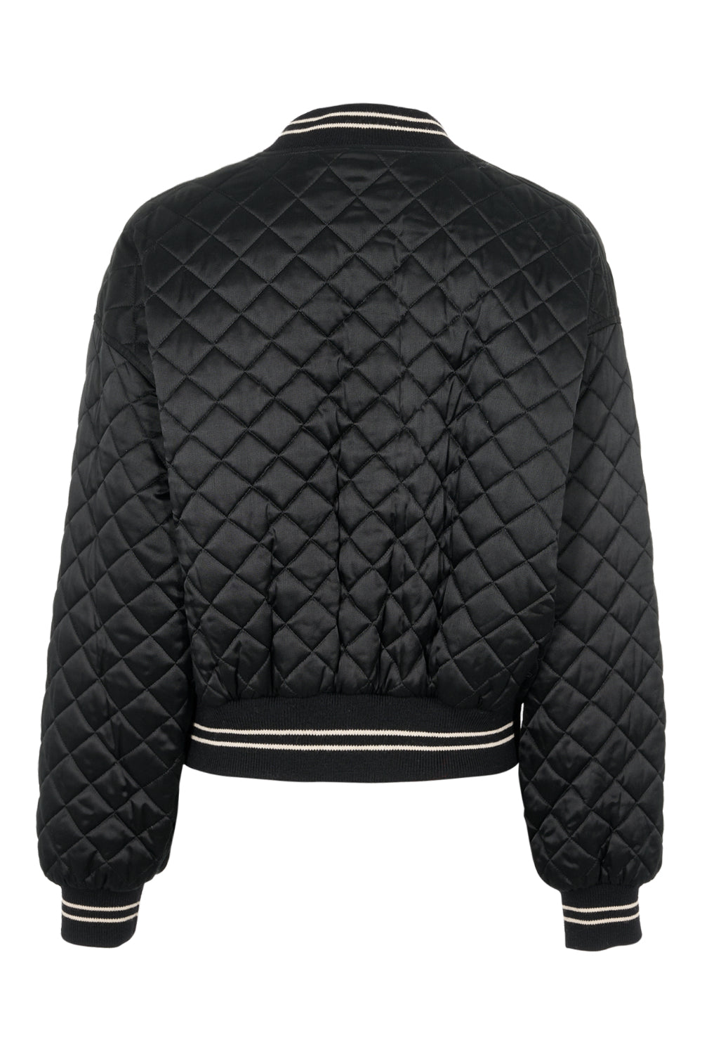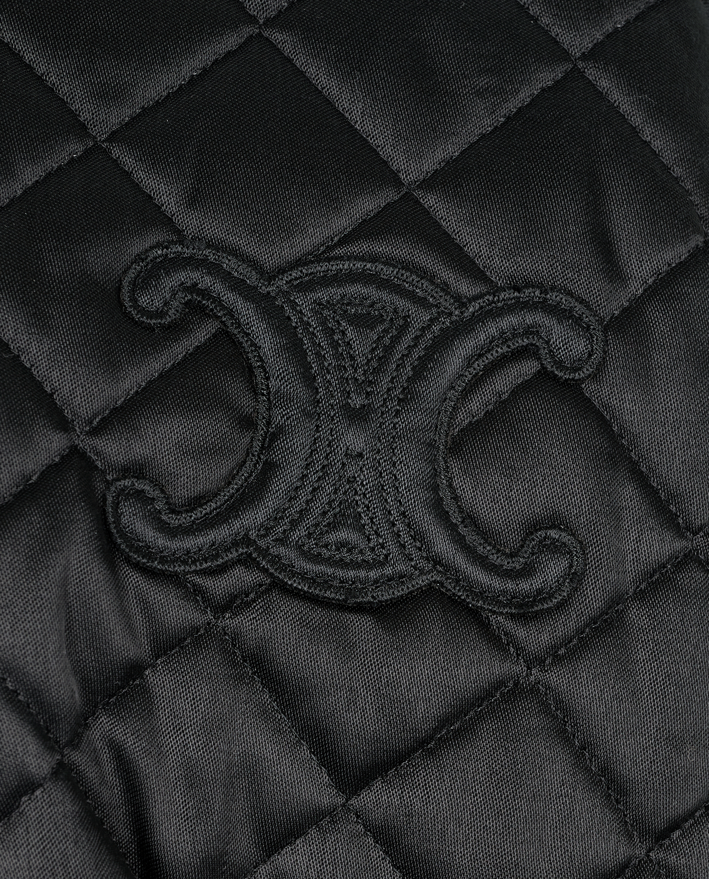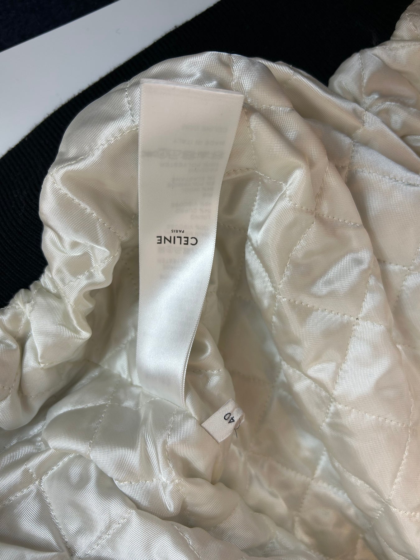 The French Luxury House of Celine surely knows how to execute effortless chic - This CELINE Bomber jacket features the iconic "Triomphe" logo and is made of a quilted fabric interior lining for optimal comfort. The contrasting black and white striped collar adds to the "American aesthetic" of the bomber jacket done with a satin-finished look. Wear with mini skirt, slim jeans or anything you already own.