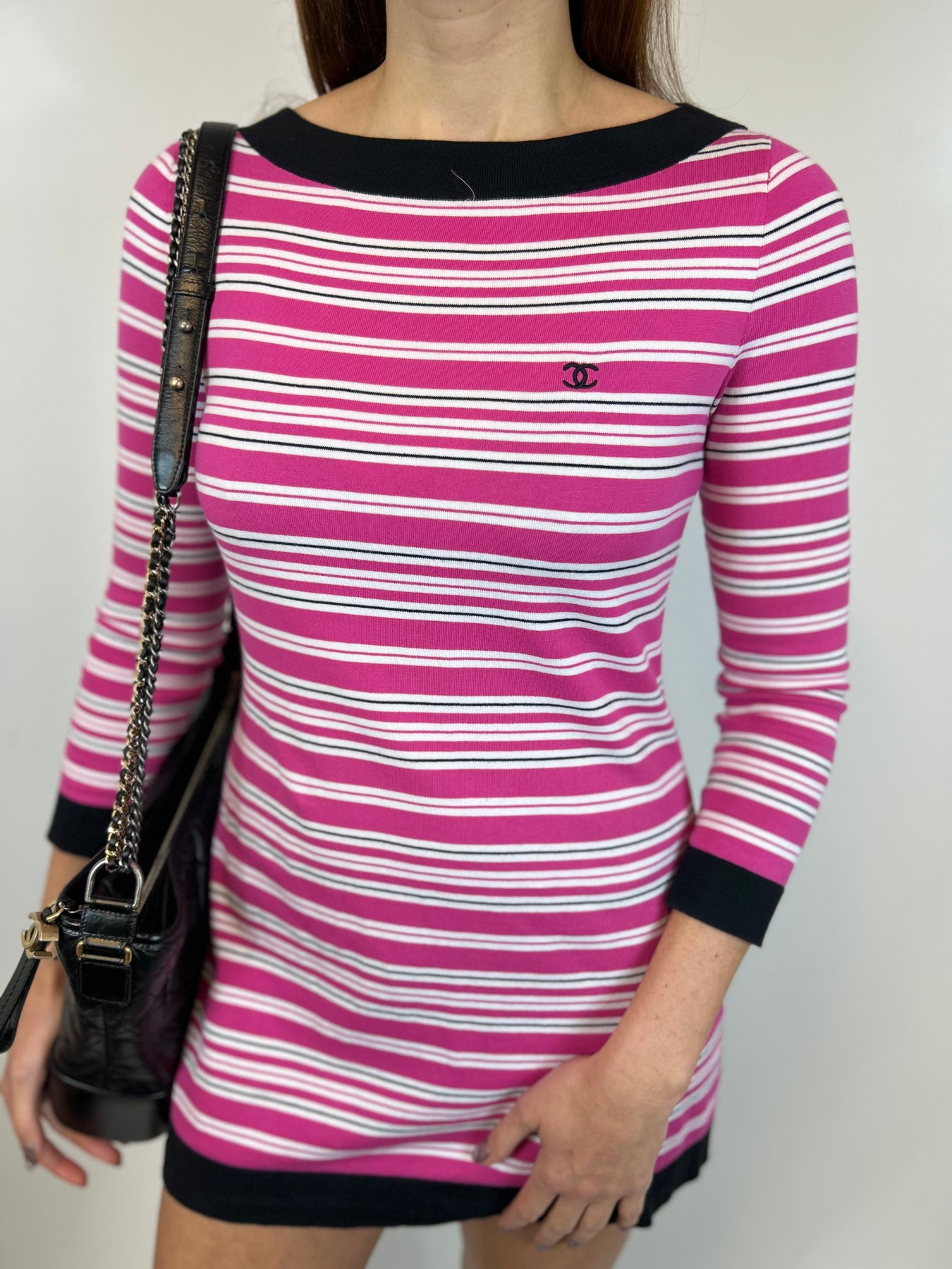 Shop this little CHANEL cotton dress! With Pink, Black and White striped amde of a soft cotton, this mini dress is as comfortable as a caress and will look pretty with any of your outfits whether you choose to wear it with trousers underneath, sandals or boots. It first appeared on the Chanel 2007 spring summer runway by Karl Lagerfeld and remains iconic with its black contrasting CC logo embroidery at the front.