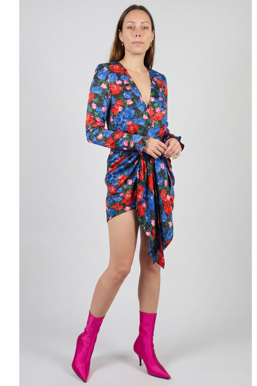 Shop this stunning MAGDA BUTRYM Floral print dress, it features a low neckline and beautiful drape around the waist. Mini length- Perfect for daytime with boots or evening with heels.