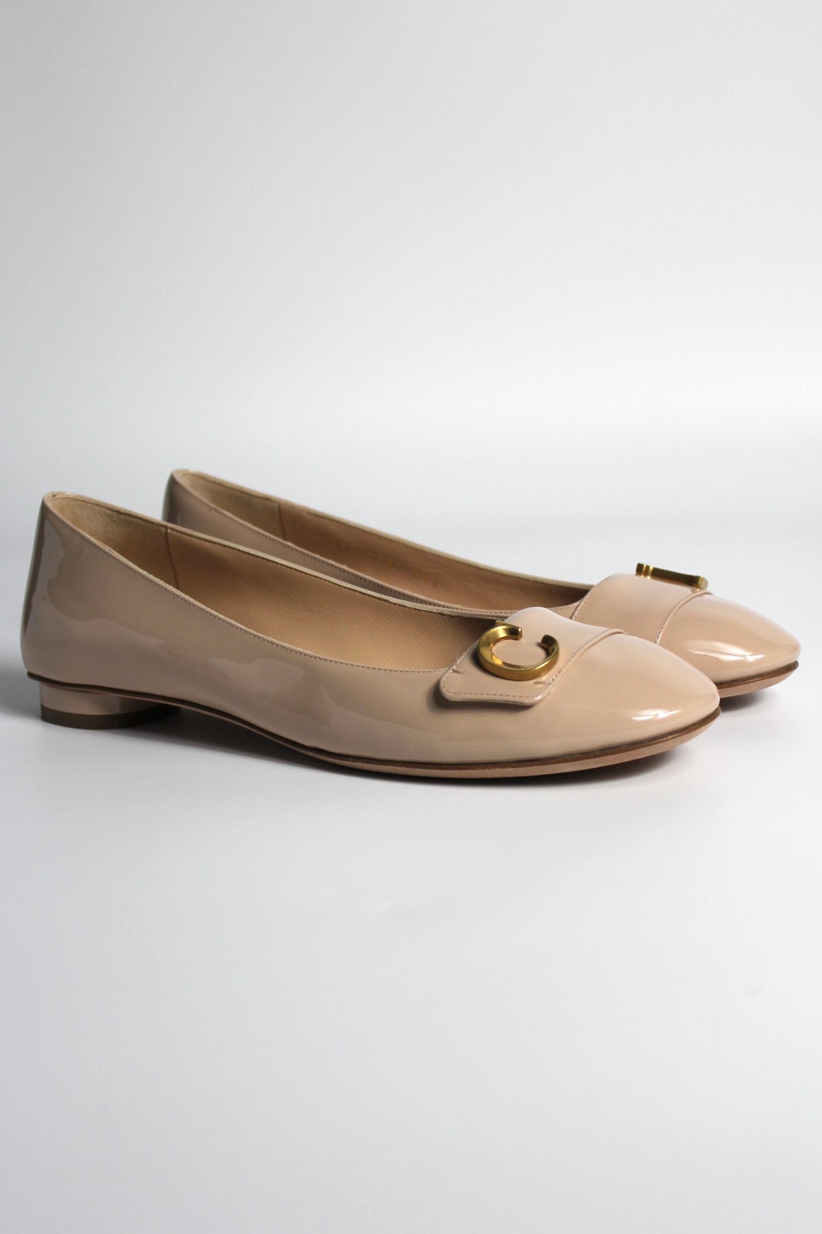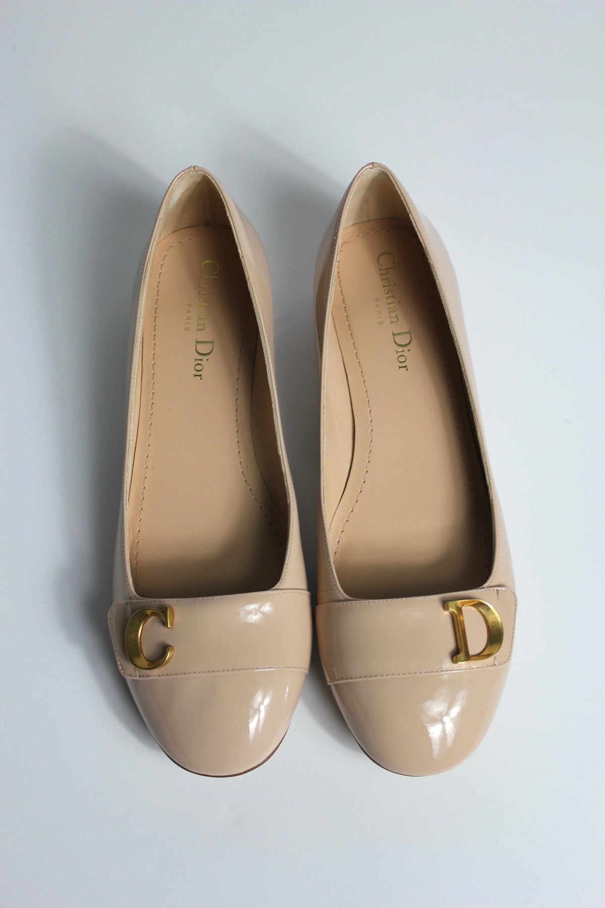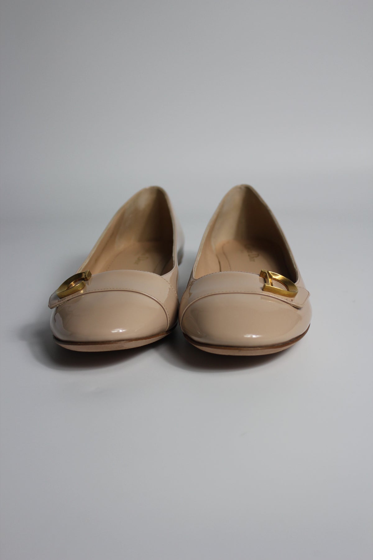CHRISTIAN DIOR "C'est Dior" Patent Nude Ballet Flats with Antique Gold CD size 38.5 with box
