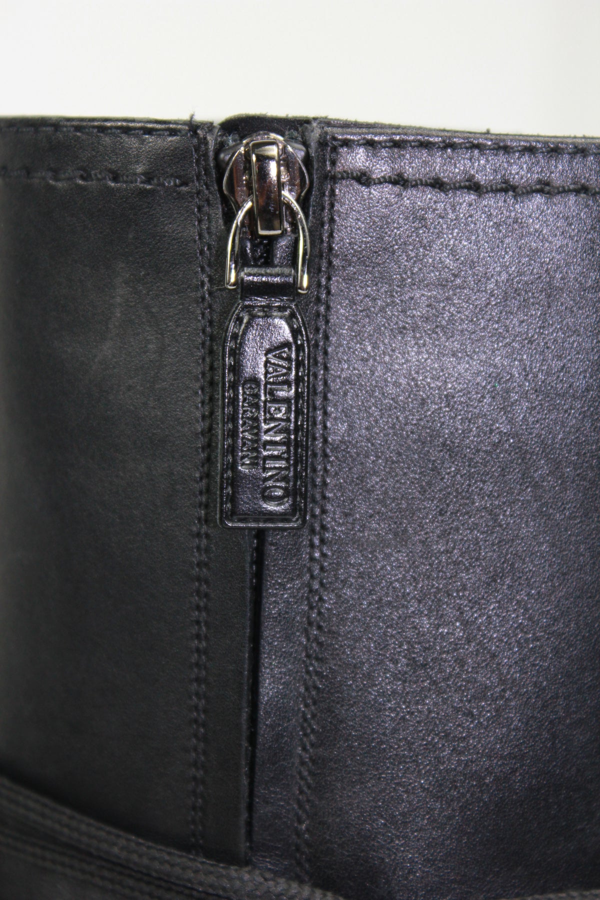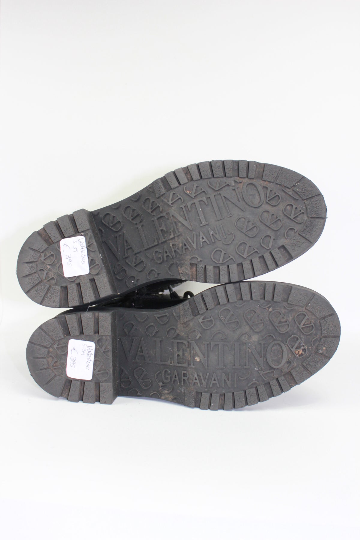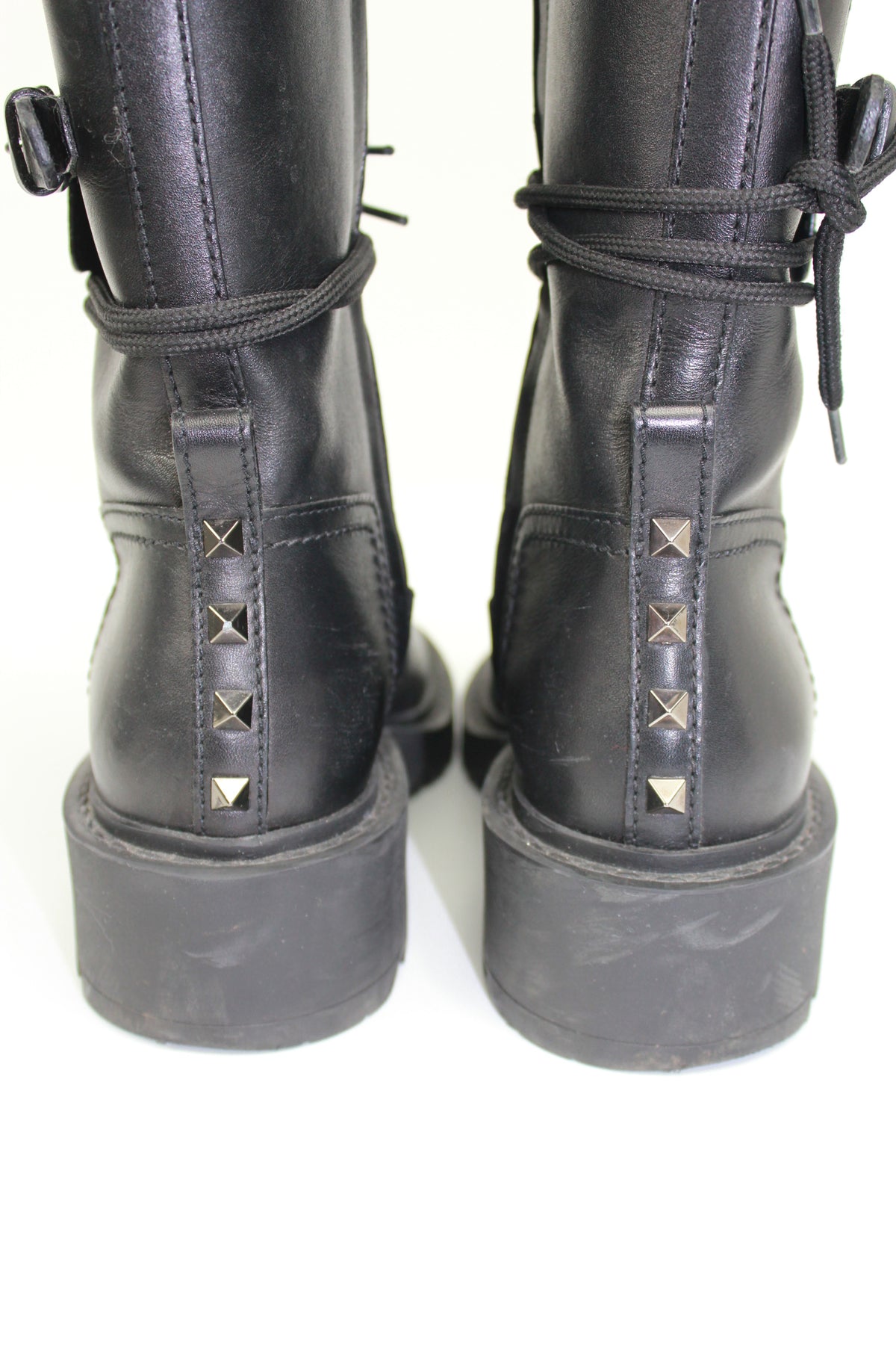 VALENTINO black smooth calfskin leather combat boots with silver signature studs, two straps and lace up.