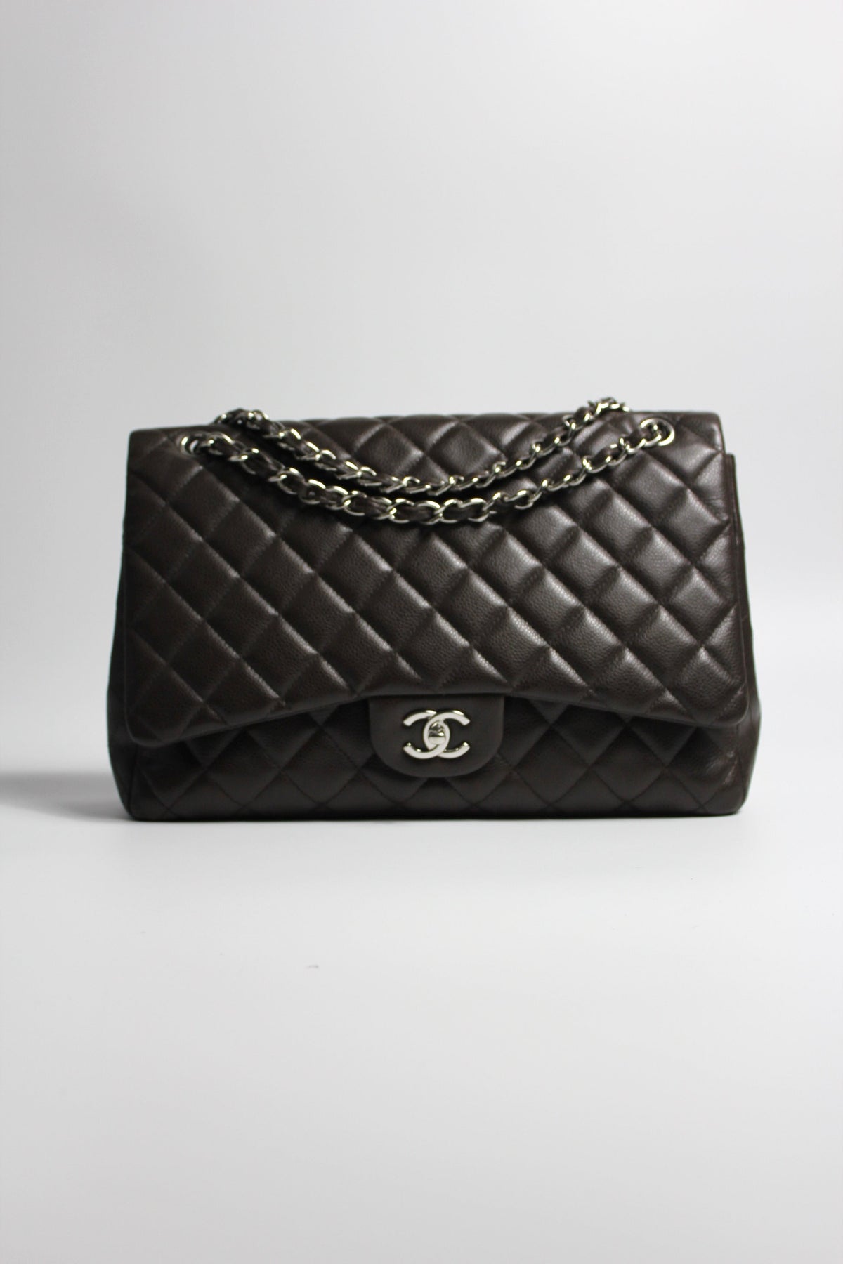 Shop this beautifully made CHANEL handbag crafted from an espresso brown durable caviar leather and paired elegantly with silver hardware in the maxi size, the biggest of the classic family, and get ready to turn heads whenever you carry it. No longer produced in that color, the maxi currently retails at 11 700 euros at the French luxury house boutiques.