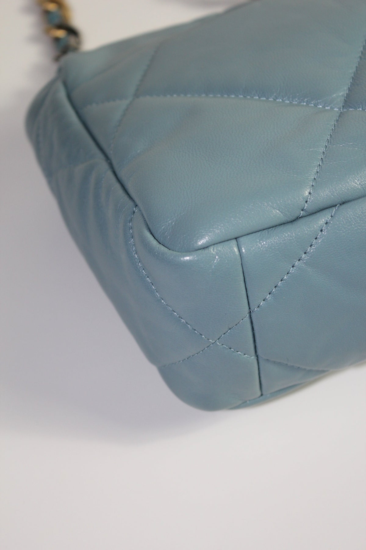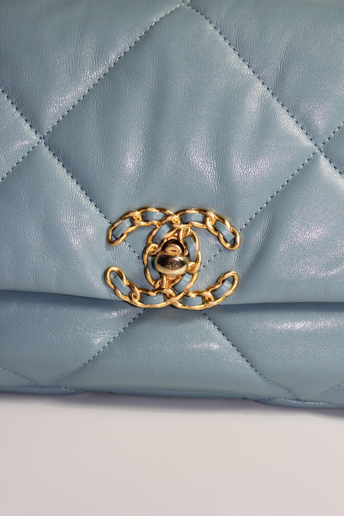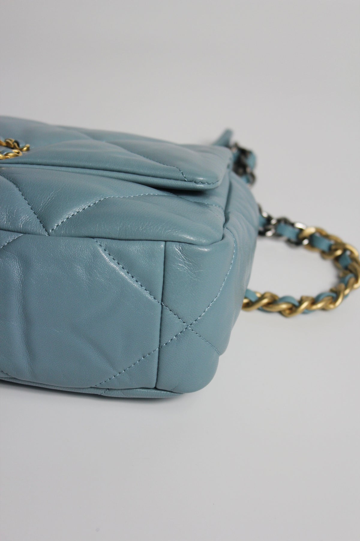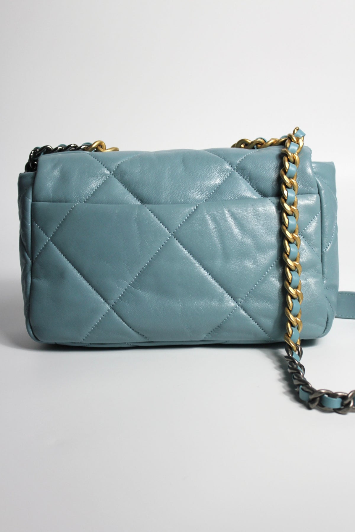 The CHANEL 19 small leather handbag is a great choice for day to evening with its short chain handle to carry by hand or long chain strap to wear crossbody. Spacious enough to carry all essentials, it is made in a stormy blue with grey hues soft lambskin leather paired with tri-color hardware. Gold, ruthenium and silver. Introduced in 2019, the 19 handbag was an instant hit and quickly become a new permanent of the French luxury house with a price yearly price increase. It is reminiscing of the Boy bag with its chunky chain and features large diamond quilted stitching with a classic intertwined cc turnlock closure.