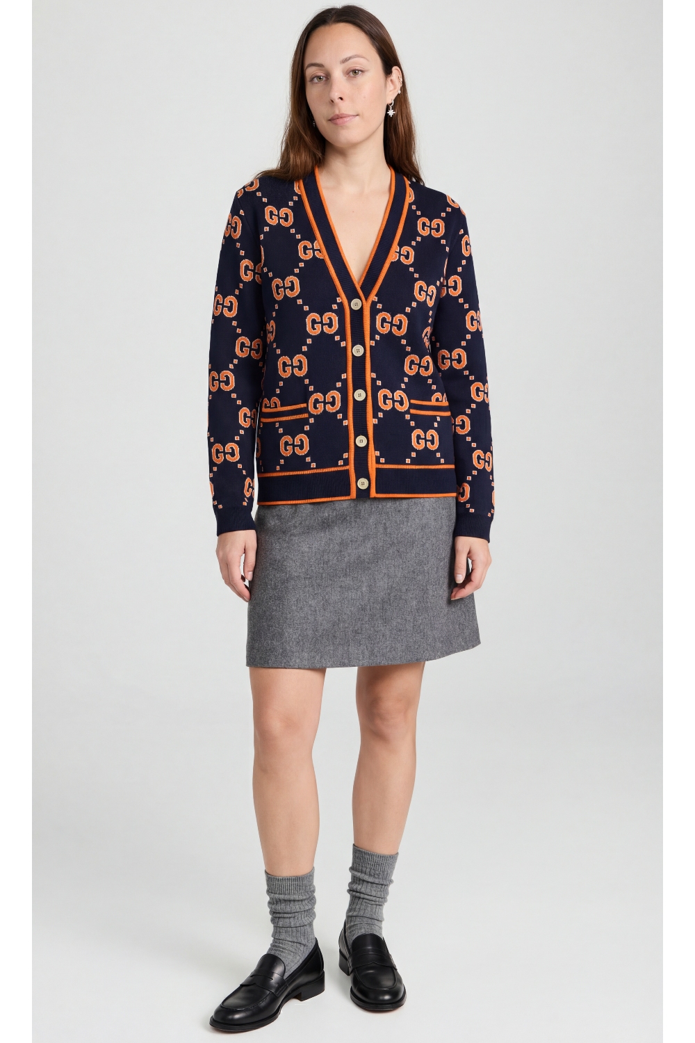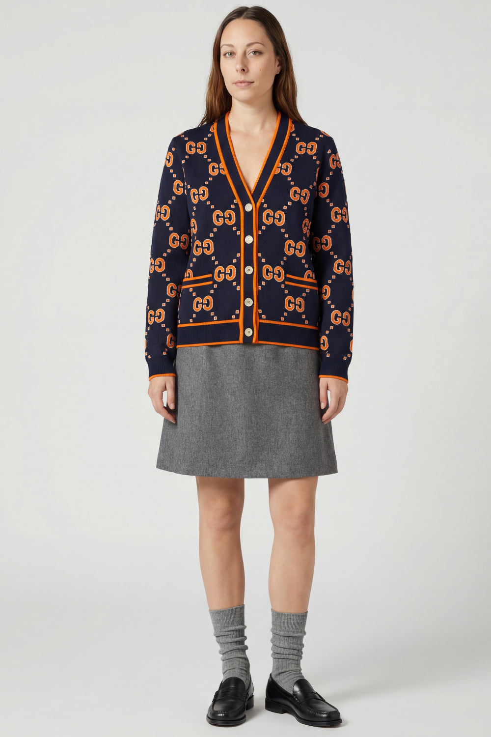 Shop this beautiful GUCCI cardigan with its classic silhouette and eclectic knitted contrasting orange GG logo all over. Two front pockets, ribbed trims.