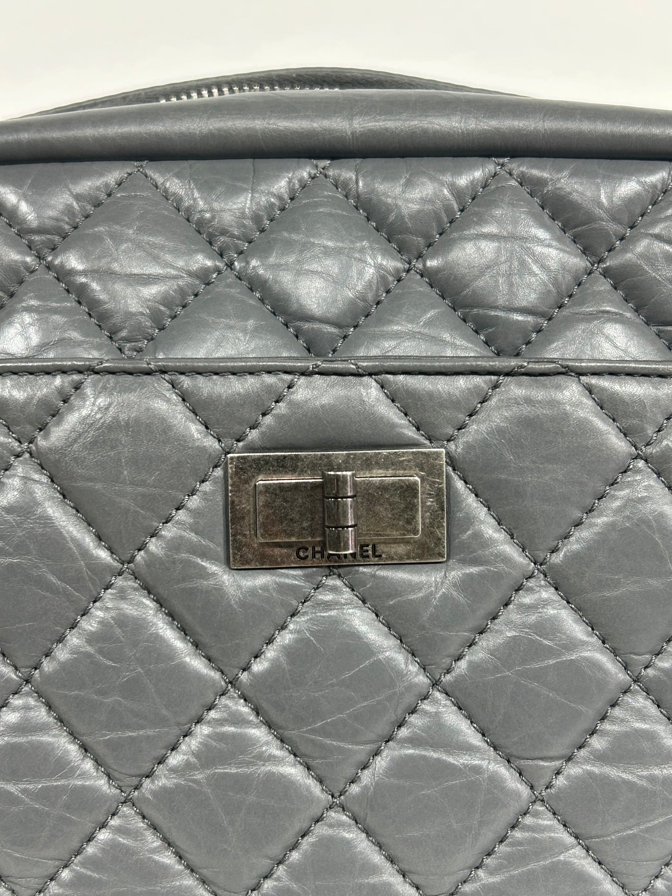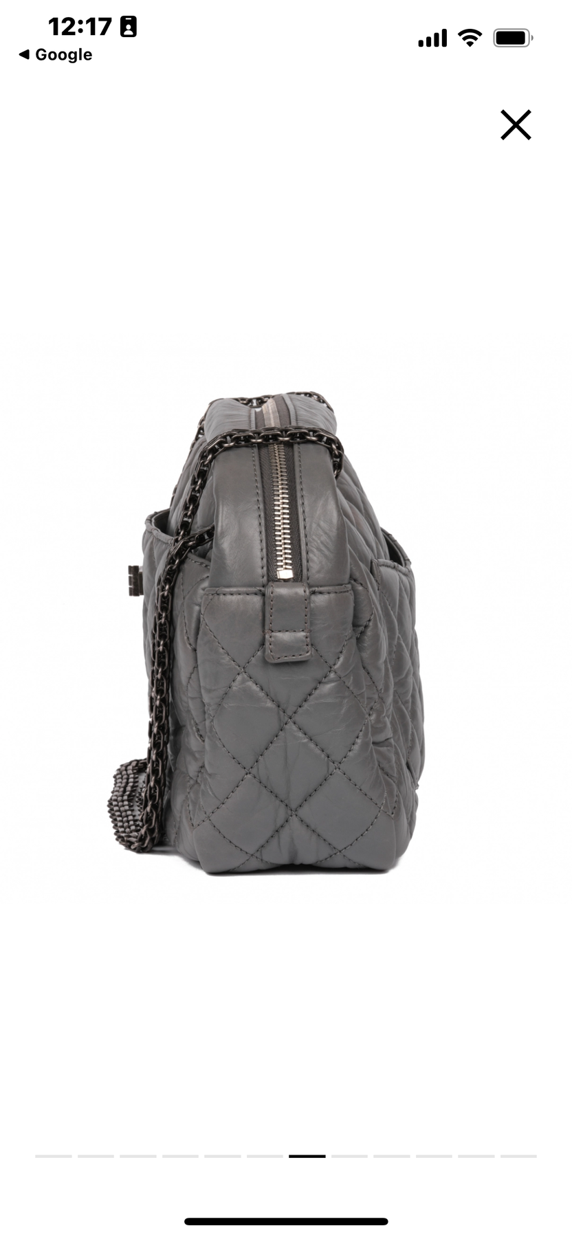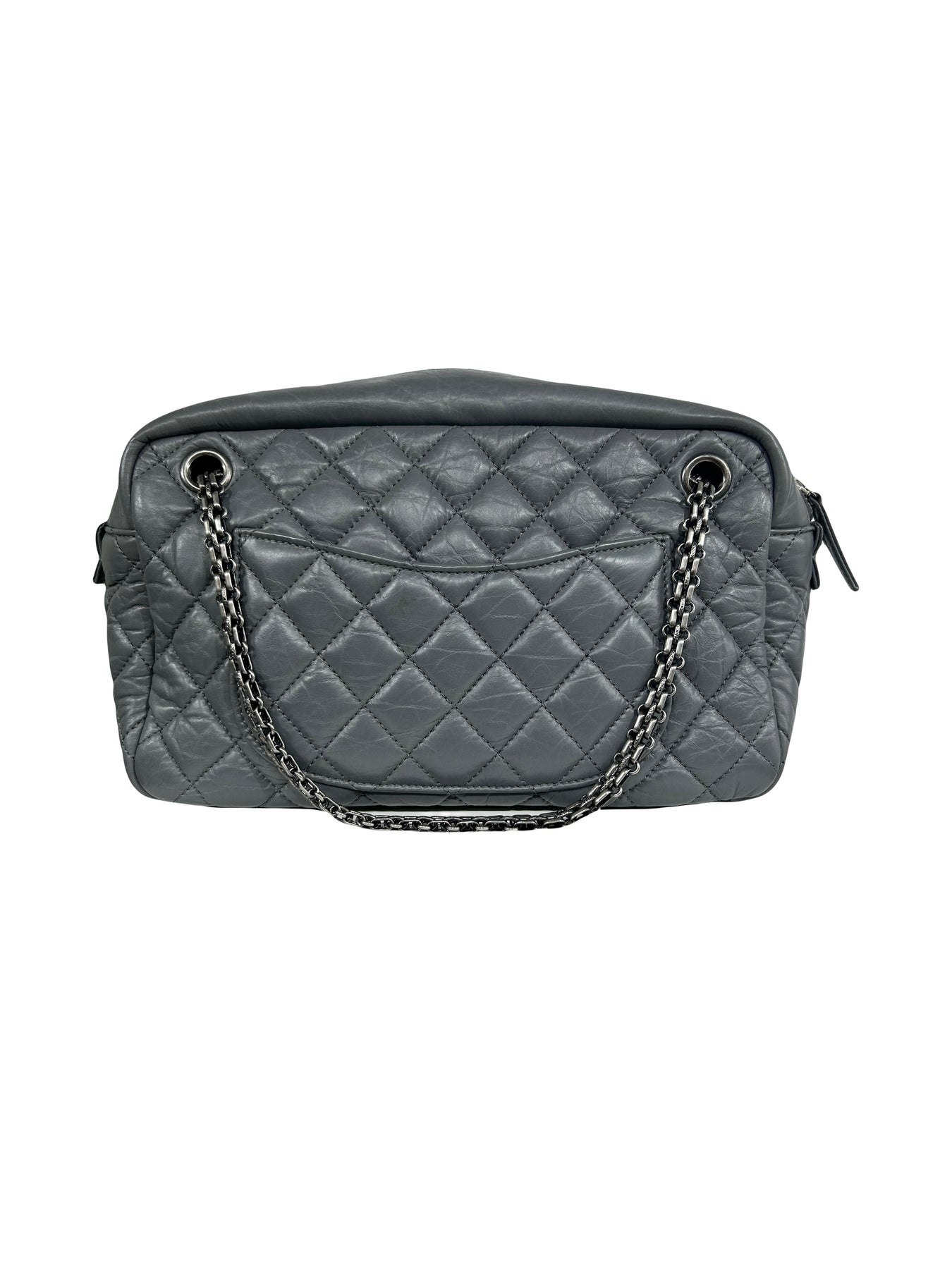 Shop this beautiful CHANEL camera handbag made of aged grey calfskin for stylish yet elegant look paired with ruthenium hardware. The bag features the 2:55 reissue turnlock and a long chain to wear crossbody or on shoulder. Slip pocket at the back and large interior to fit all essentials.