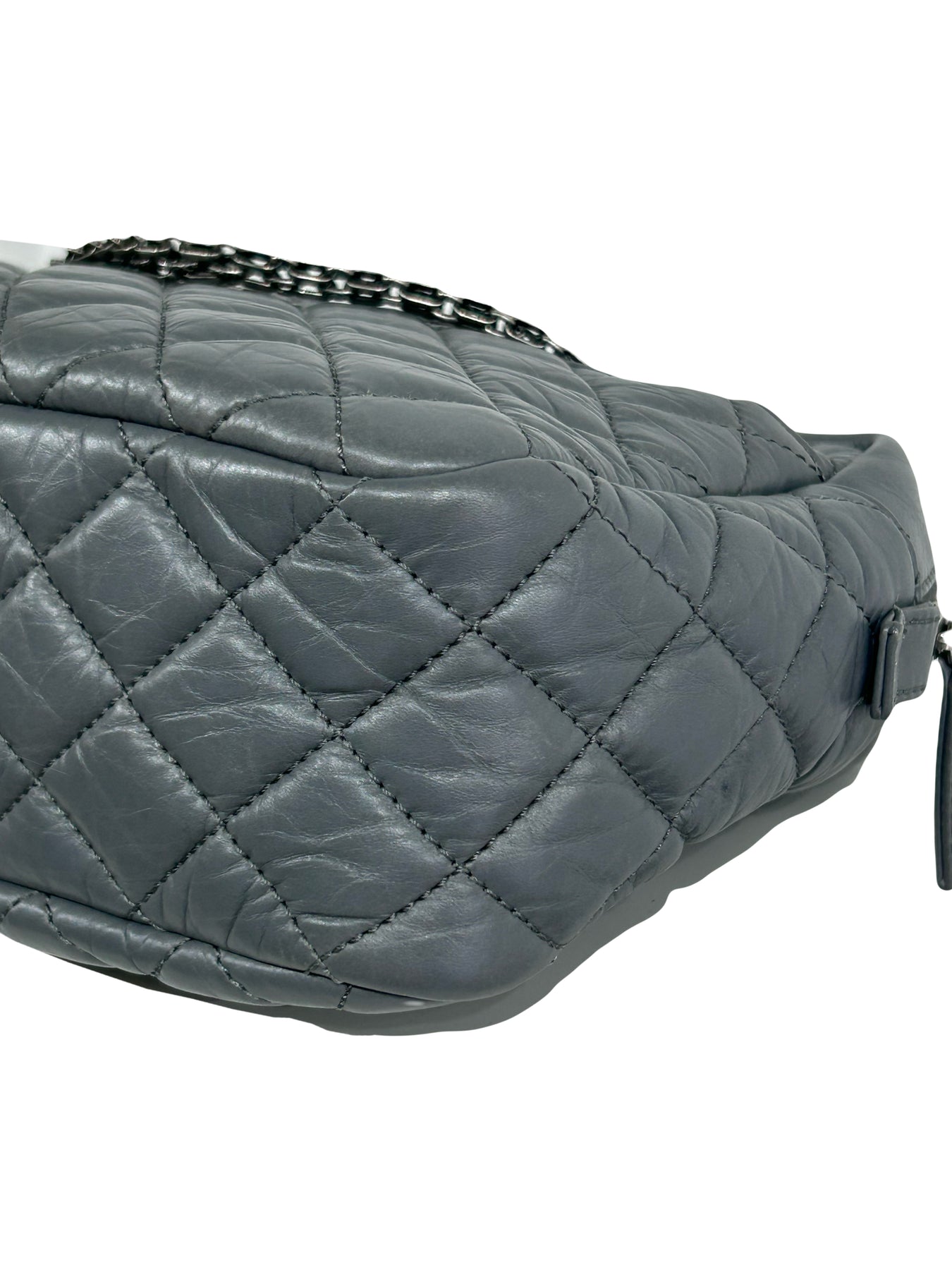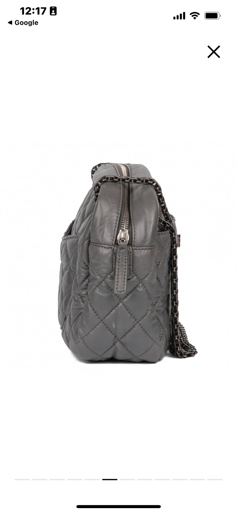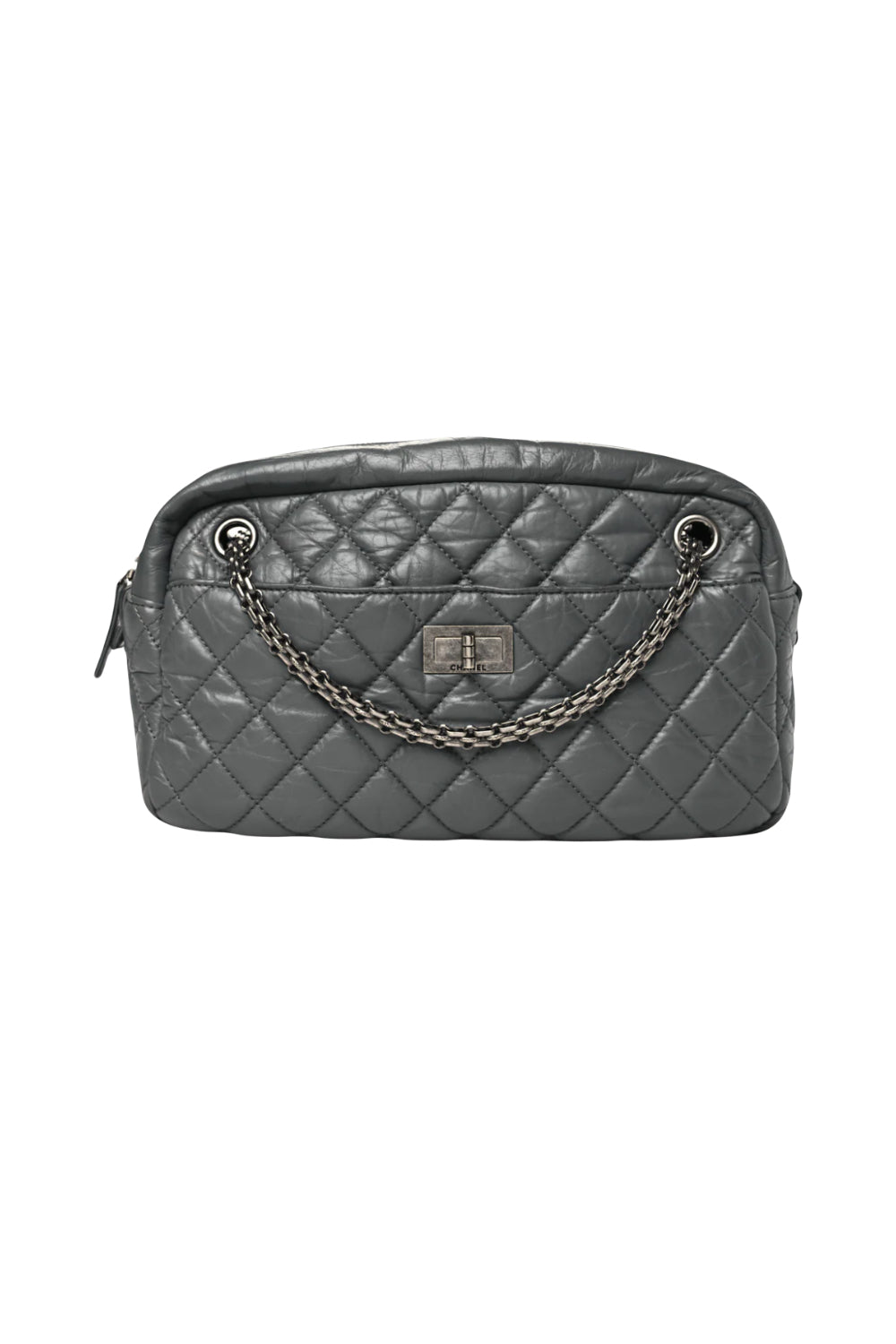 Shop this beautiful CHANEL camera handbag made of aged grey calfskin for stylish yet elegant look paired with ruthenium hardware. The bag features the 2:55 reissue turnlock and a long chain to wear crossbody or on shoulder. Slip pocket at the back and large interior to fit all essentials.