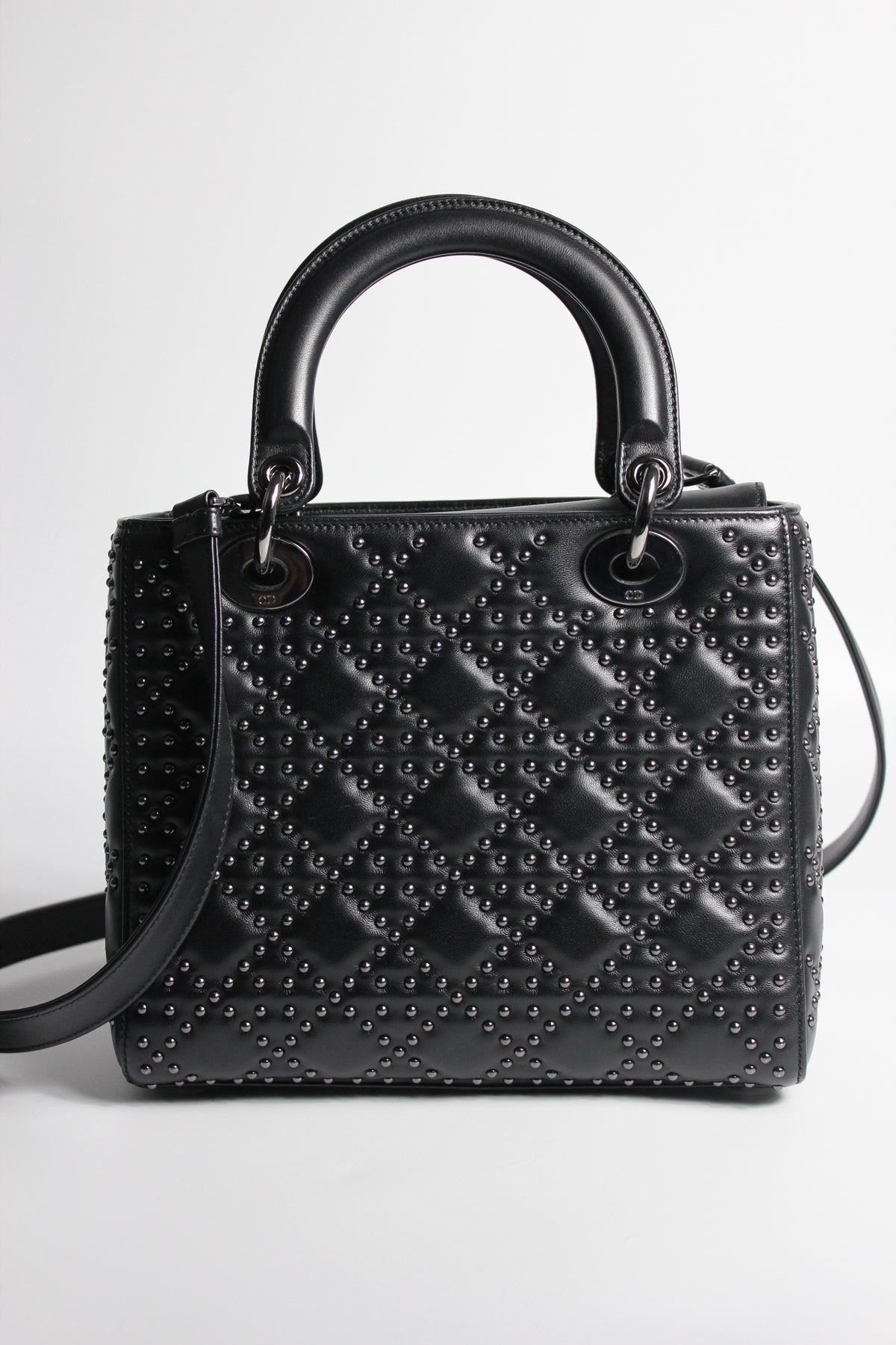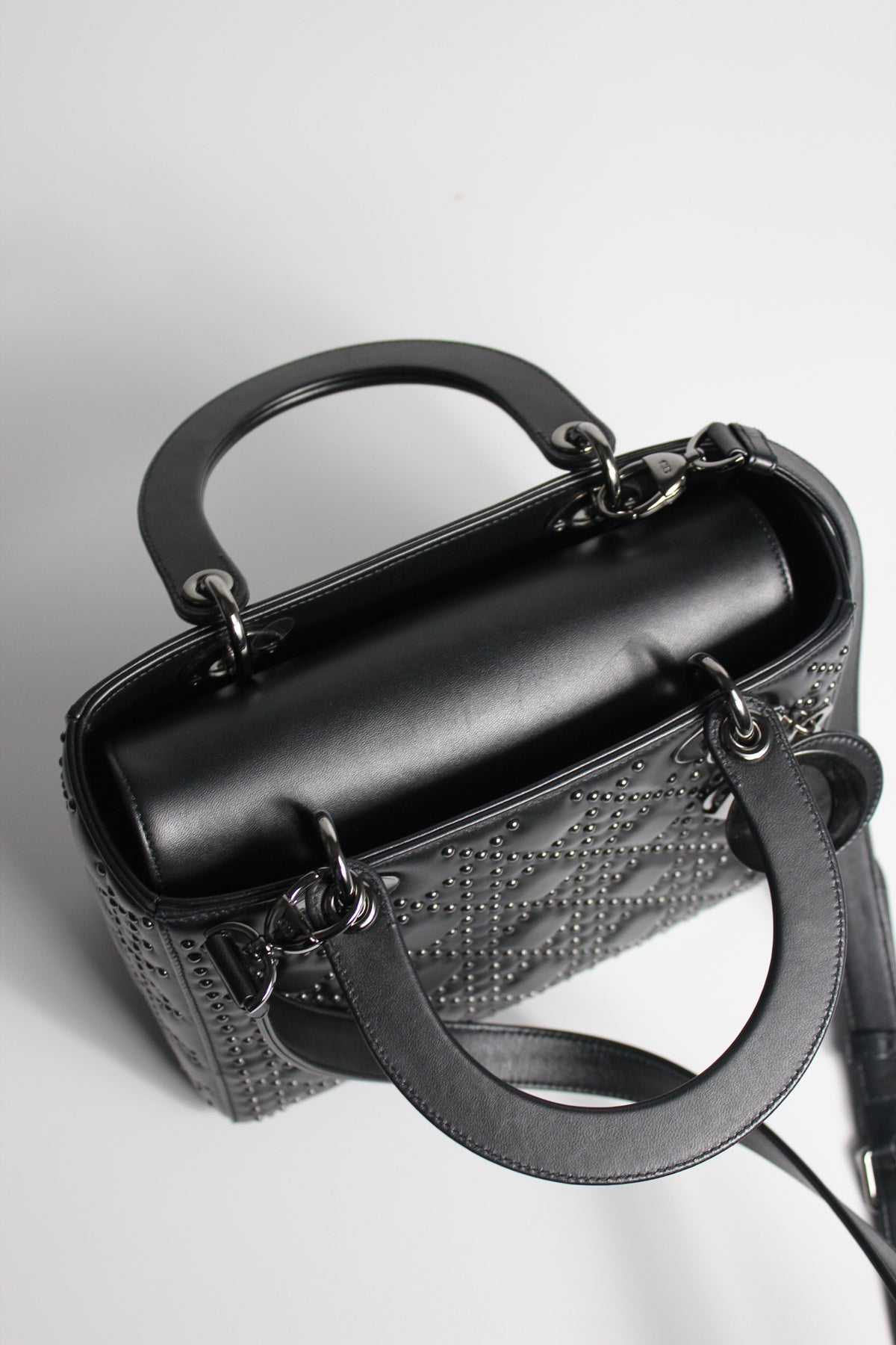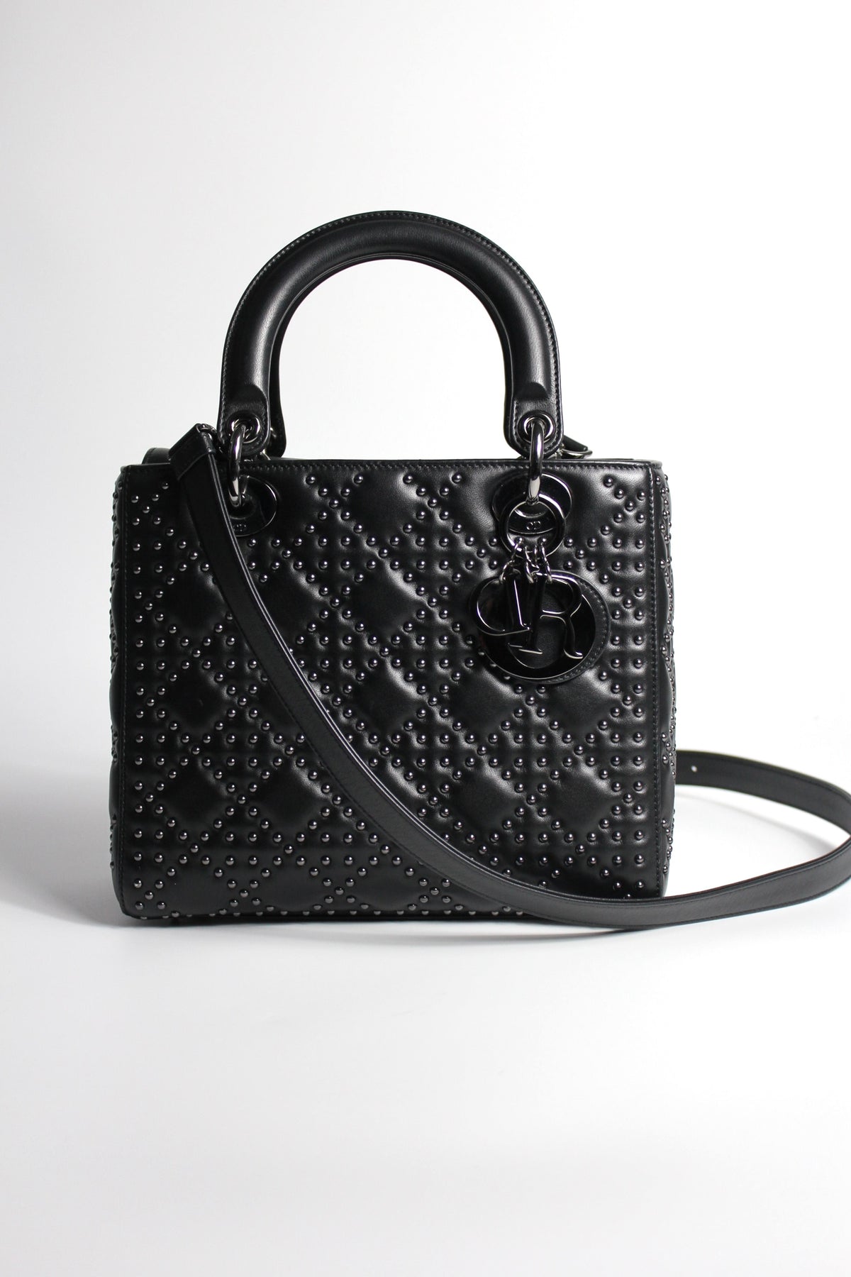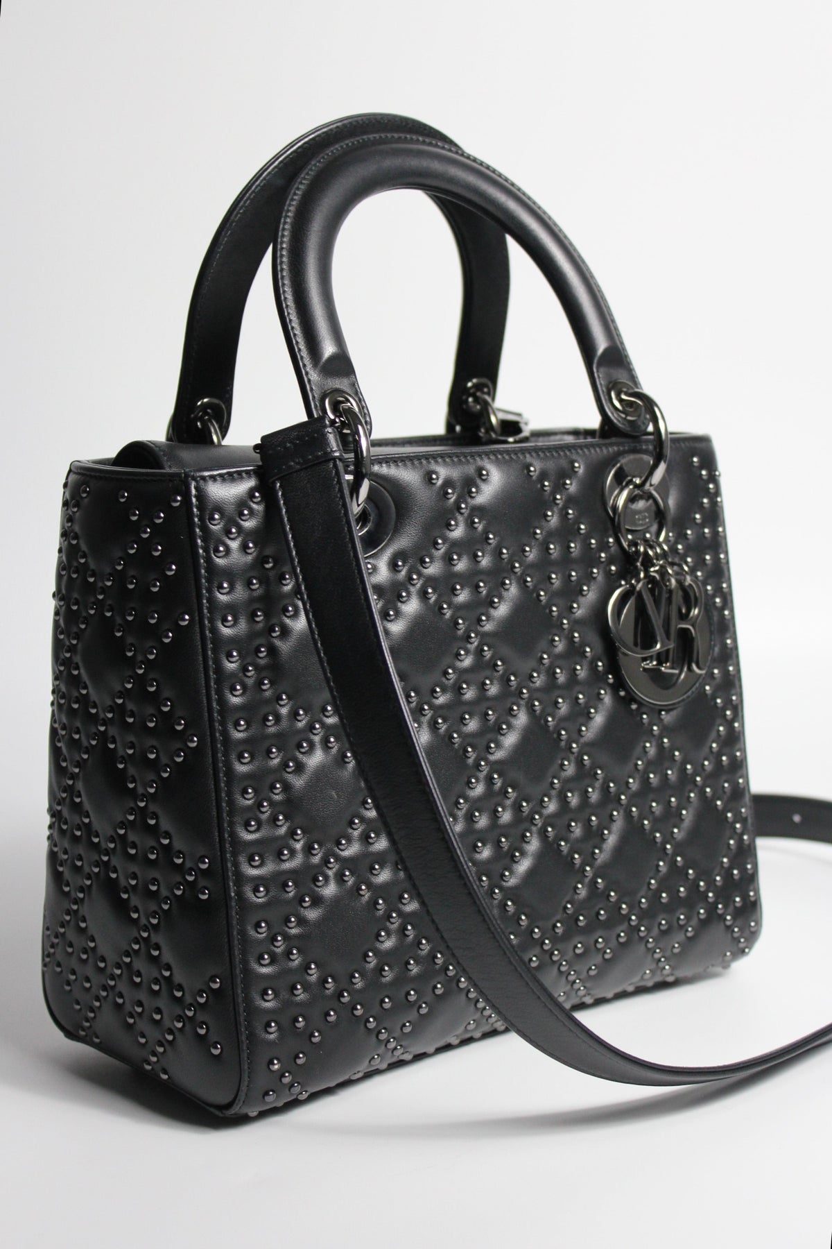 The iconic "Lady Dior" handbag was first introduced in 1994, by Gianfranco Ferre then-creative director at the helm of the French luxury house, and was originally named the "ChouChou". Gifted to the Princess of Wales in 1995,  she was so often photographed by the paparazzi with it, that the name changed to the "Lady Dior" bag. Since then the iconic handbag has been reinterred in many different leathers, colors and sizes. with the rarest ones fetching premium prices on the resell. This beautiful DIOR bag is part of the limited release presented in 2022, crafted from smooth black leather and covered with ruthenium lucky star studs all over, as well as a "DIOR" charms.