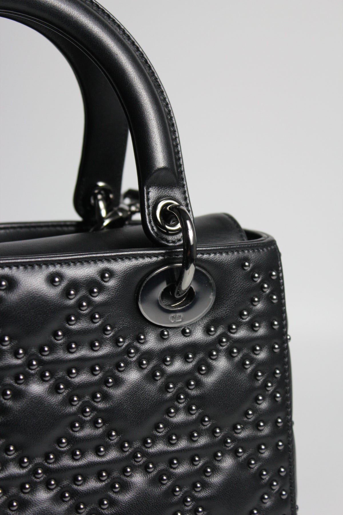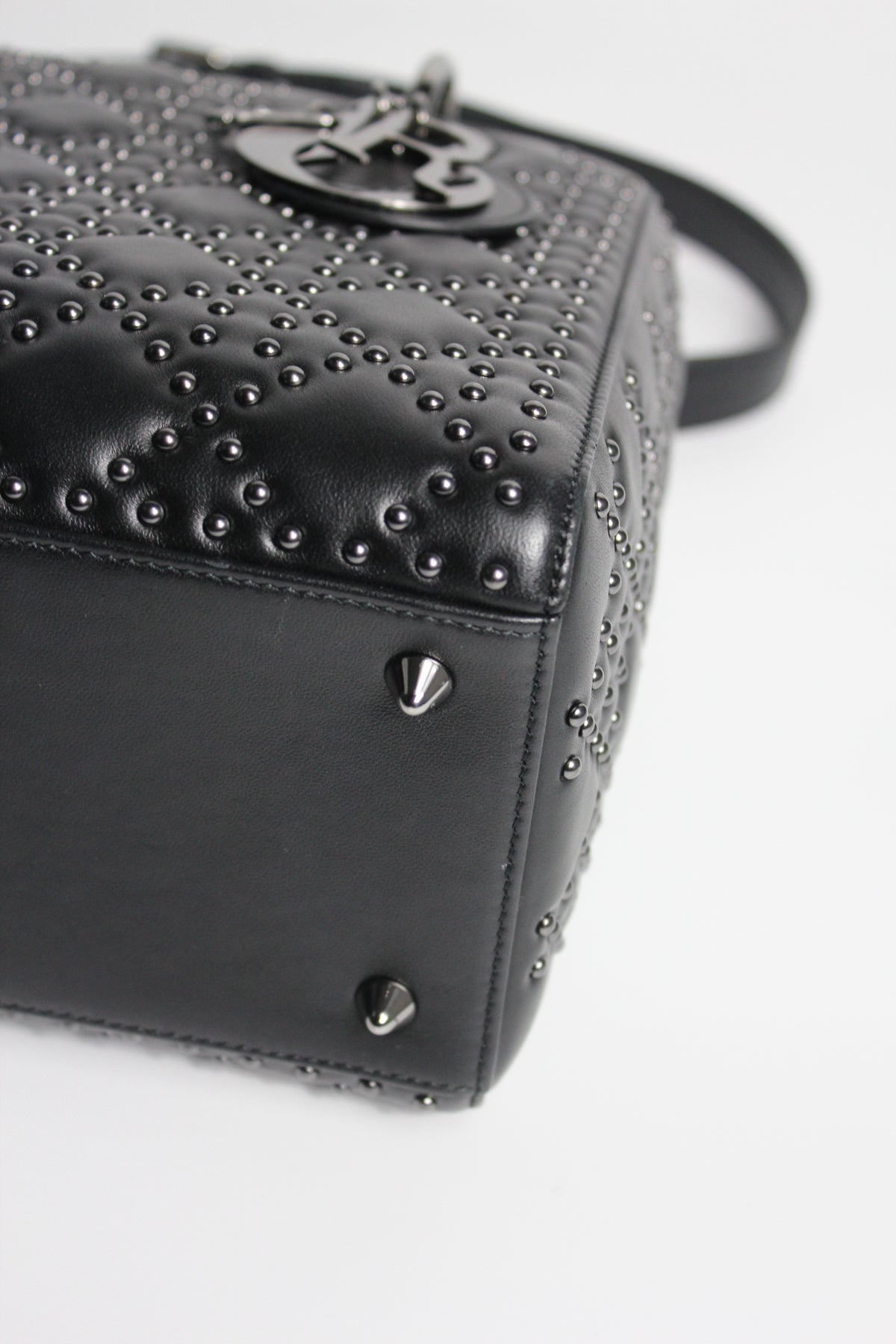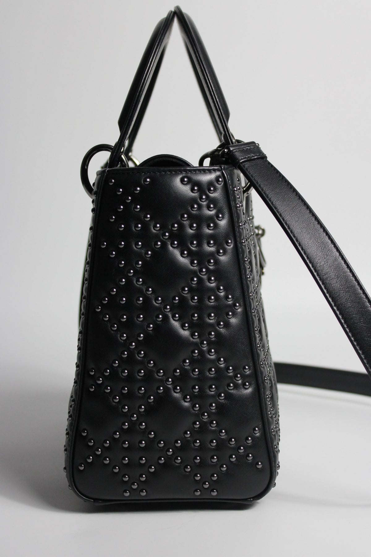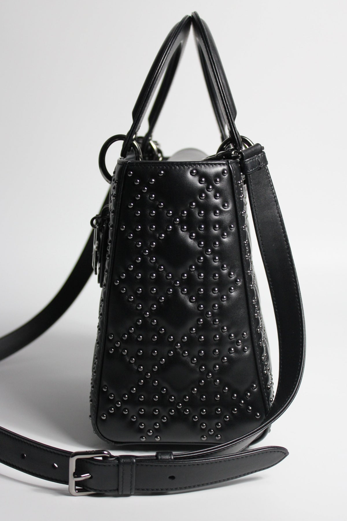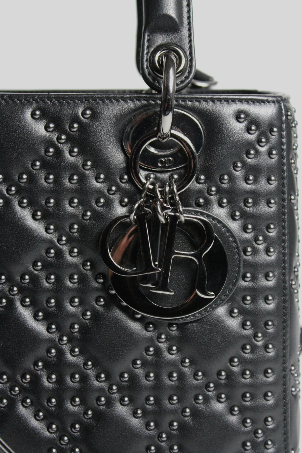 The iconic "Lady Dior" handbag was first introduced in 1994, by Gianfranco Ferre then-creative director at the helm of the French luxury house, and was originally named the "ChouChou". Gifted to the Princess of Wales in 1995,  she was so often photographed by the paparazzi with it, that the name changed to the "Lady Dior" bag. Since then the iconic handbag has been reinterred in many different leathers, colors and sizes. with the rarest ones fetching premium prices on the resell. This beautiful DIOR bag is part of the limited release presented in 2022, crafted from smooth black leather and covered with ruthenium lucky star studs all over, as well as a "DIOR" charms.