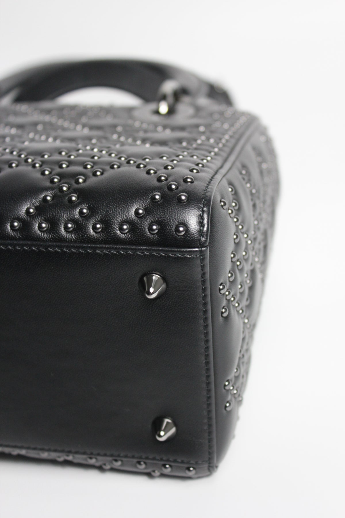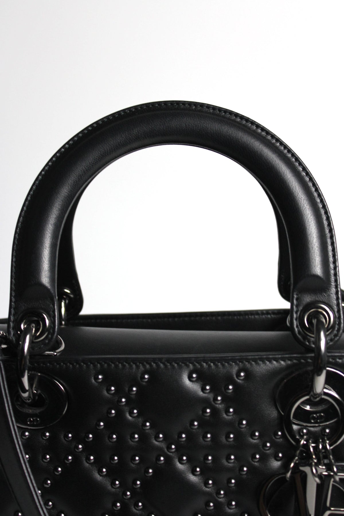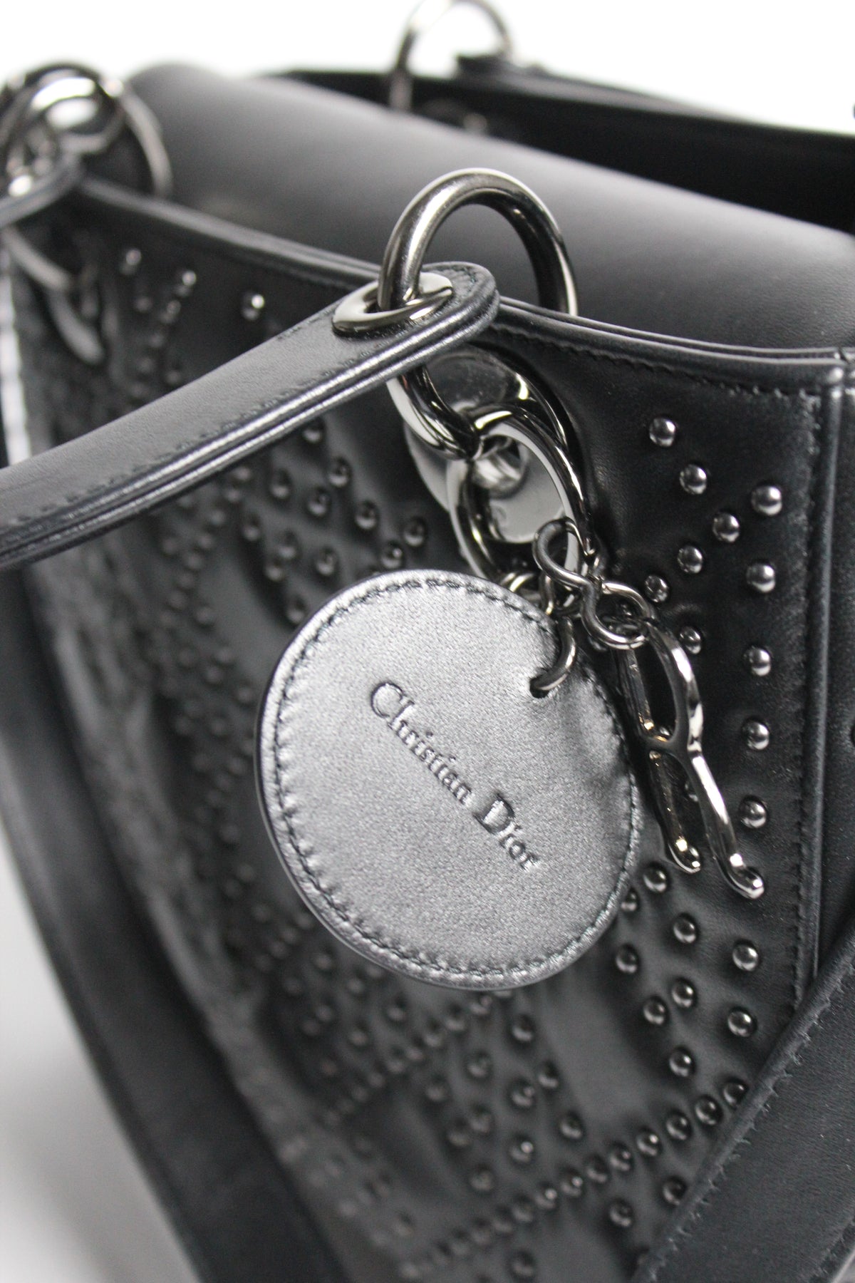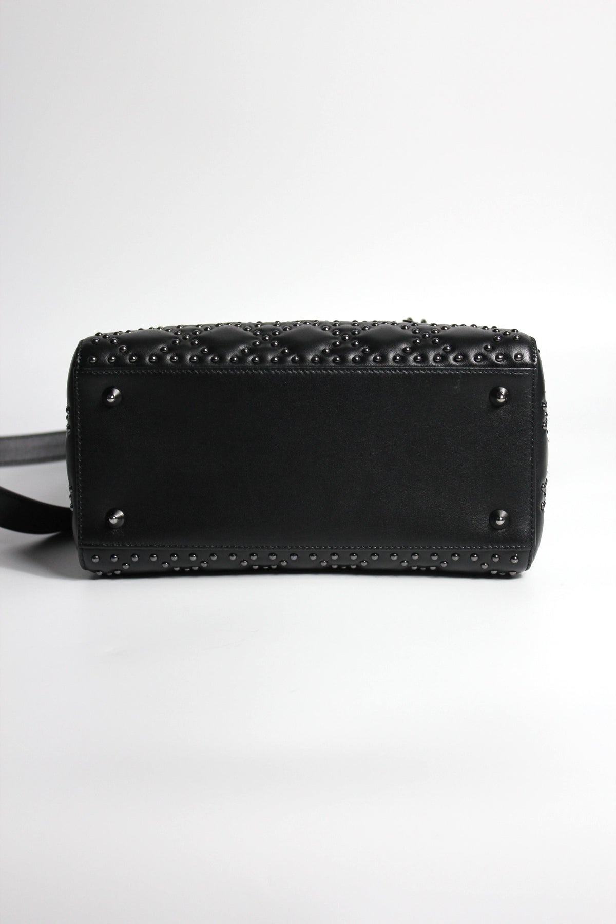 The iconic "Lady Dior" handbag was first introduced in 1994, by Gianfranco Ferre then-creative director at the helm of the French luxury house, and was originally named the "ChouChou". Gifted to the Princess of Wales in 1995,  she was so often photographed by the paparazzi with it, that the name changed to the "Lady Dior" bag. Since then the iconic handbag has been reinterred in many different leathers, colors and sizes. with the rarest ones fetching premium prices on the resell. This beautiful DIOR bag is part of the limited release presented in 2022, crafted from smooth black leather and covered with ruthenium lucky star studs all over, as well as a "DIOR" charms.