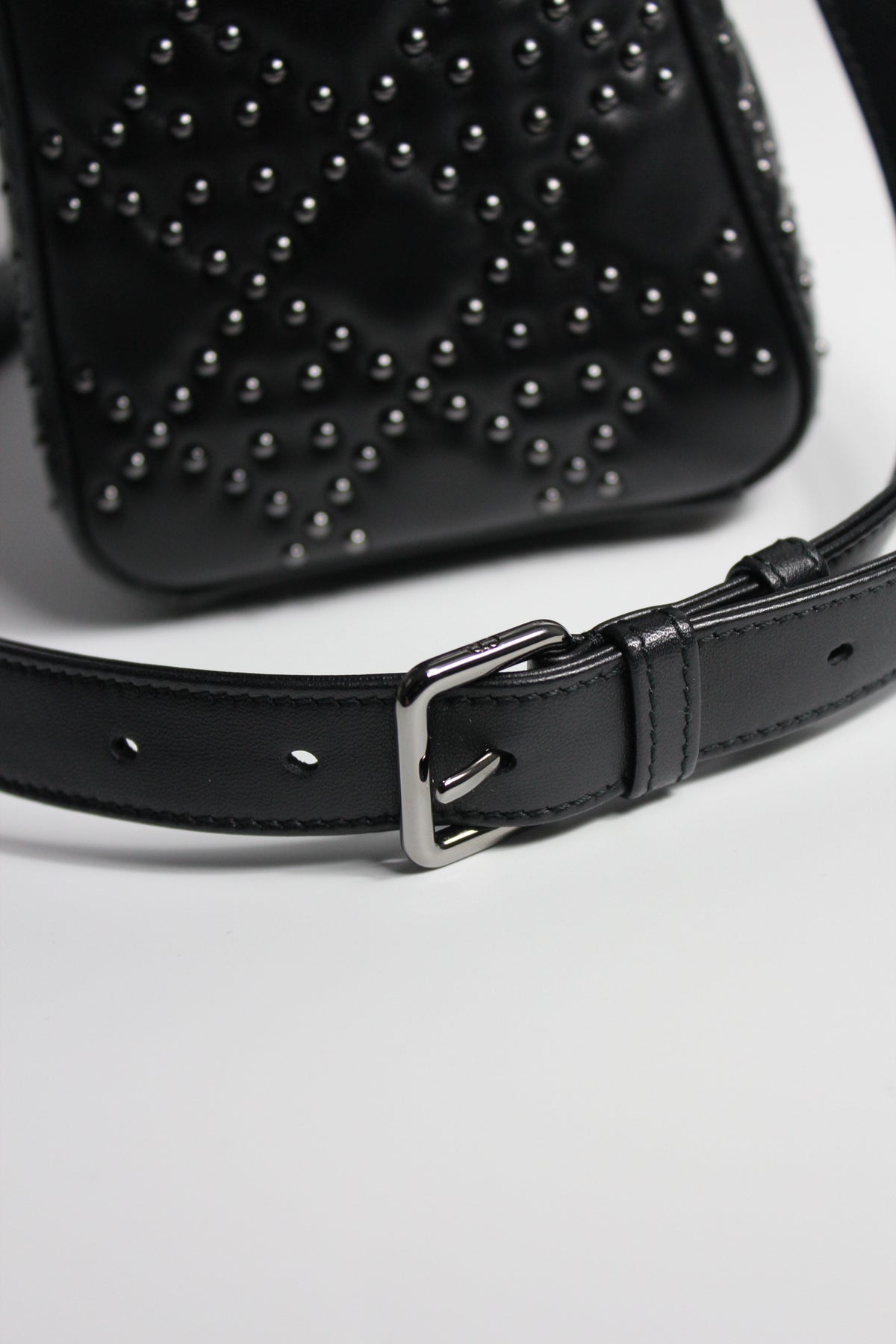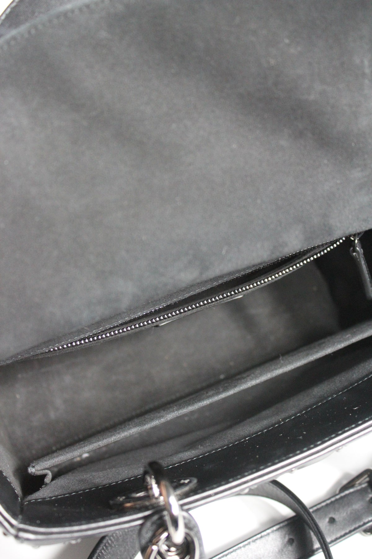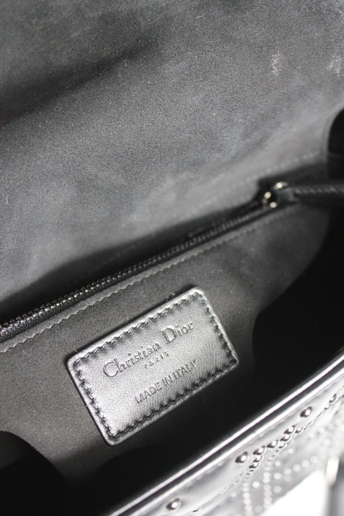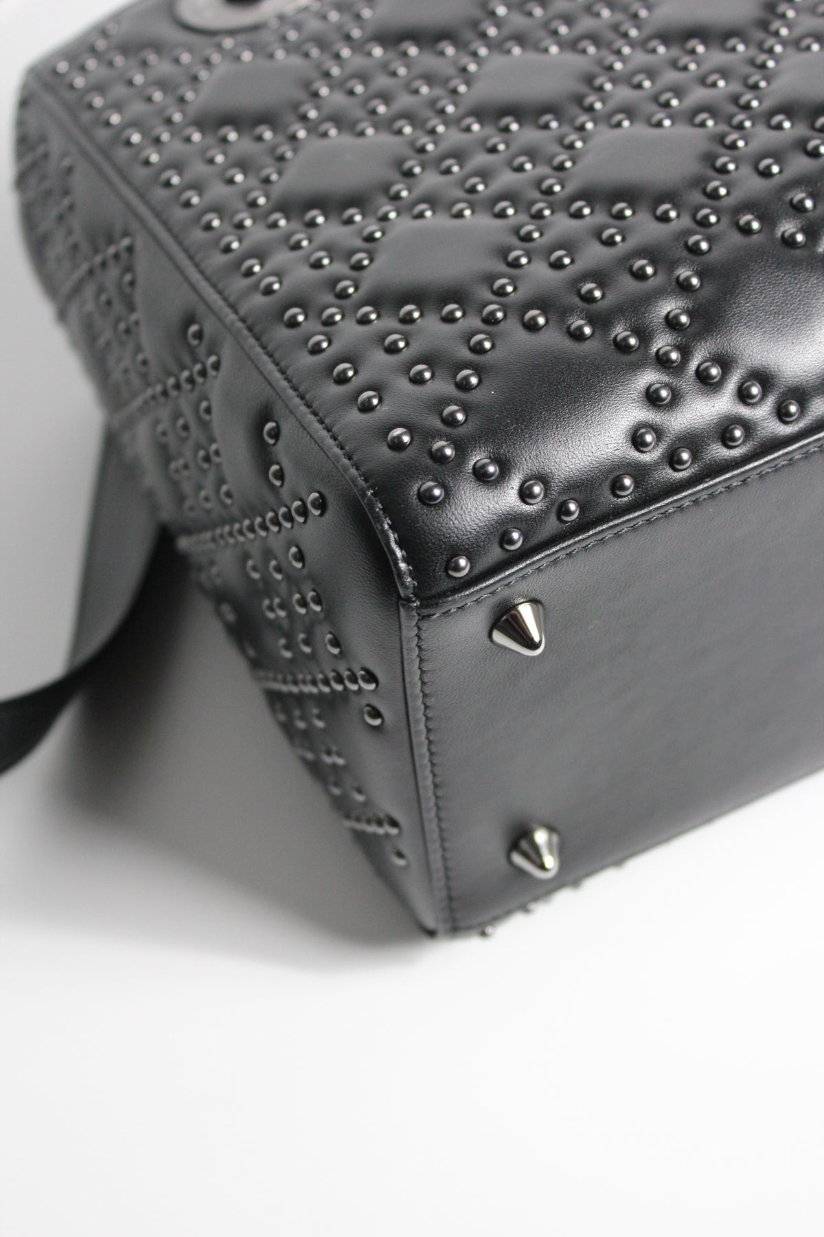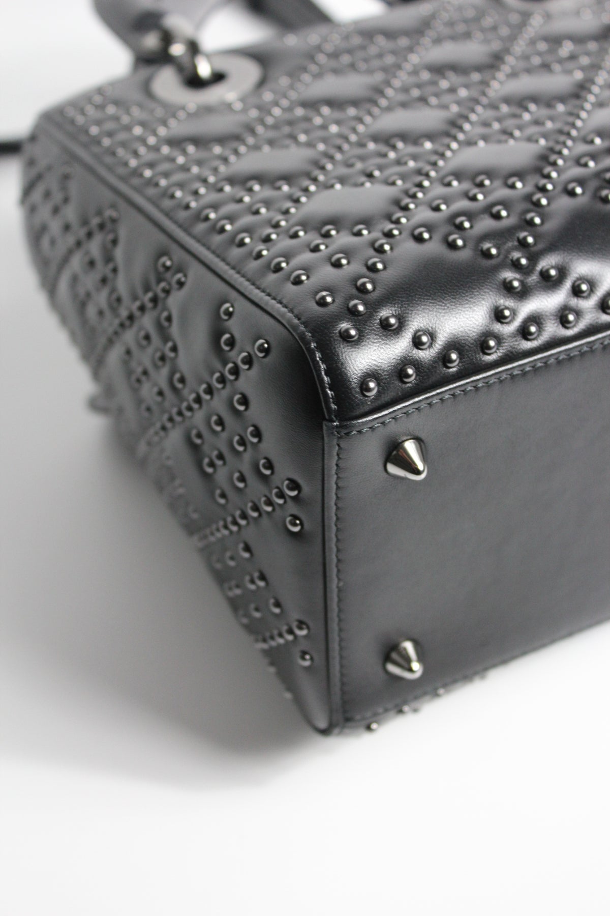 The iconic "Lady Dior" handbag was first introduced in 1994, by Gianfranco Ferre then-creative director at the helm of the French luxury house, and was originally named the "ChouChou". Gifted to the Princess of Wales in 1995,  she was so often photographed by the paparazzi with it, that the name changed to the "Lady Dior" bag. Since then the iconic handbag has been reinterred in many different leathers, colors and sizes. with the rarest ones fetching premium prices on the resell. This beautiful DIOR bag is part of the limited release presented in 2022, crafted from smooth black leather and covered with ruthenium lucky star studs all over, as well as a "DIOR" charms.