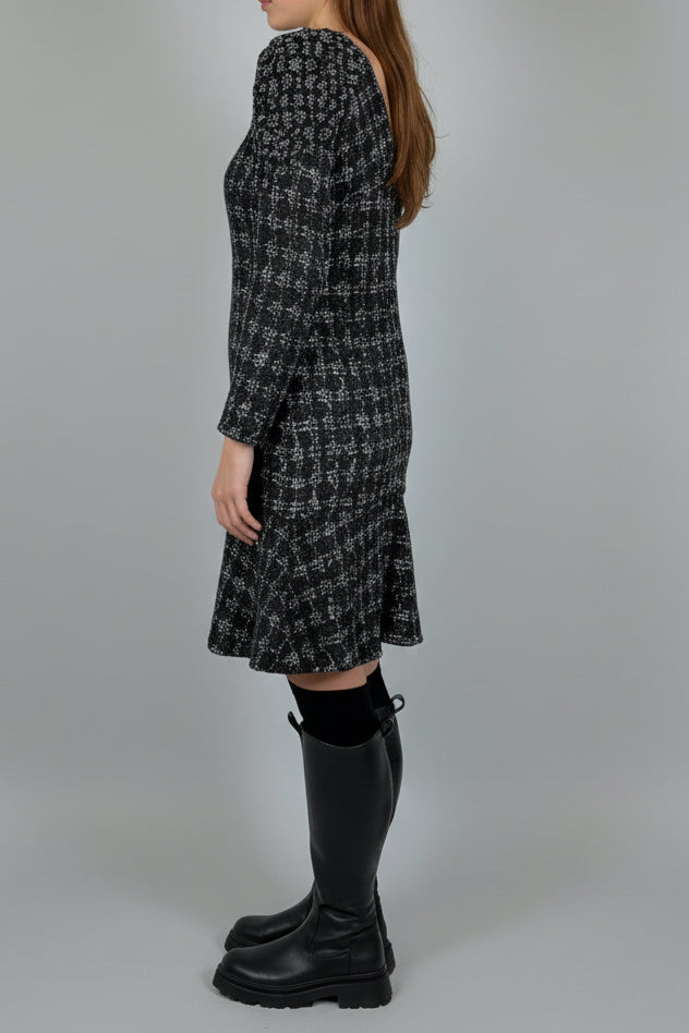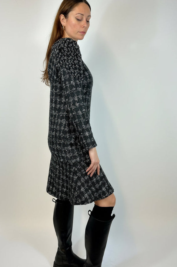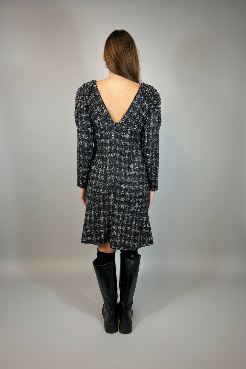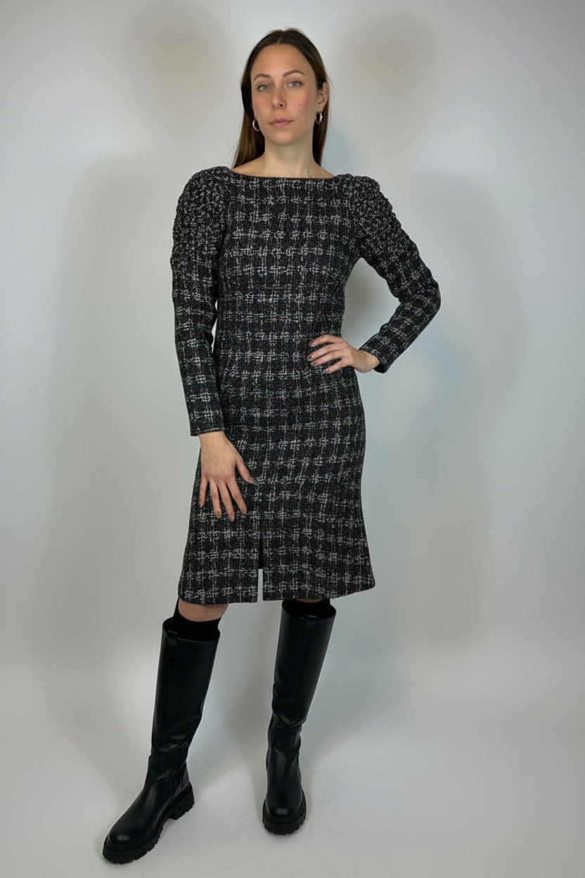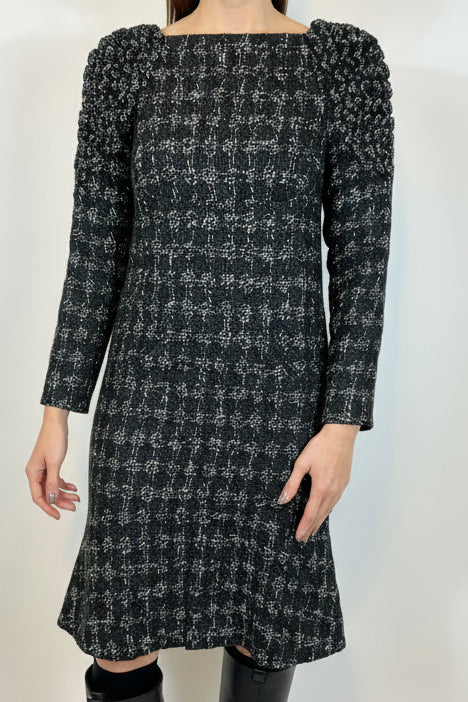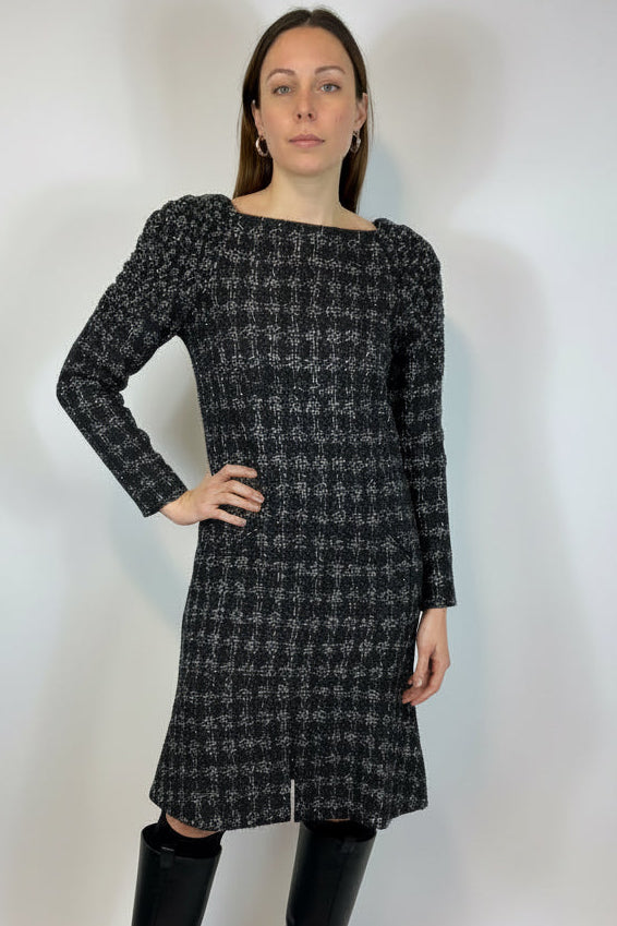 CHANEL Black and White Shimmering Tweed Dress with Intricate Shoulders size 40