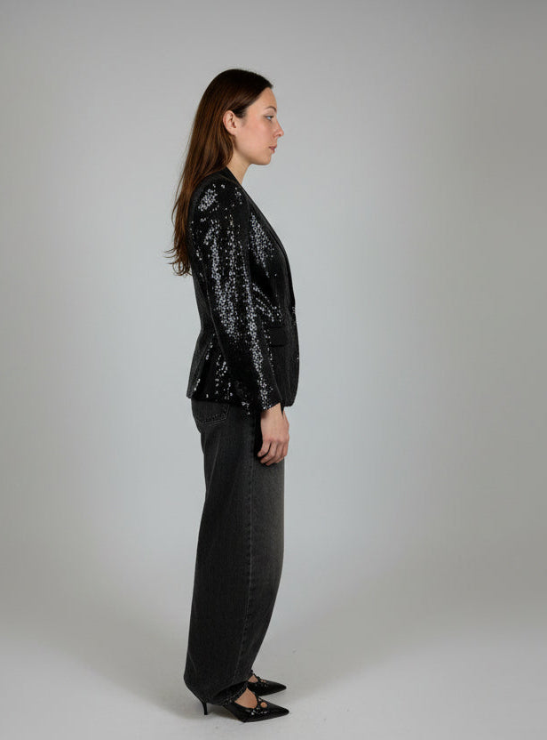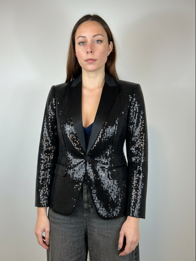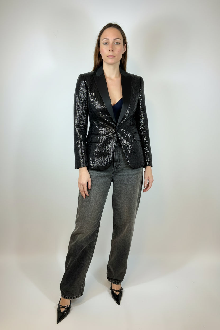 A beautiful evening blazer jacket by DSQUARED, covered in black sequin with a slightly fitted cut, a single button front closure, lapel collar and two vents at the back.