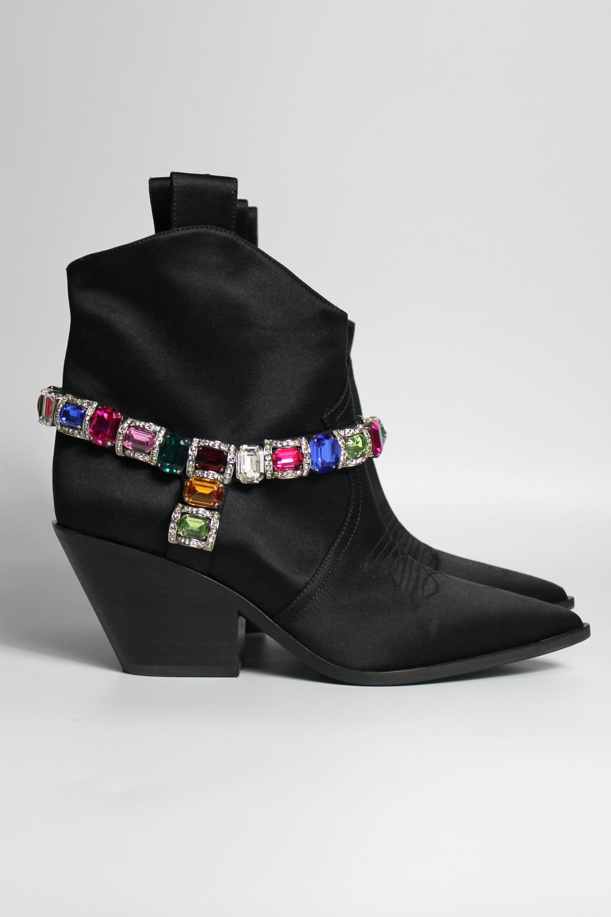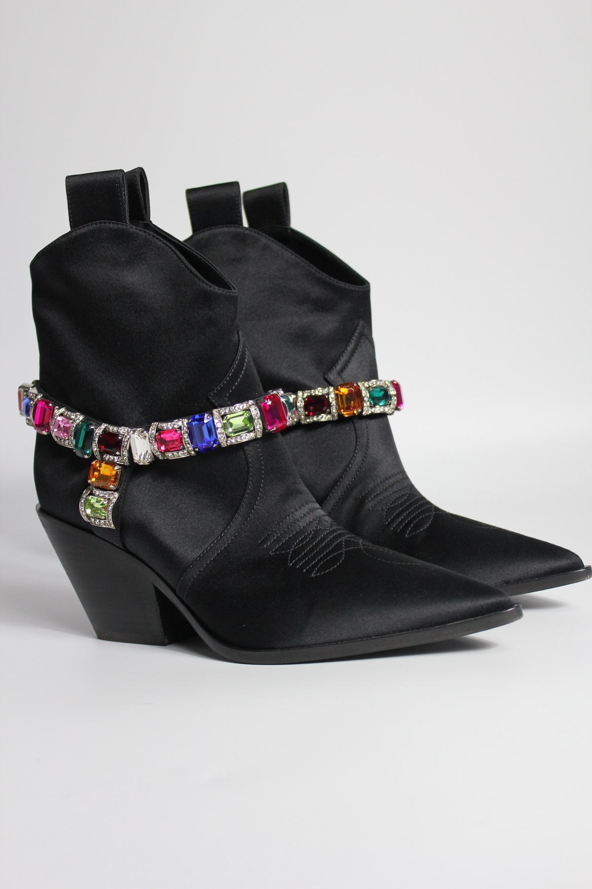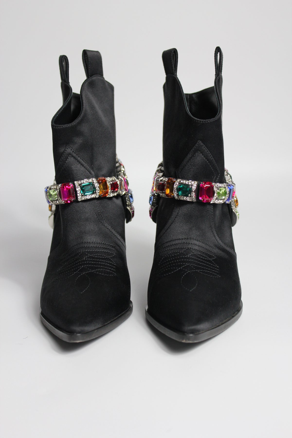 Western but make it Glamour ! Shop these beautiful CASADEI Boots crafted from black satin fabric and embellished with multi color crystals belt.