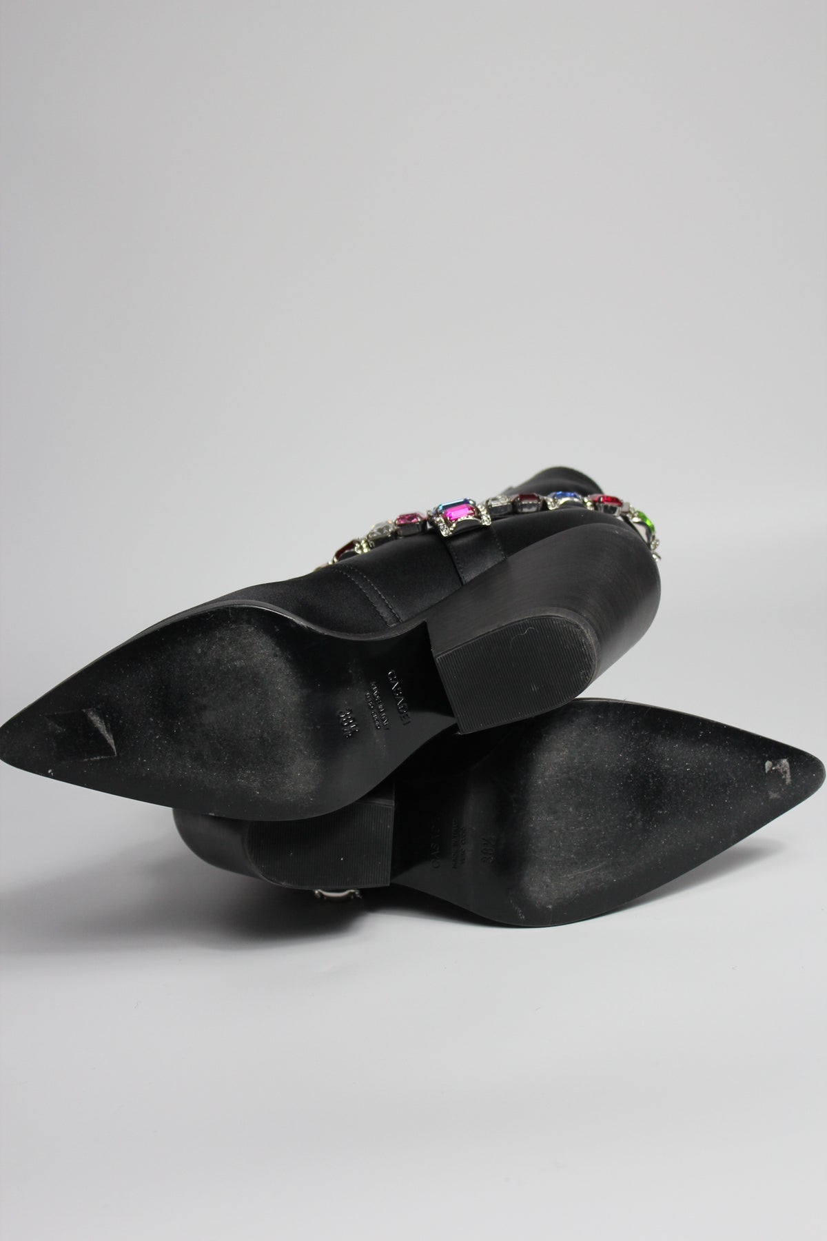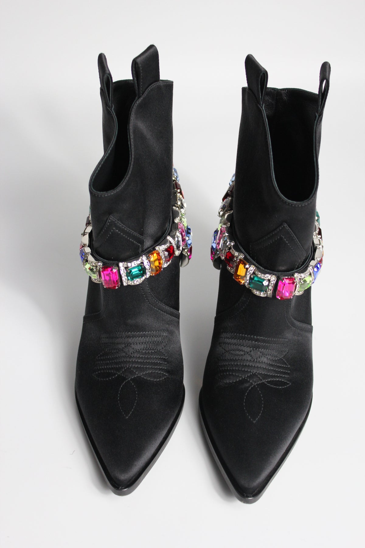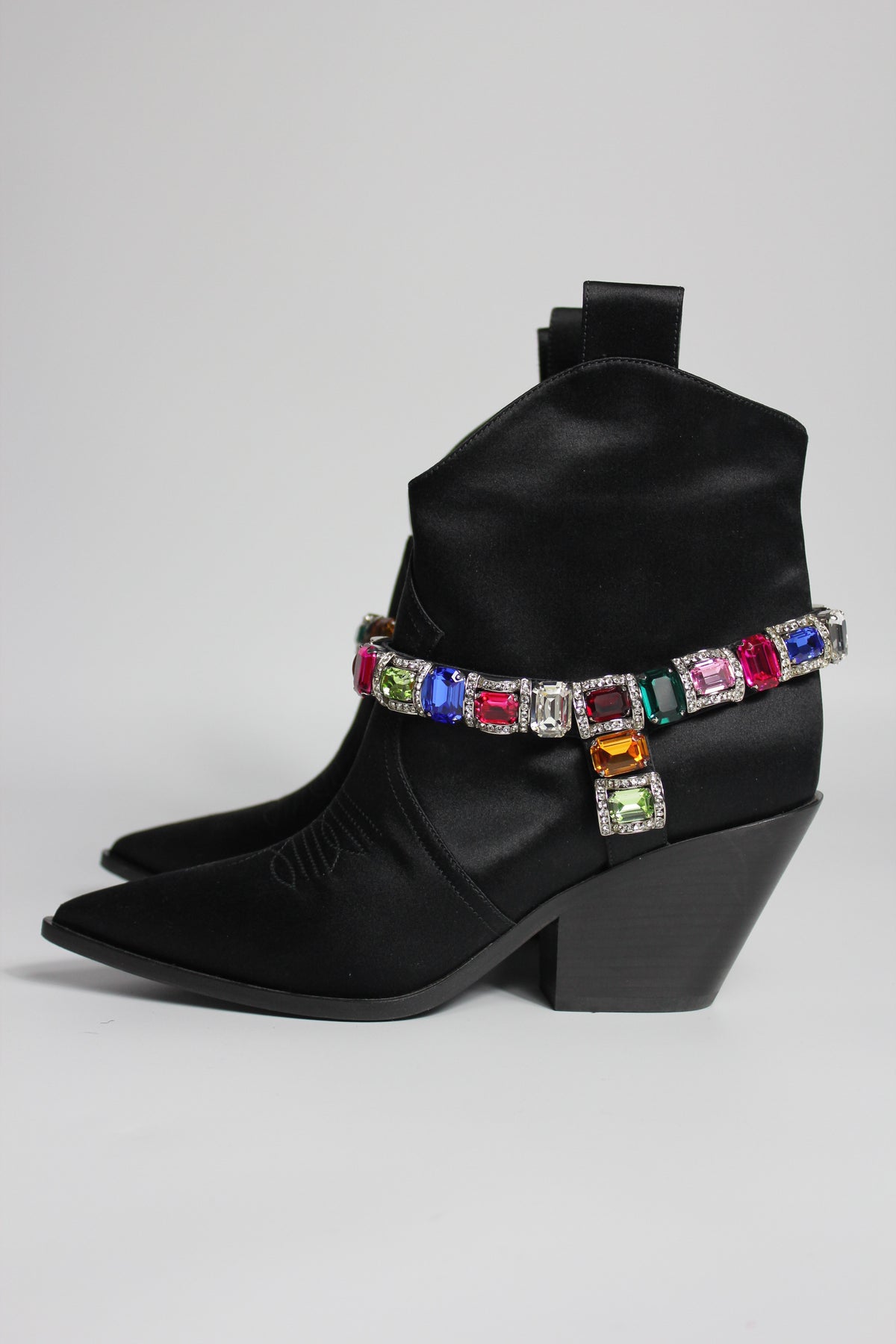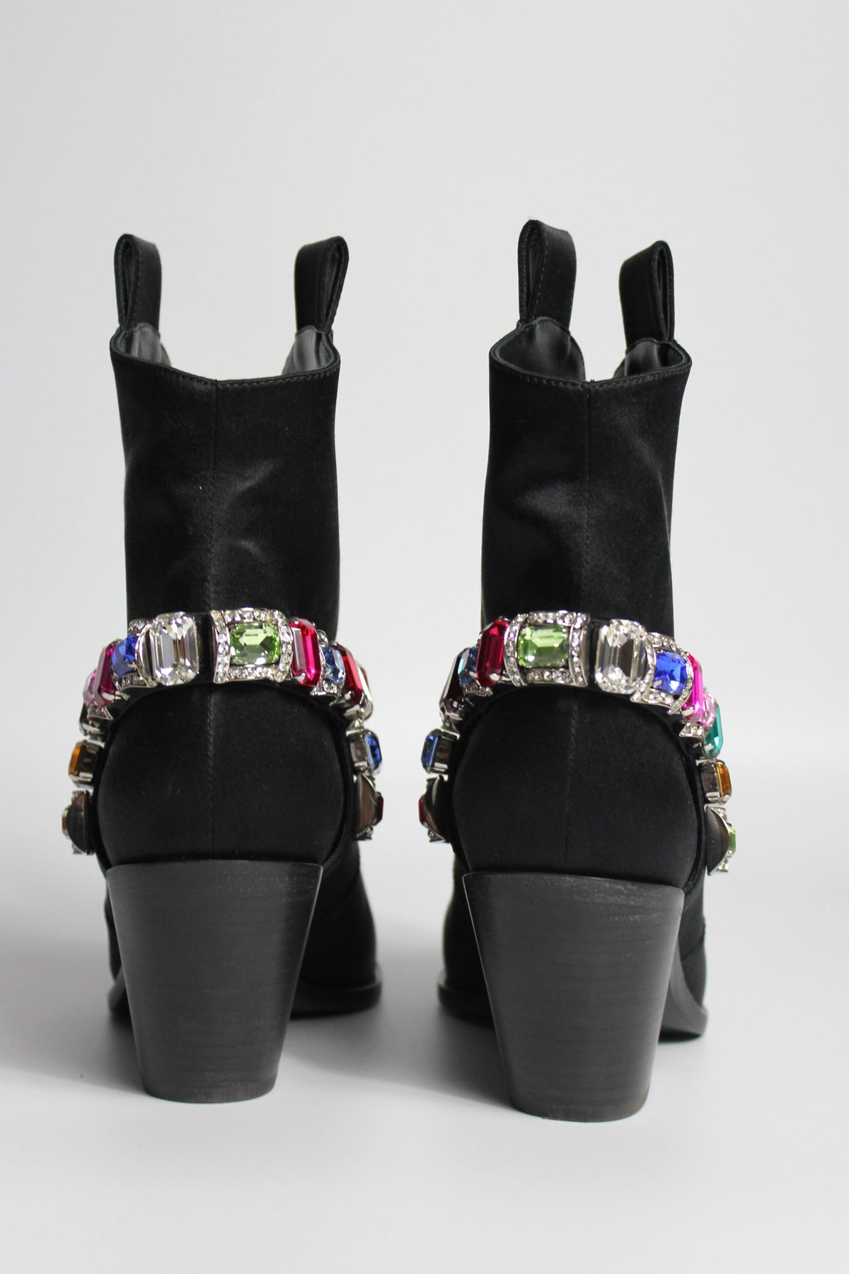 Western but make it Glamour ! Shop these beautiful CASADEI Boots crafted from black satin fabric and embellished with multi color crystals belt.