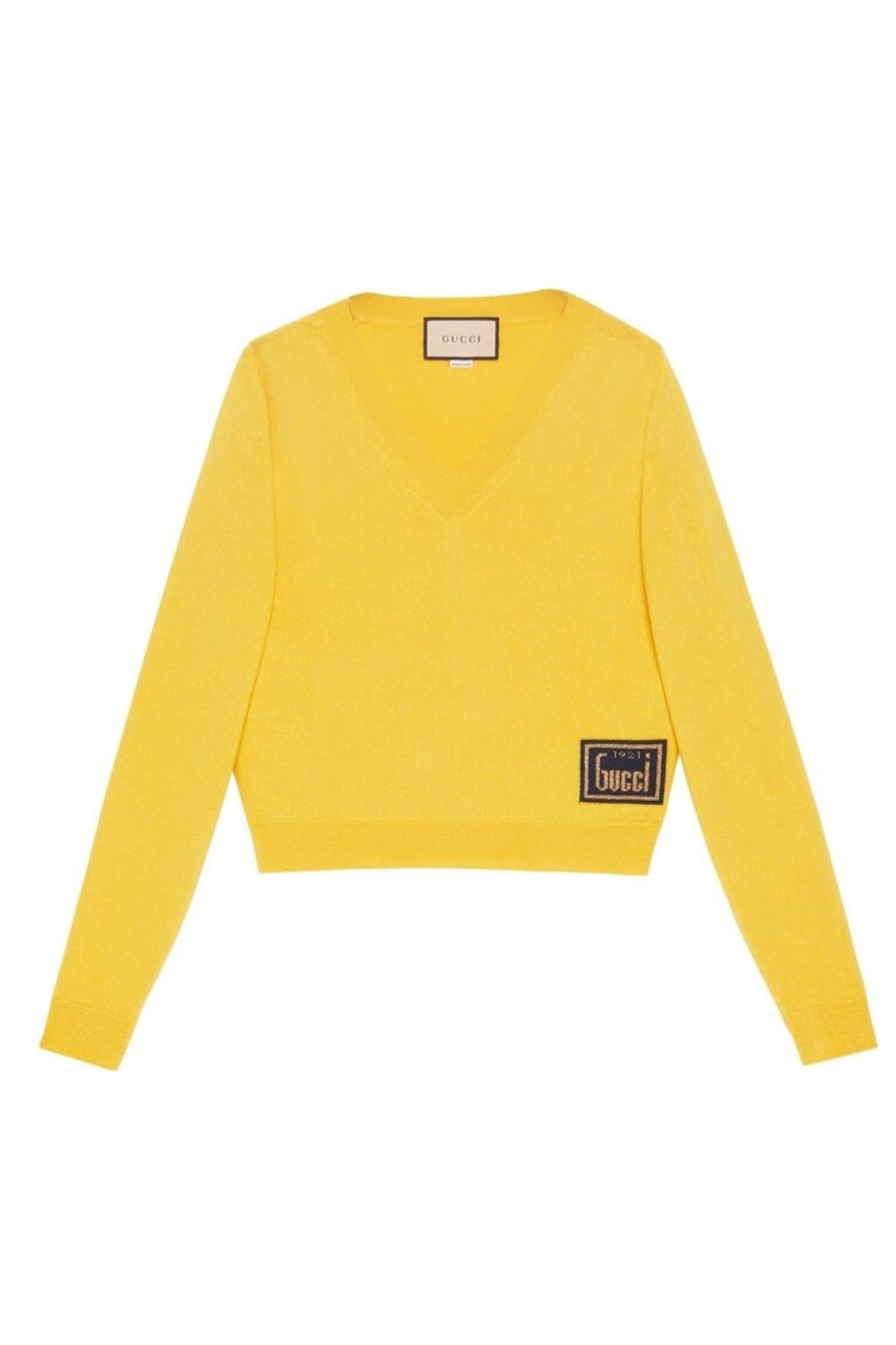 Shop this stunning GUCCI "1921" yellow sweater crafted from soft wool, it features a v neck and a contrasting signature logo patch to one side. Perfect to layer and add some color to an outfit for the transitional season.