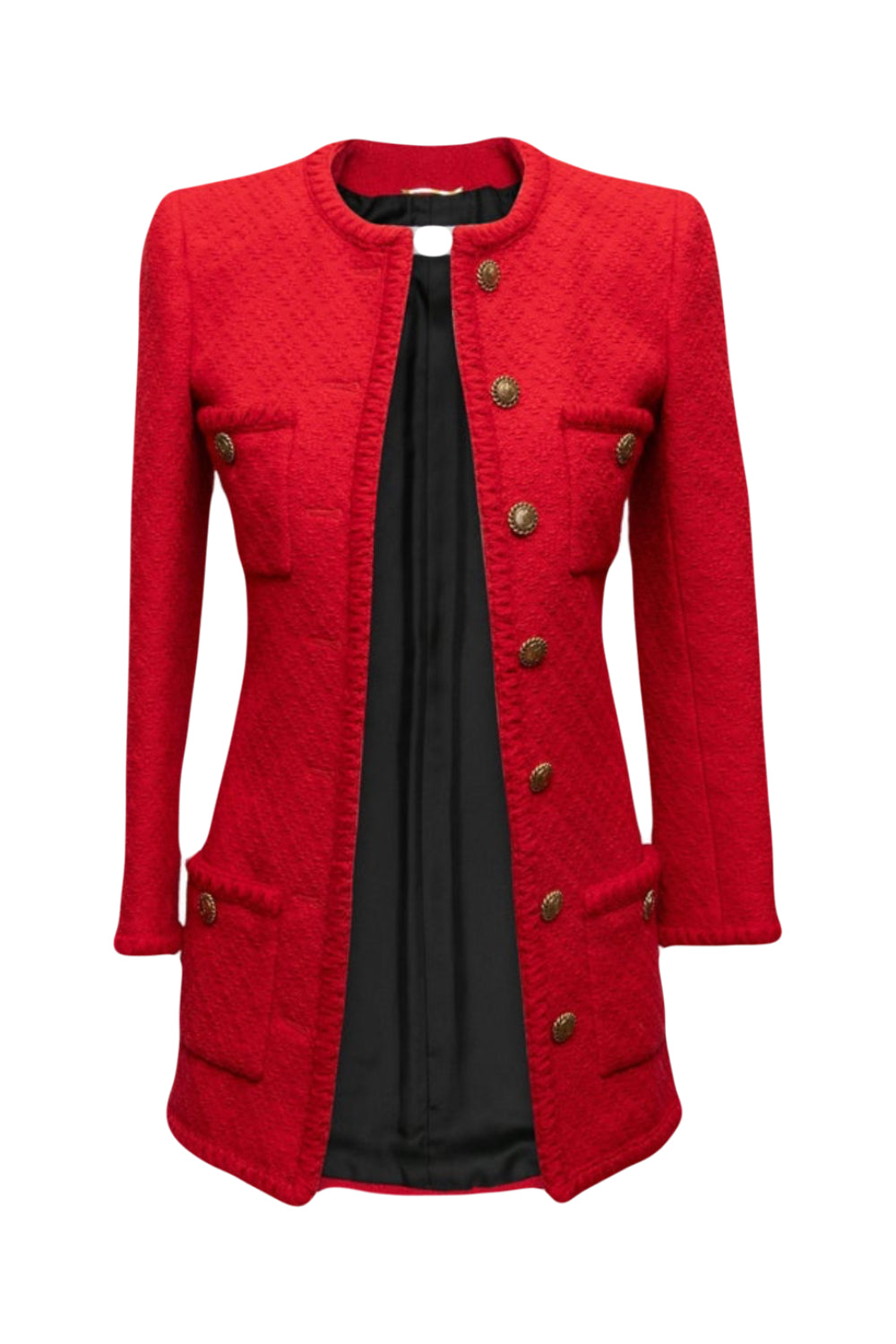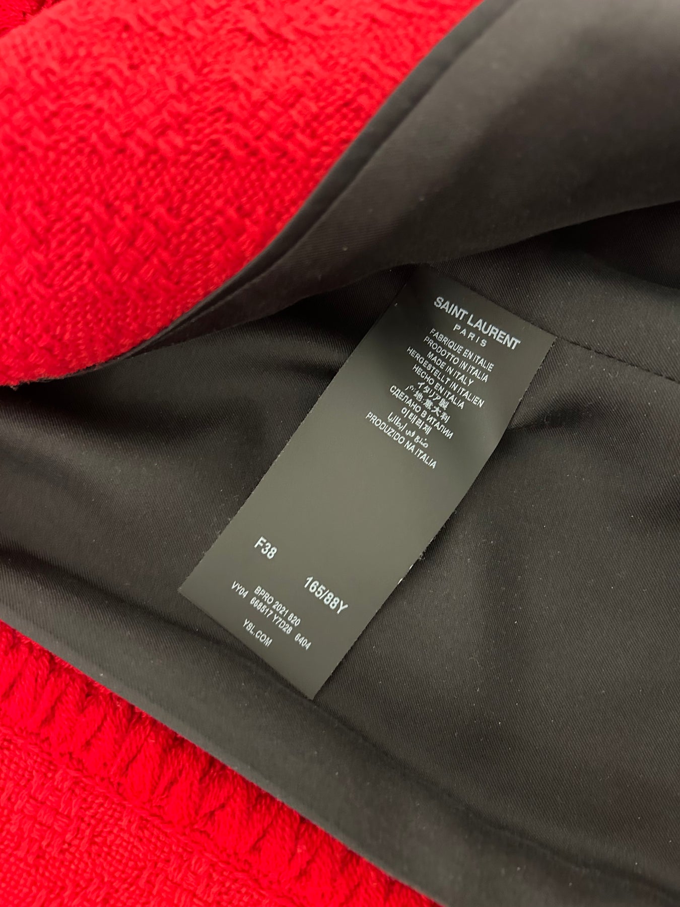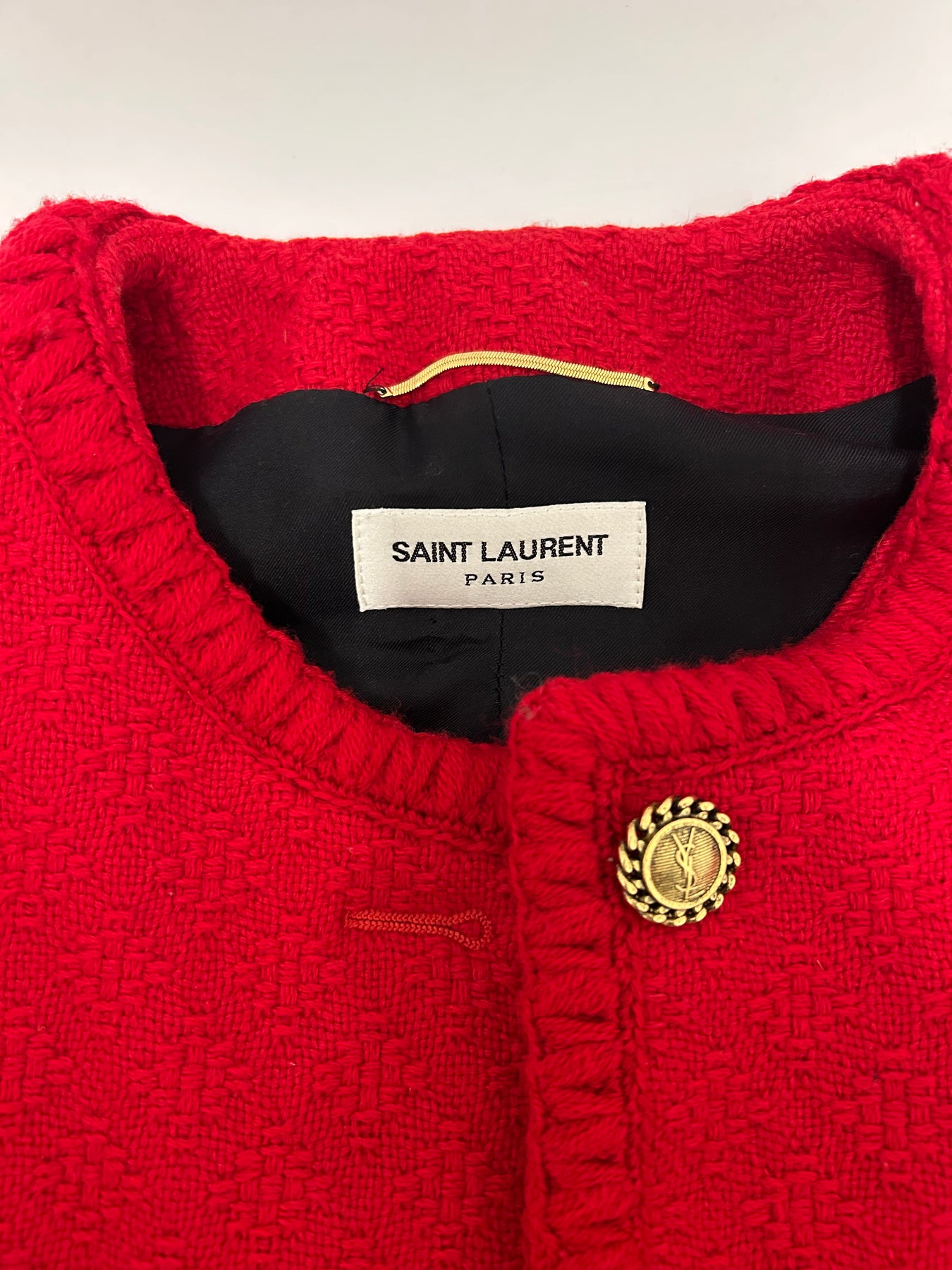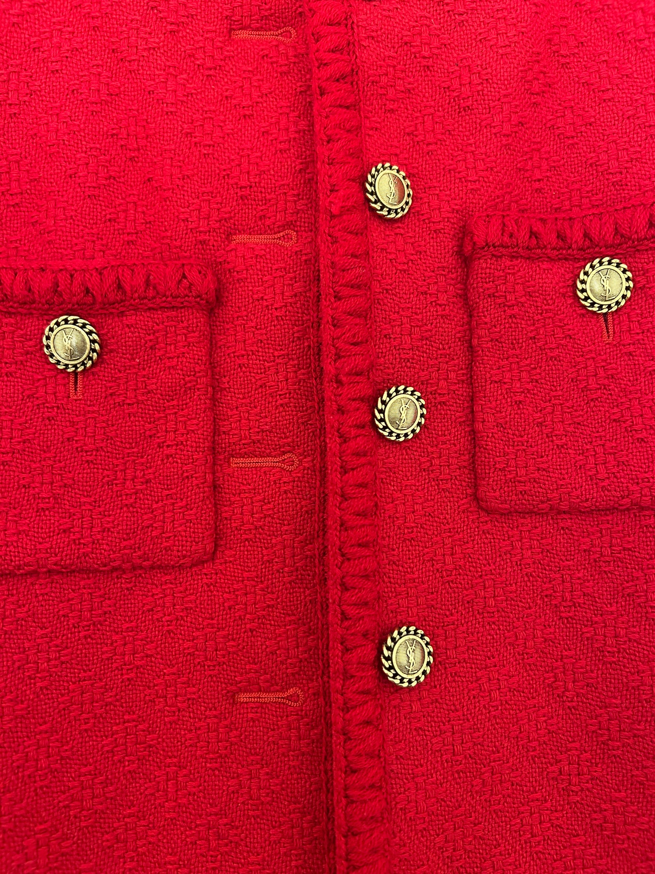 A modern piece by SAINT LAURENT - yet with a timeless appeal. This tweed red open blazer style jacket features a colarless braided trim as well as "YSL" signature buttons in contrasting antique gold metal. The buttons can be find in front and cuffs. Four front flap pockets.