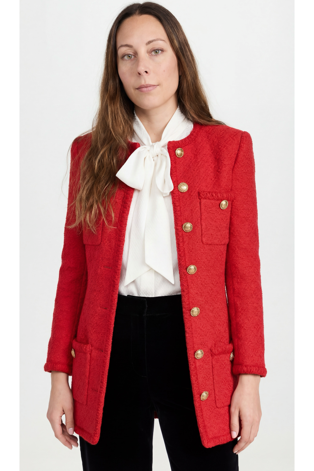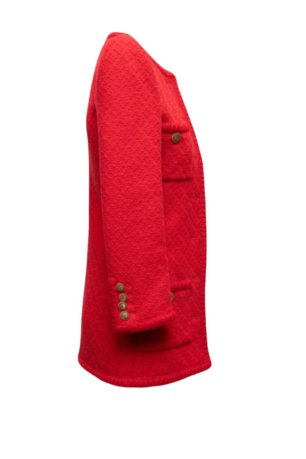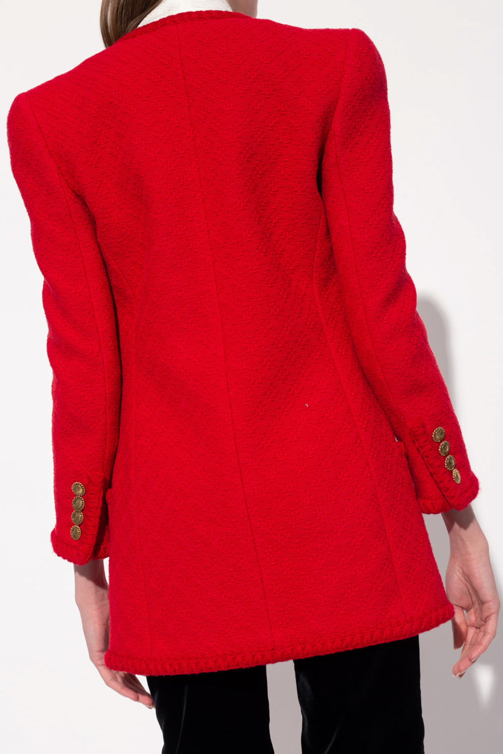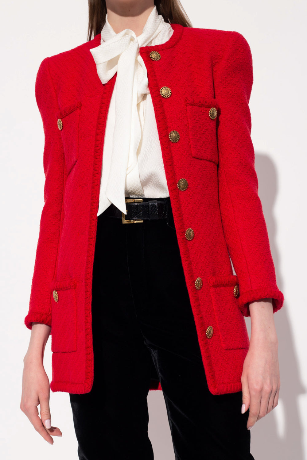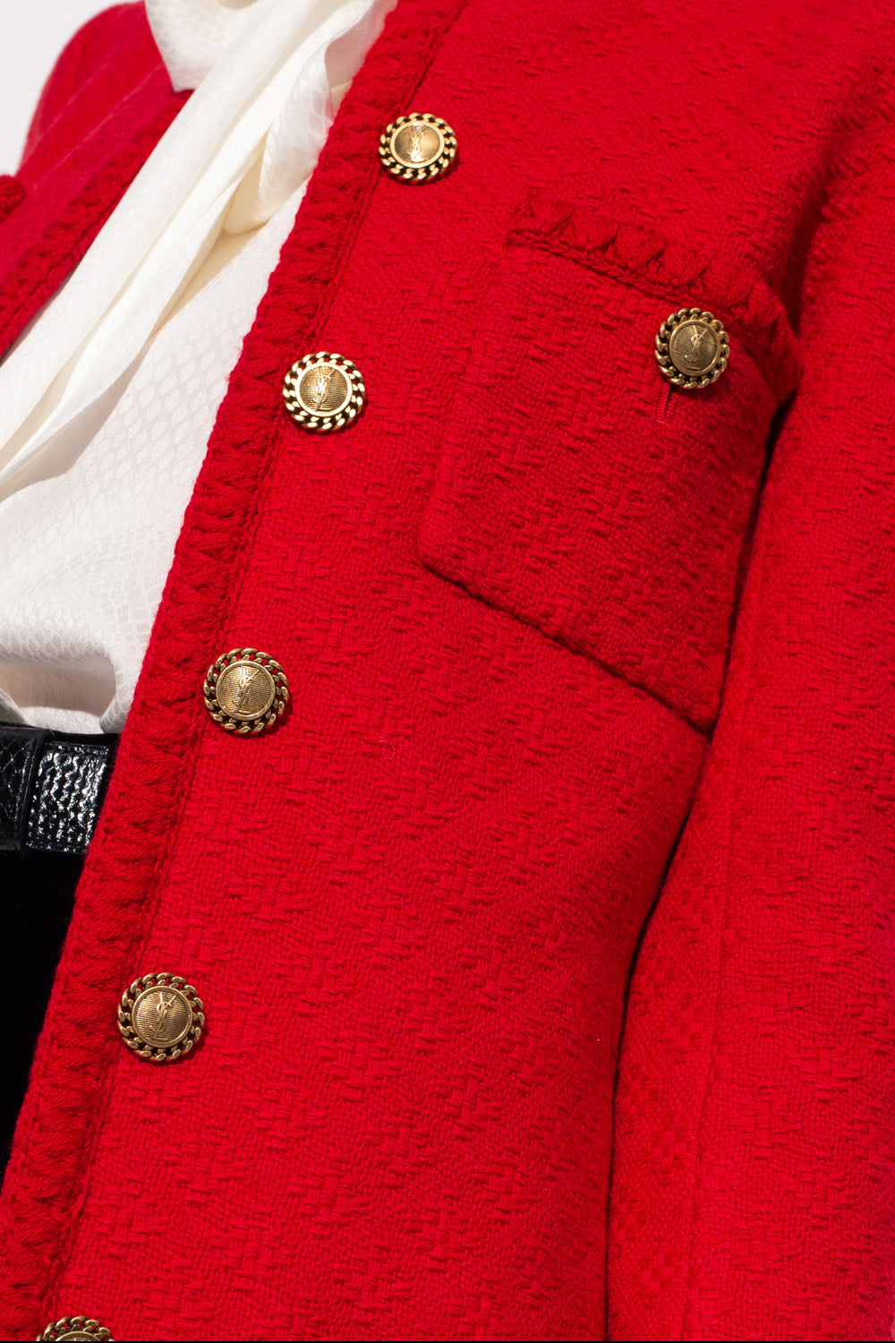 A modern piece by SAINT LAURENT - yet with a timeless appeal. This tweed red open blazer style jacket features a colarless braided trim as well as "YSL" signature buttons in contrasting antique gold metal. The buttons can be find in front and cuffs. Four front flap pockets.