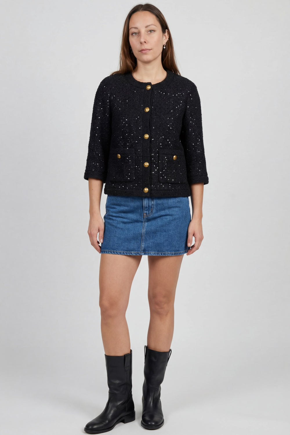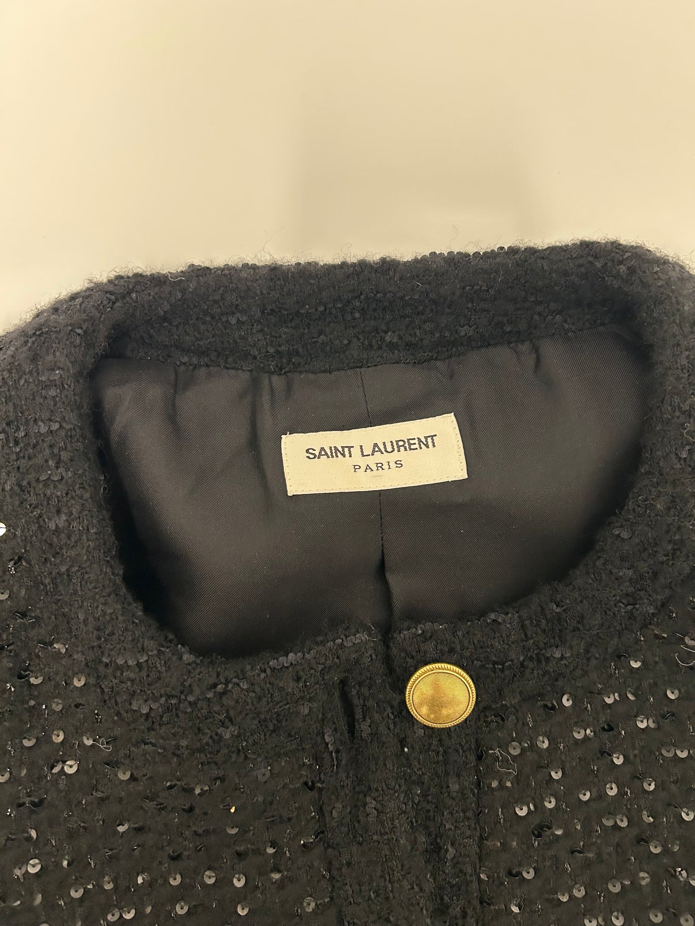 Shop this beautful SAINT LAURENT black wool jacket with sequins all over and antique gold buttons front closure. the jacket features a modern yet timeless elegant look with 3/4 sleeves and front slip pockets.