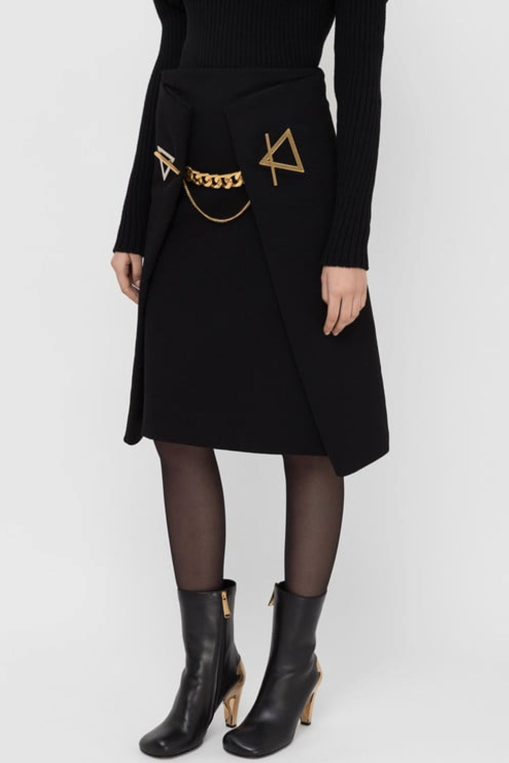 Shop this incredible piece by BOTTEGA VENETA under the creative direction of Dianel LEE crafted from chocolate  soft and warm cashmere, the skirt features a high waist A line shape with front panel embellished by a silver and antique gold chain detailing at the front and triangle toggle closures.