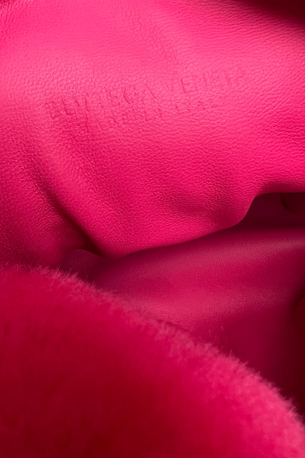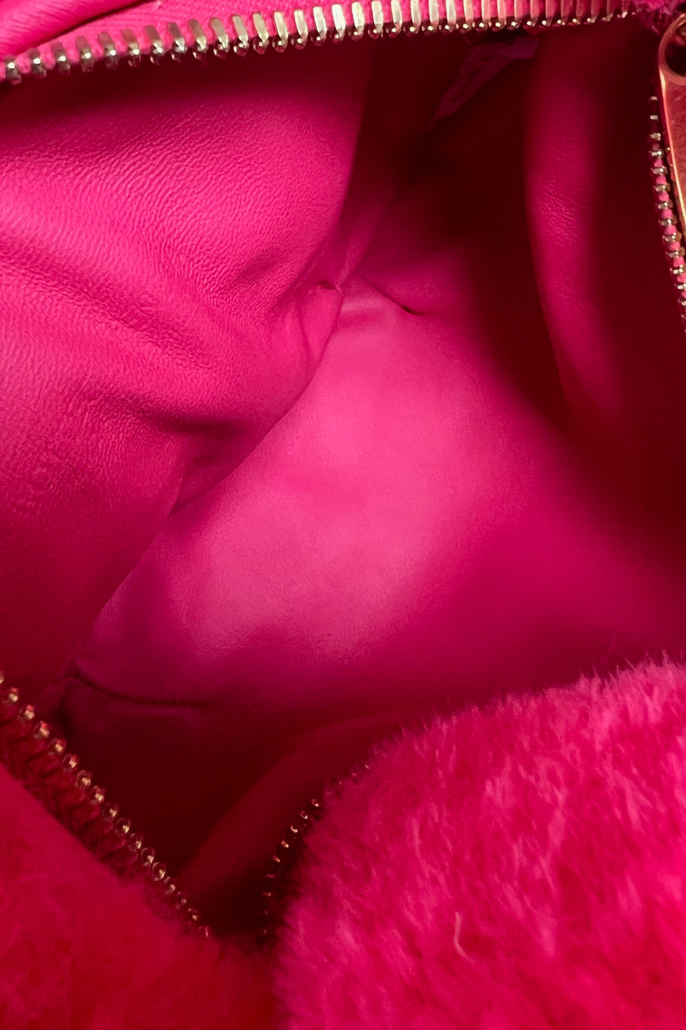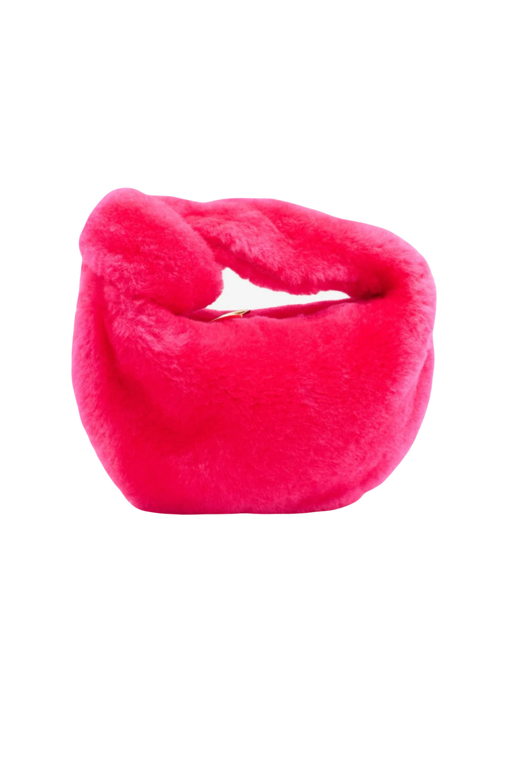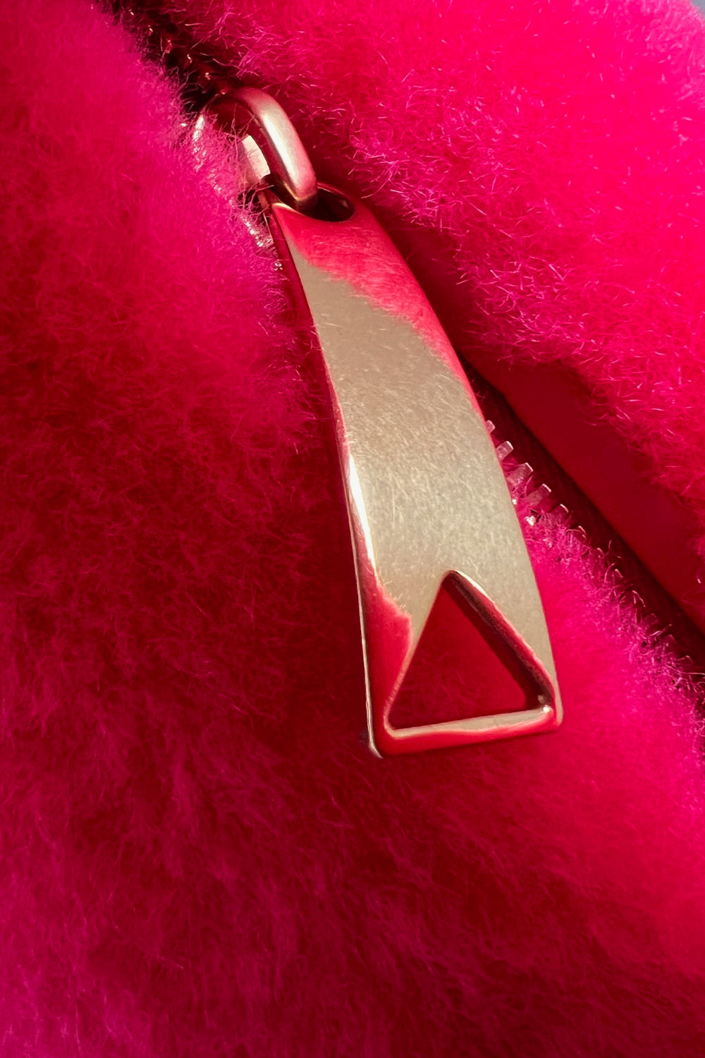 Now this is a way to have fun -The iconic Mini Jodie, named after the actress Jodie's Foster, is revisited in a new hot pink shearling and is paired with gold hardware. It features the iconic knot handle and zipper closure.