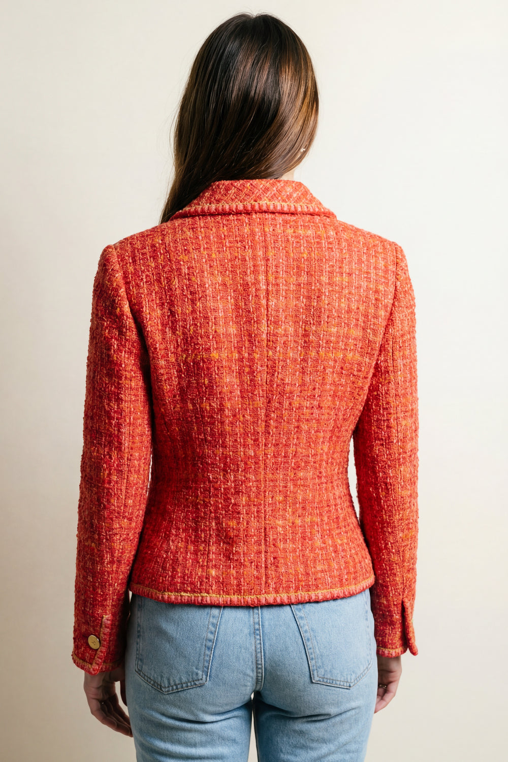 This item is a classic Chanel tweed jacket, crafted in a vivid red, orange, and multi-color wool-blend with a slim, tailored fit. Key design features a notched lapel, two slit pockets, and iconic transparent with gold -toned buttons CC logo on the front and cuff. This jacket is fully lined with a silk camelia pattern.