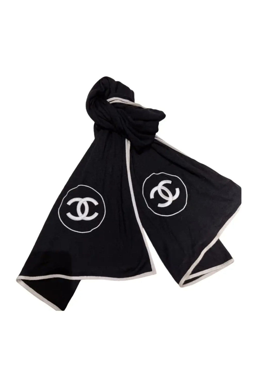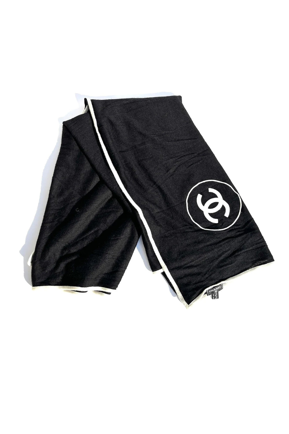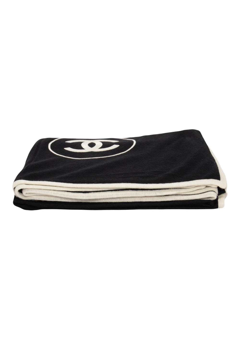 Wrap up cosy with this elegant CHANEL cashmere shawl - Its black warm and soft fabric features a contrasting white trim and CC logo on both end of the shawl.