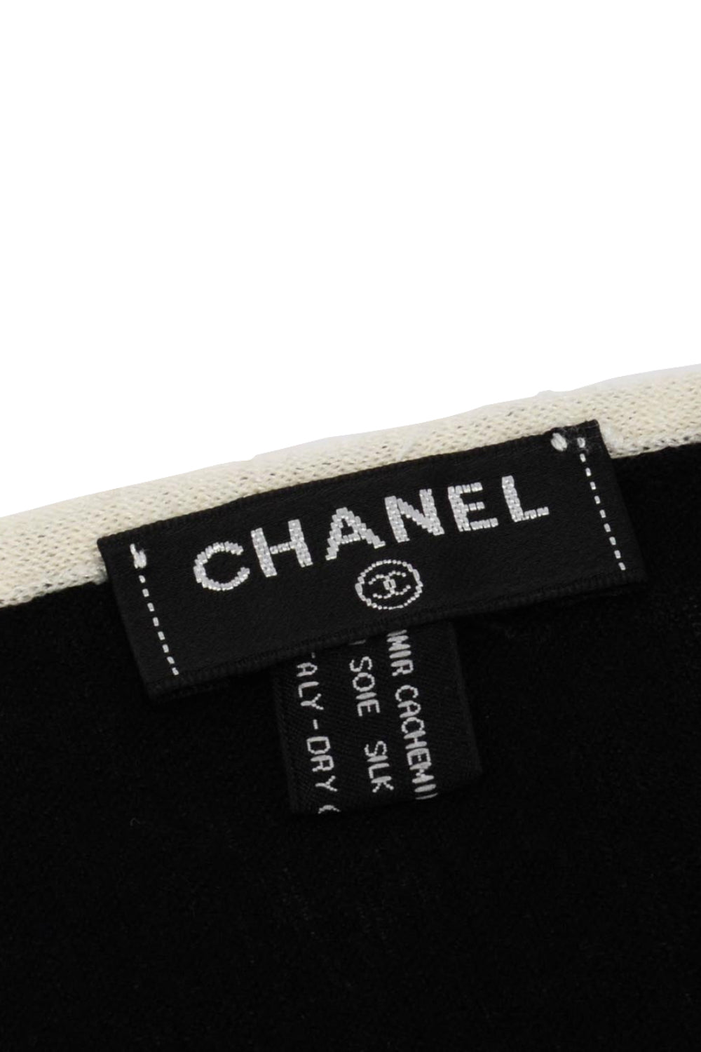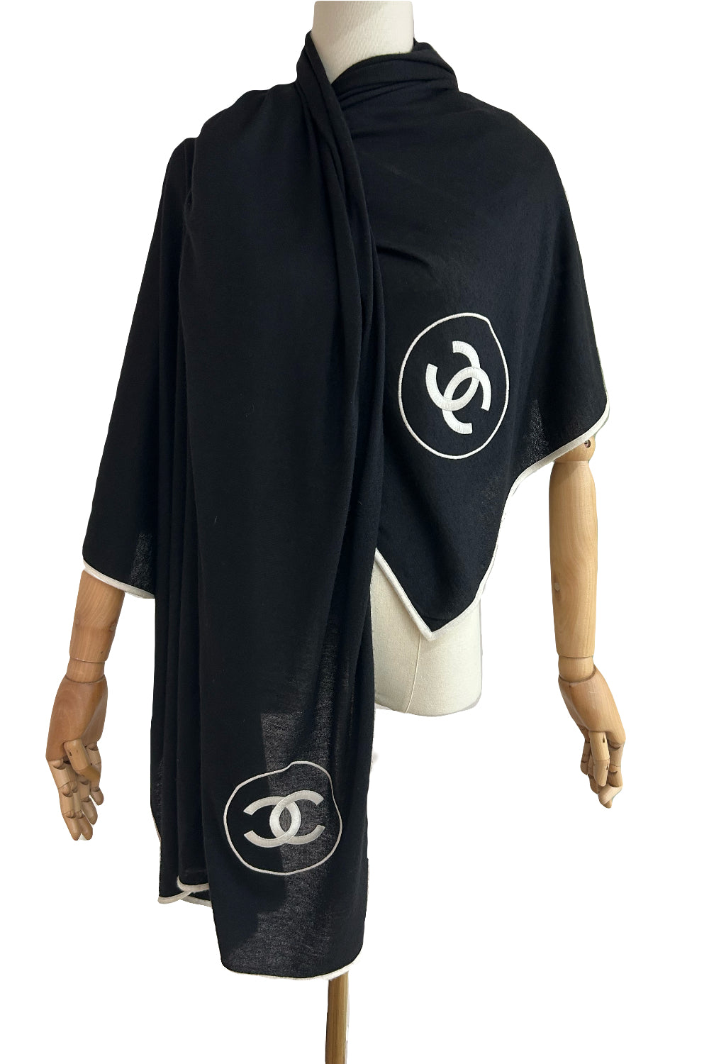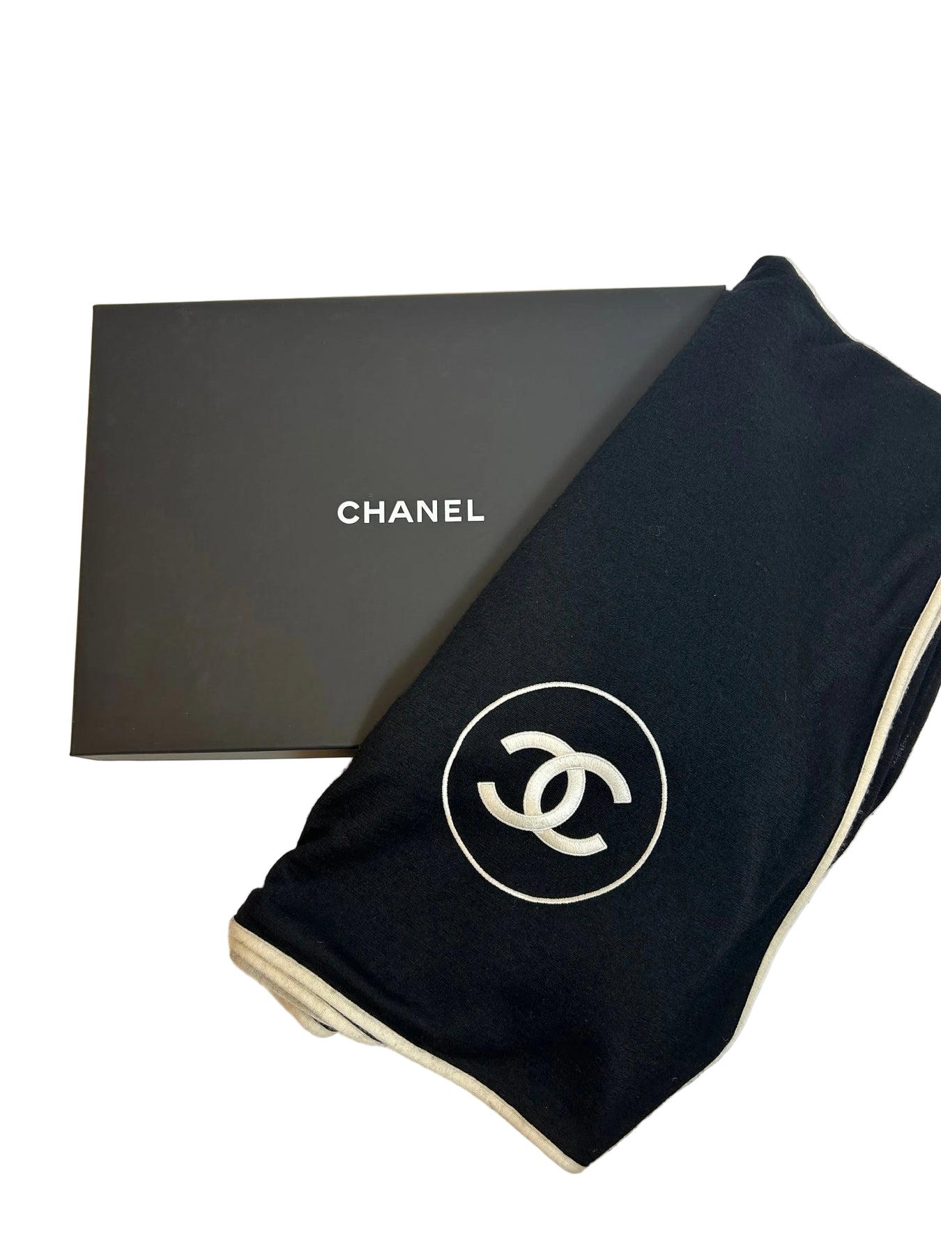 CHANEL 2023 Cashmere back and white logo large shawl with box