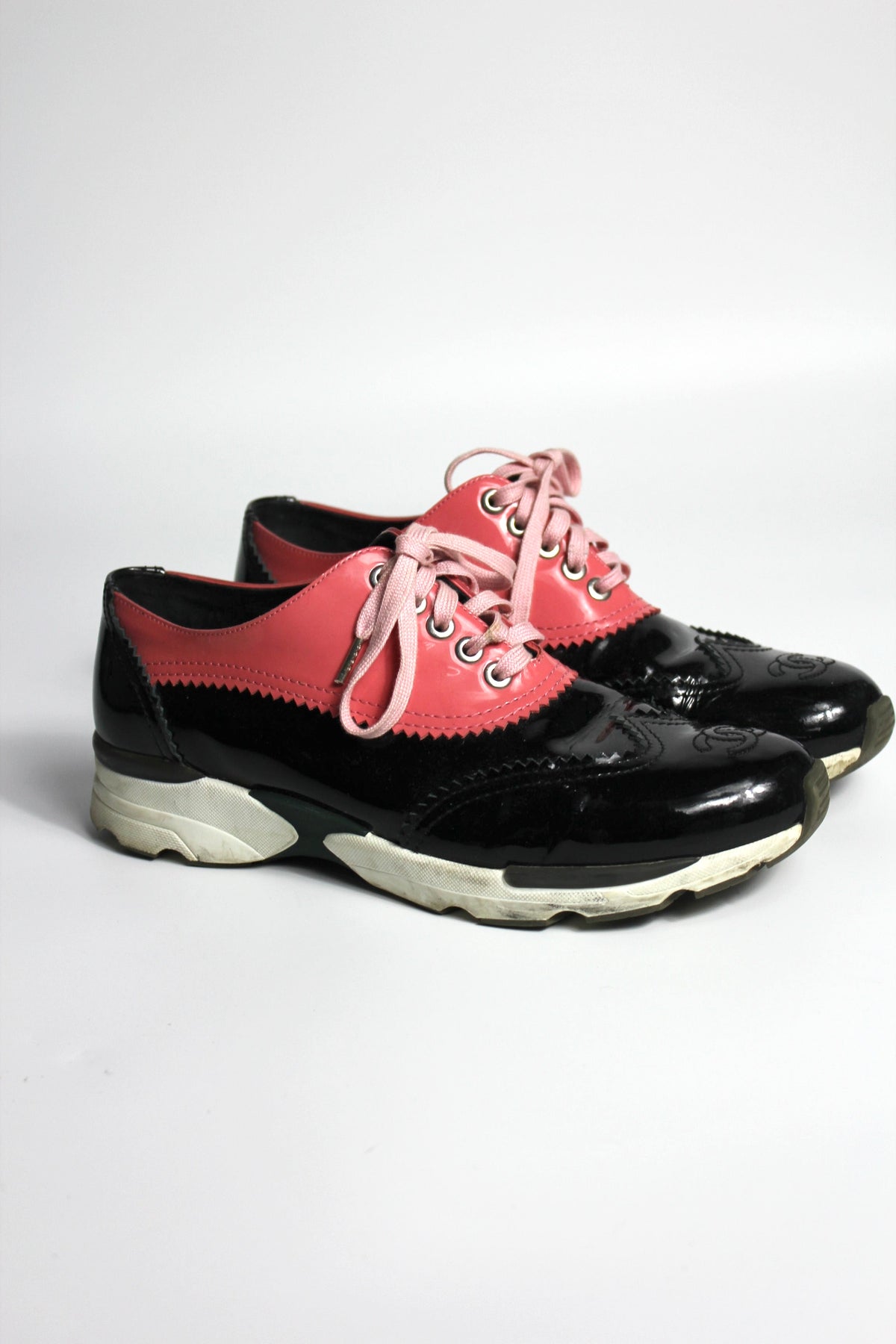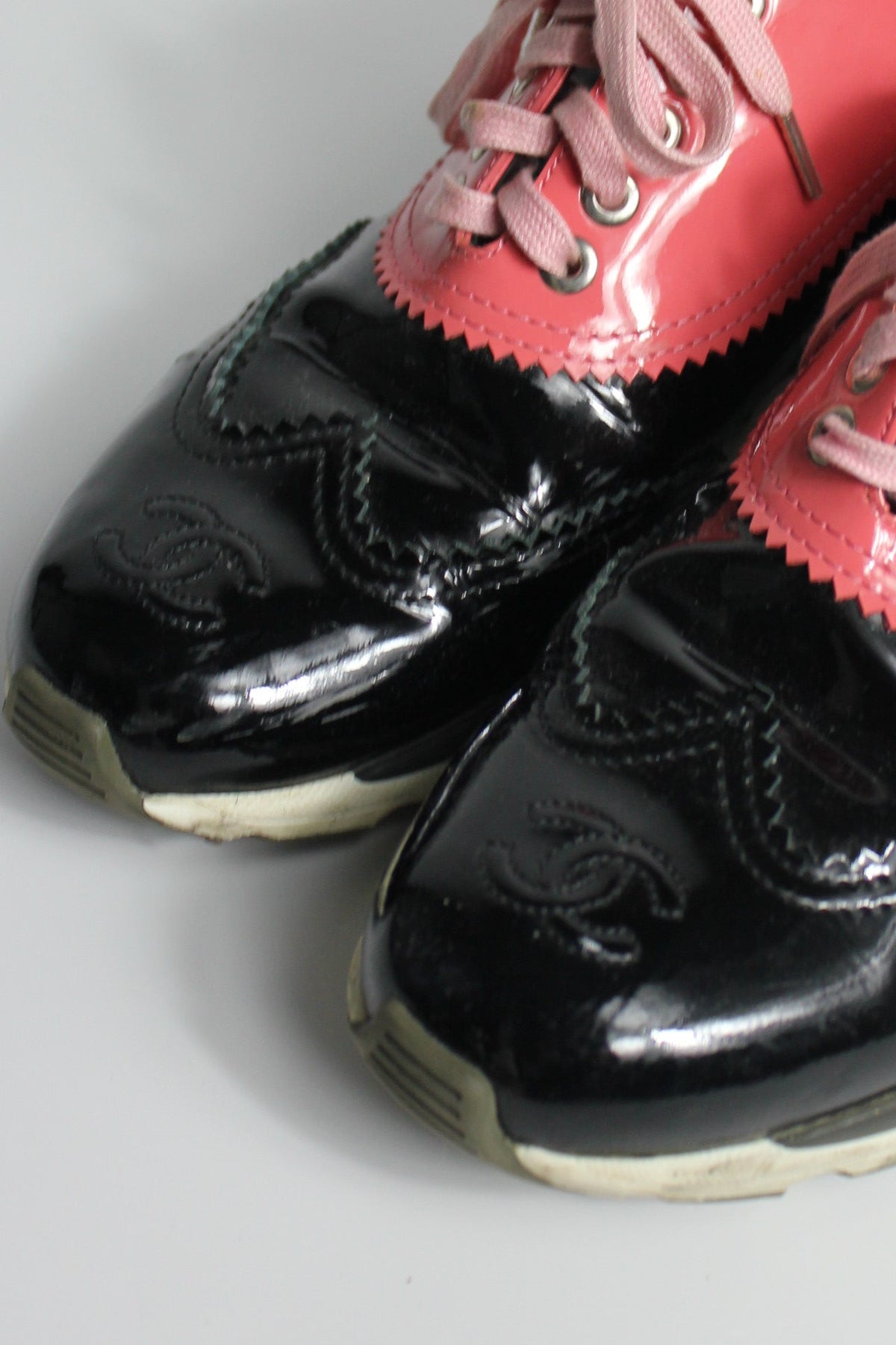Shop these cool CHANEL trainers crafted from Black and Pink patent leather, they also a feature a CC logo to the front.