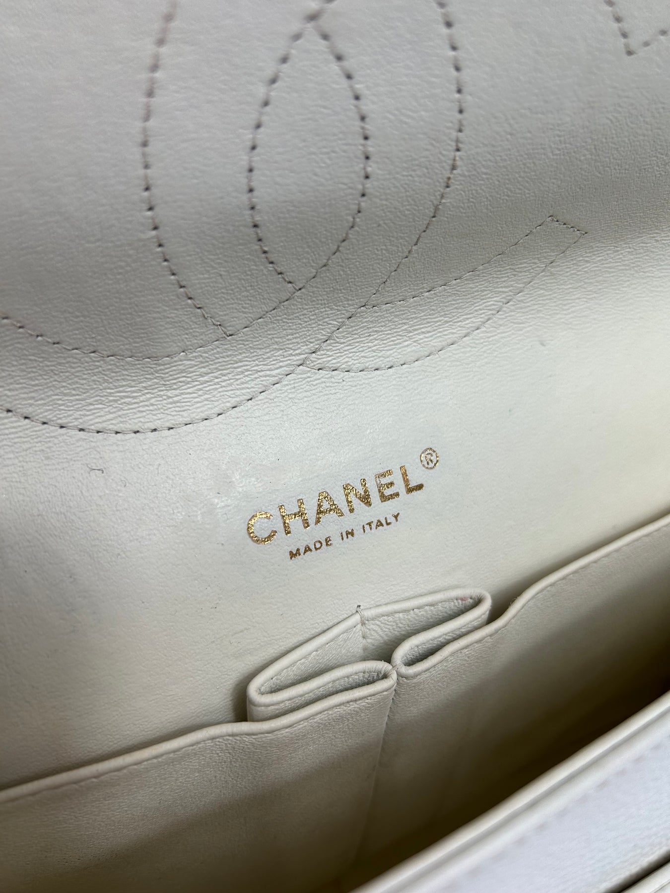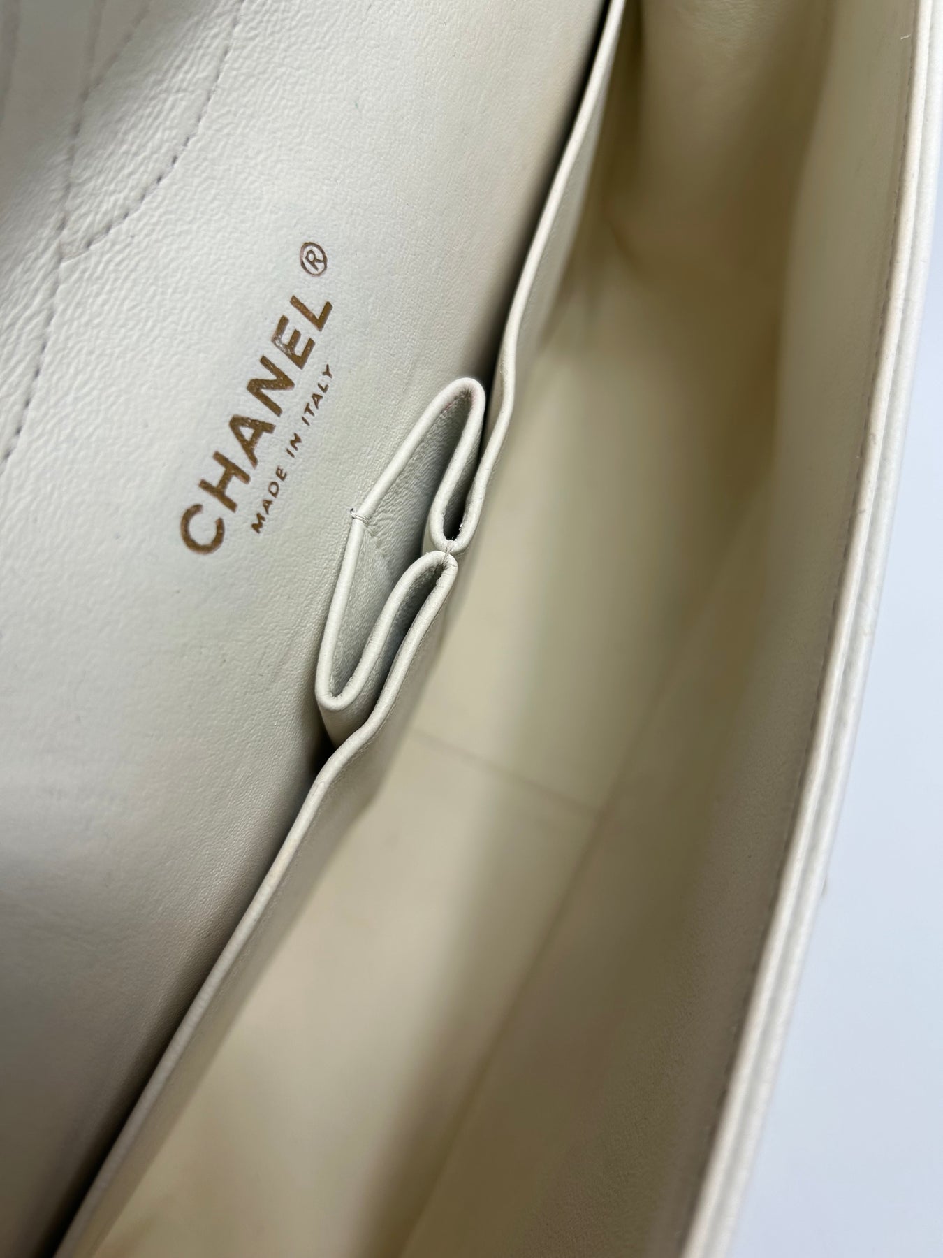 Very good condition. Front crease to structure. Light discoloration to the pin turnlock. White leather is a very delicate color and therefore can show some stains/ darkening which can be professionally addressed to handbag specialist for cleaning. Interior clean, chain hardware gold and bright.