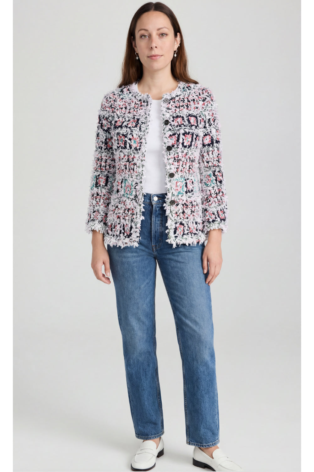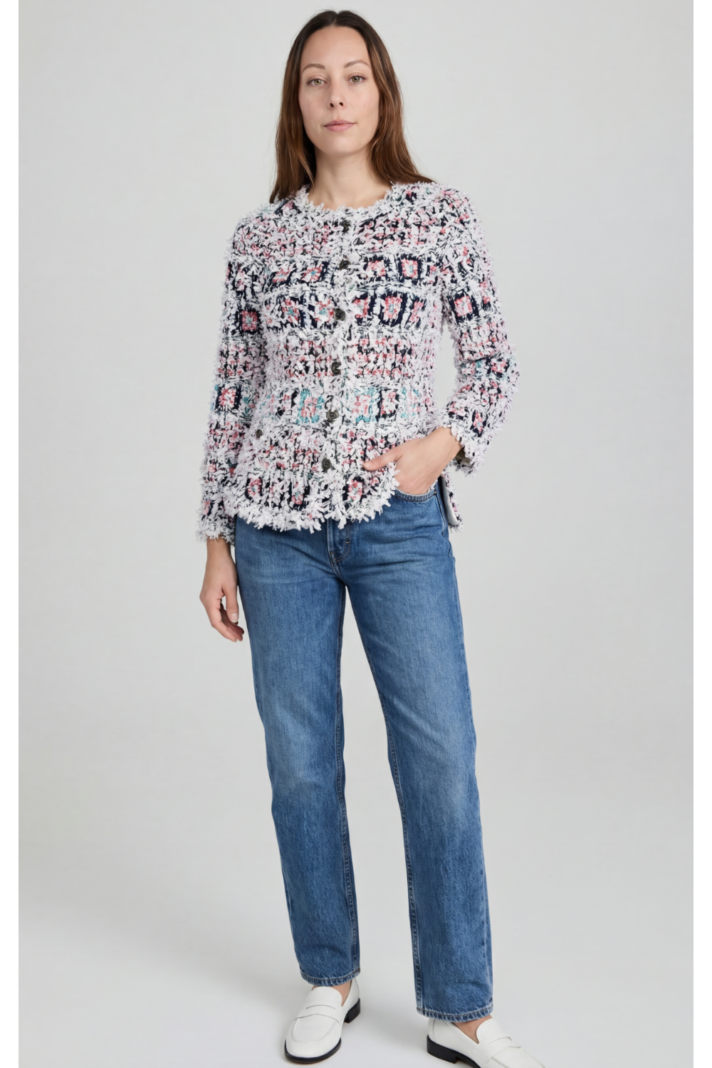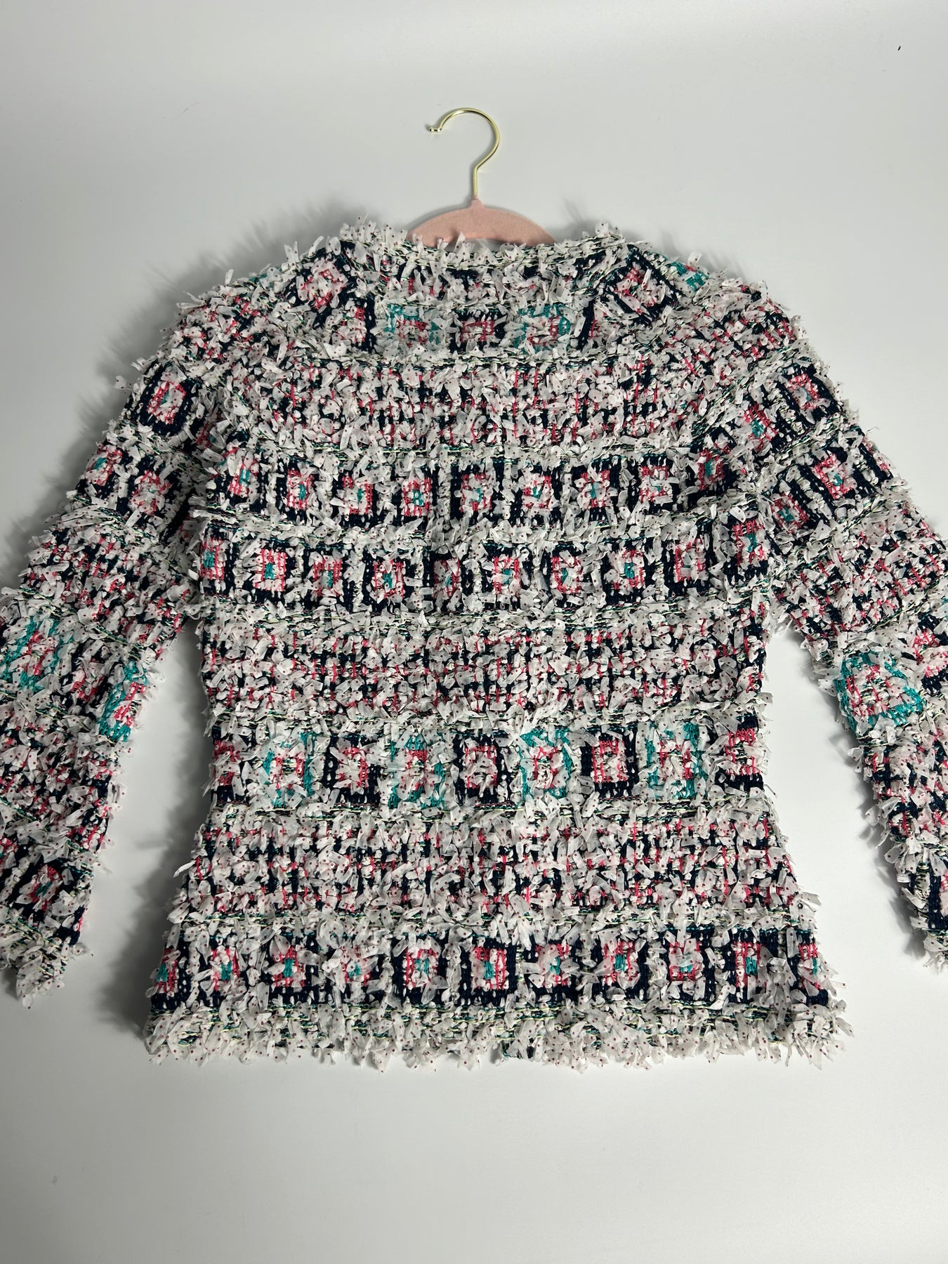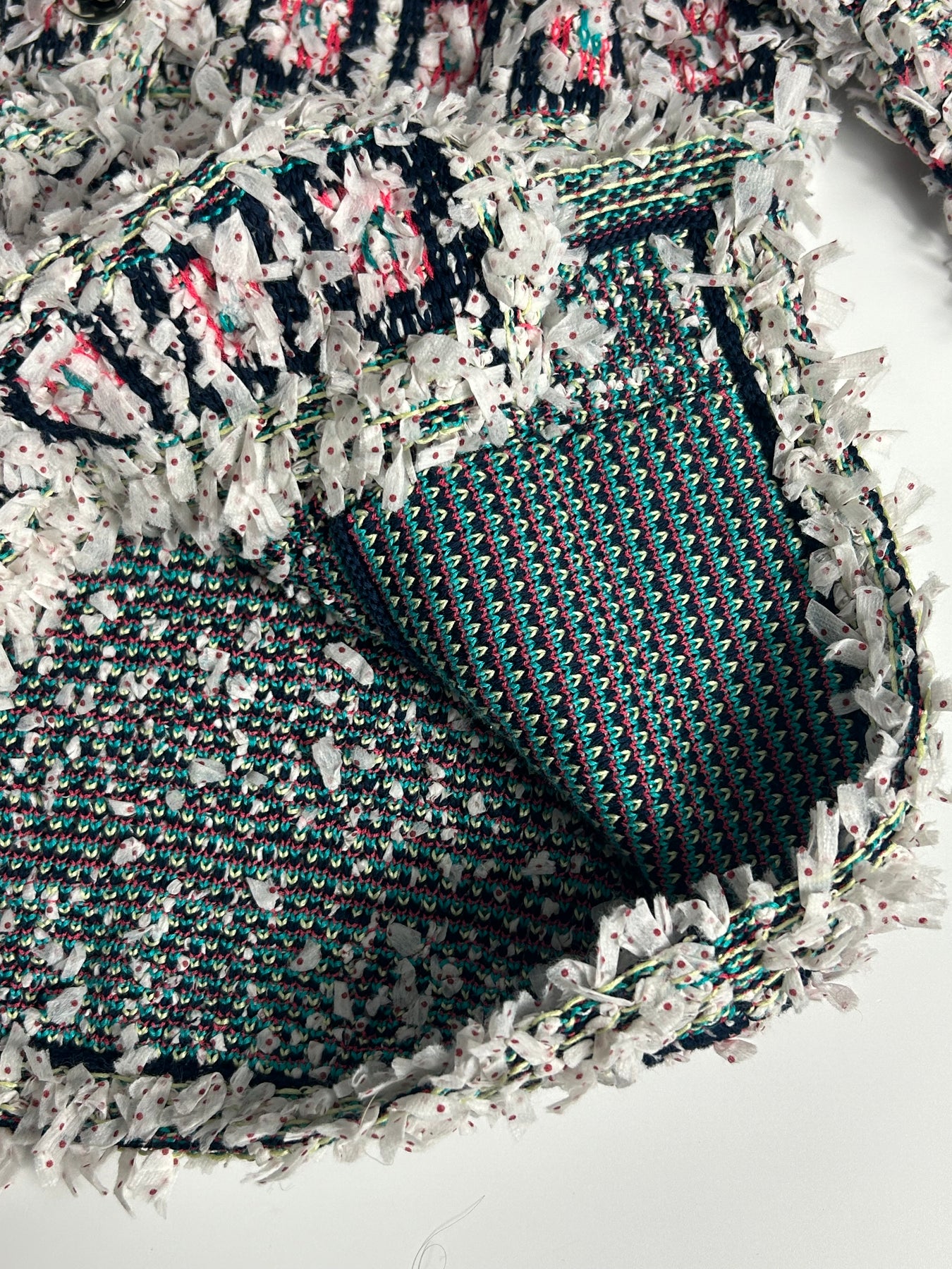 Shop this stunning CHANEL cardi jacket from the Spring Summer 2018 ready to wear collection. Crafted from textured white fabric with multicolor knit detailing and CC plexi logo front closure. The fabric is light and stretch, perfect for the new season ahead. Sleeves are lightly flute with the iconic 3/4 sleeves length to reveals jewelry worn on the wrist.