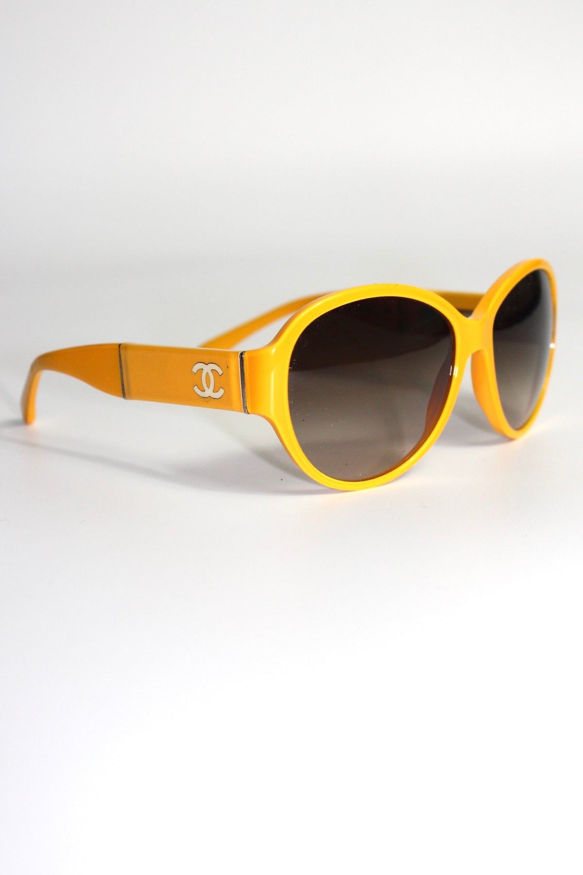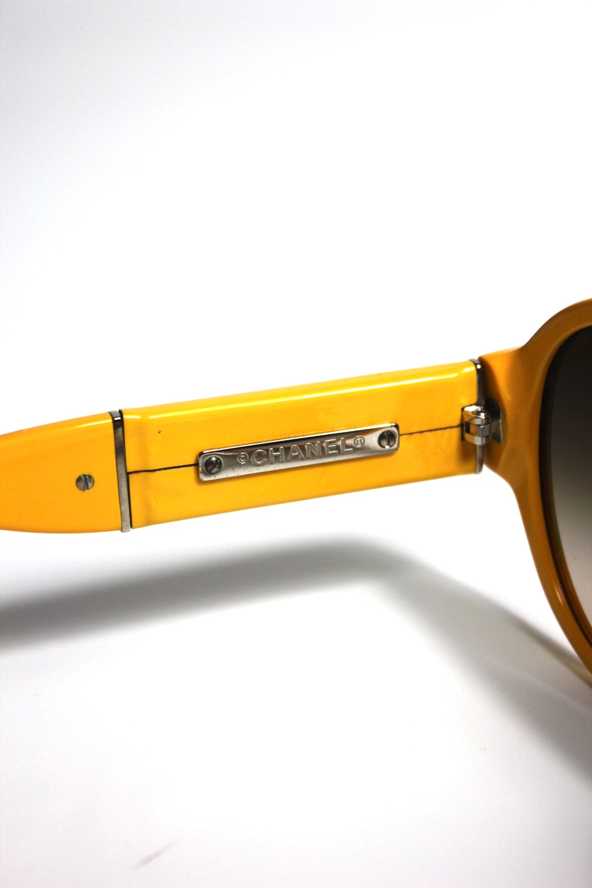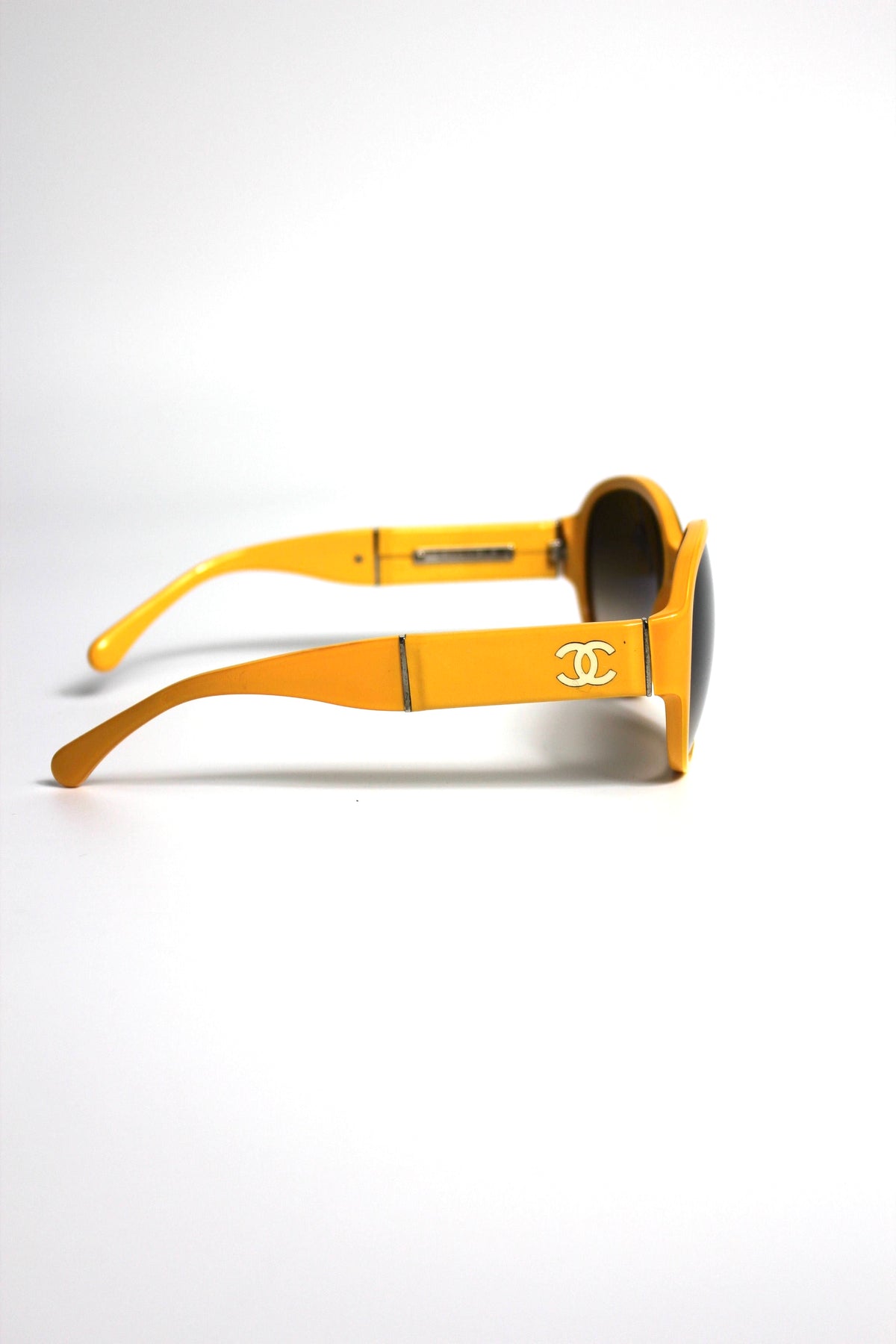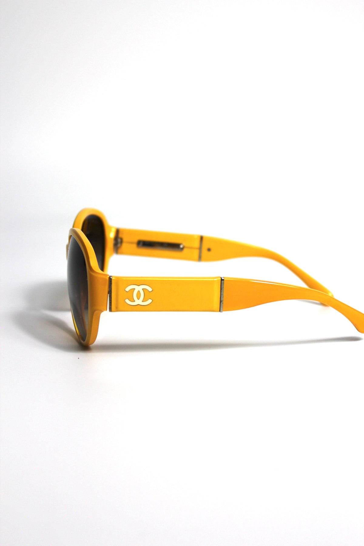 Shop these fun and elegant CHANEL yellow sunglasses with contrasting CC.