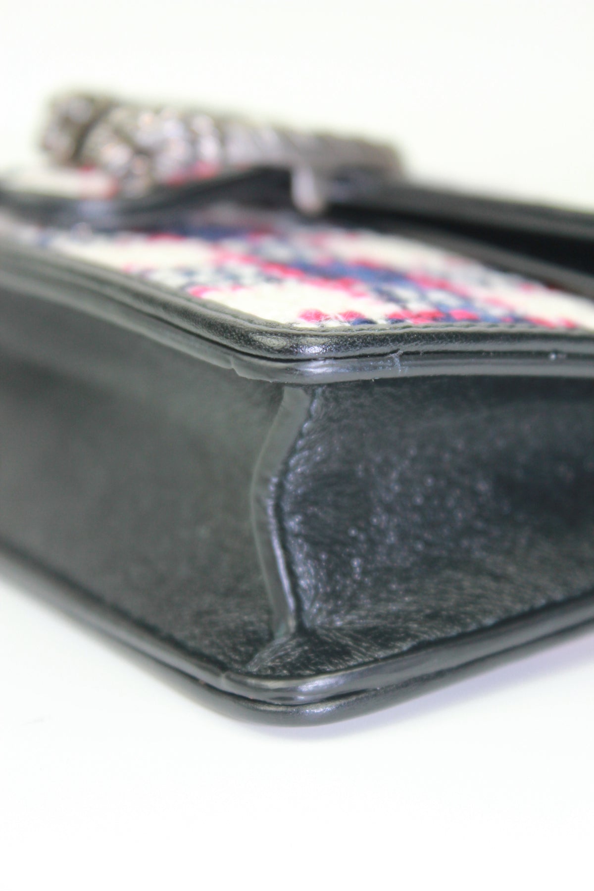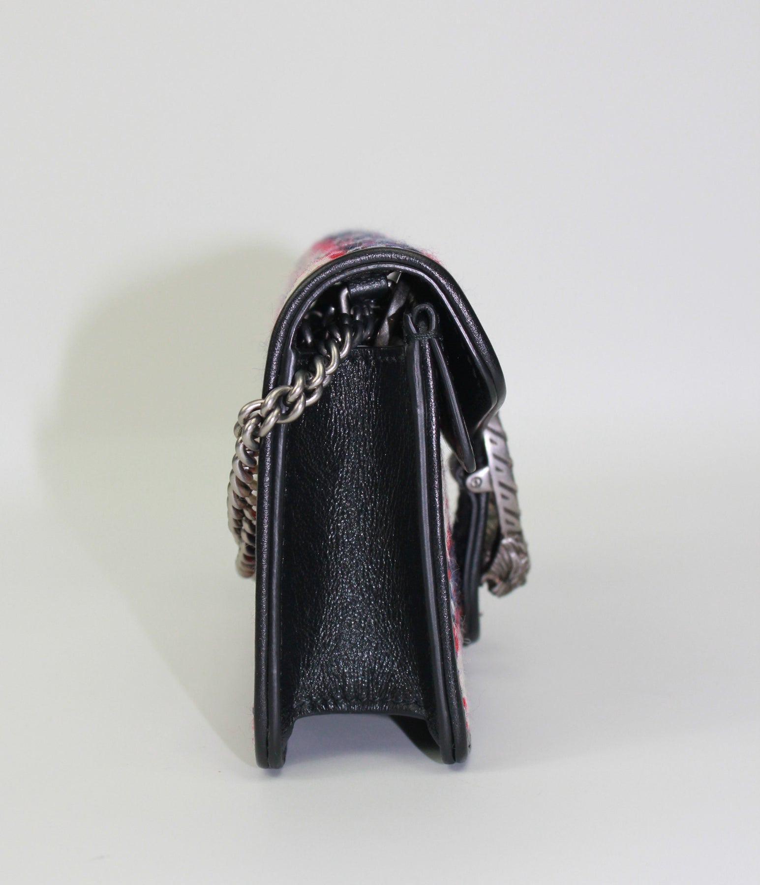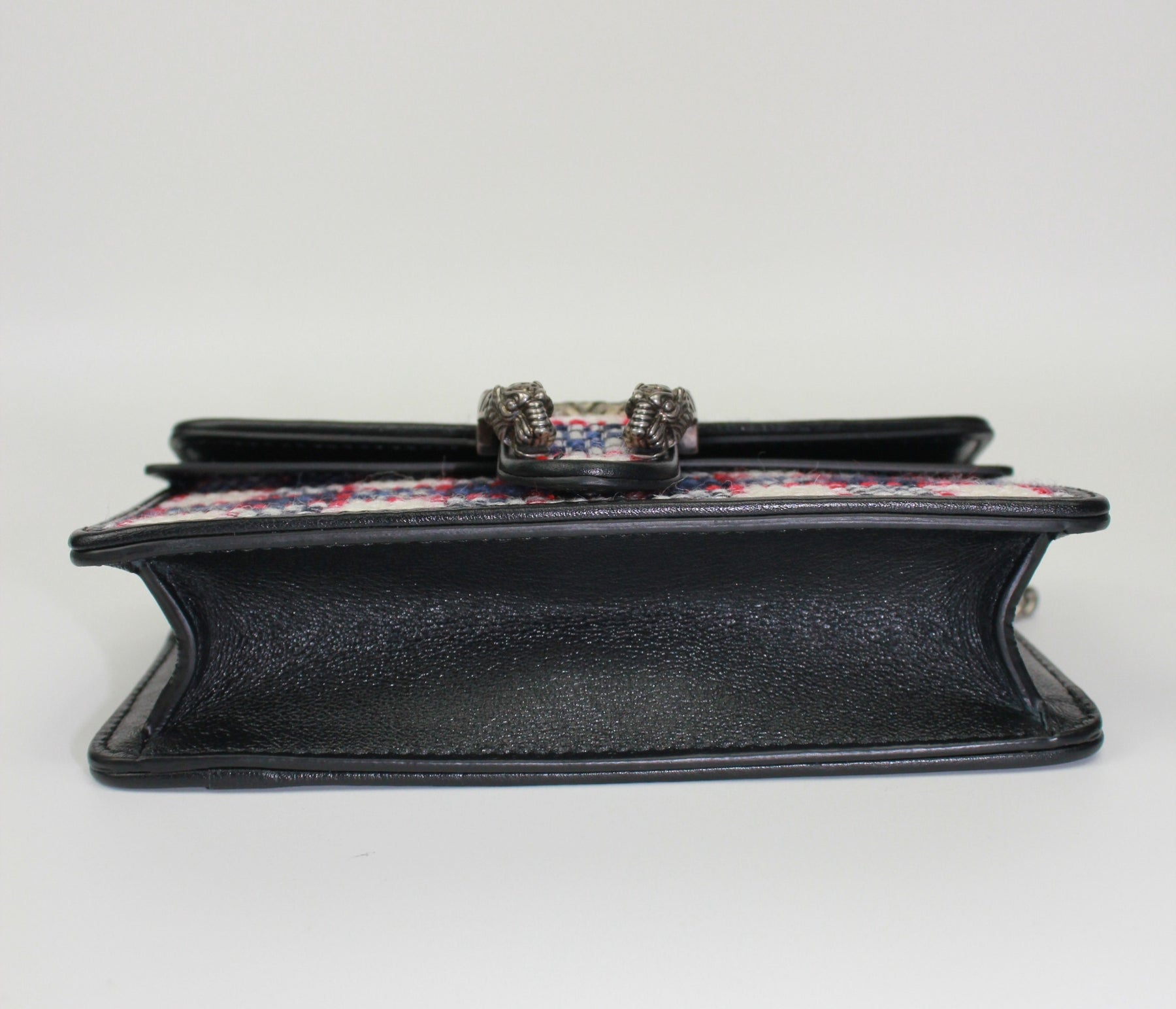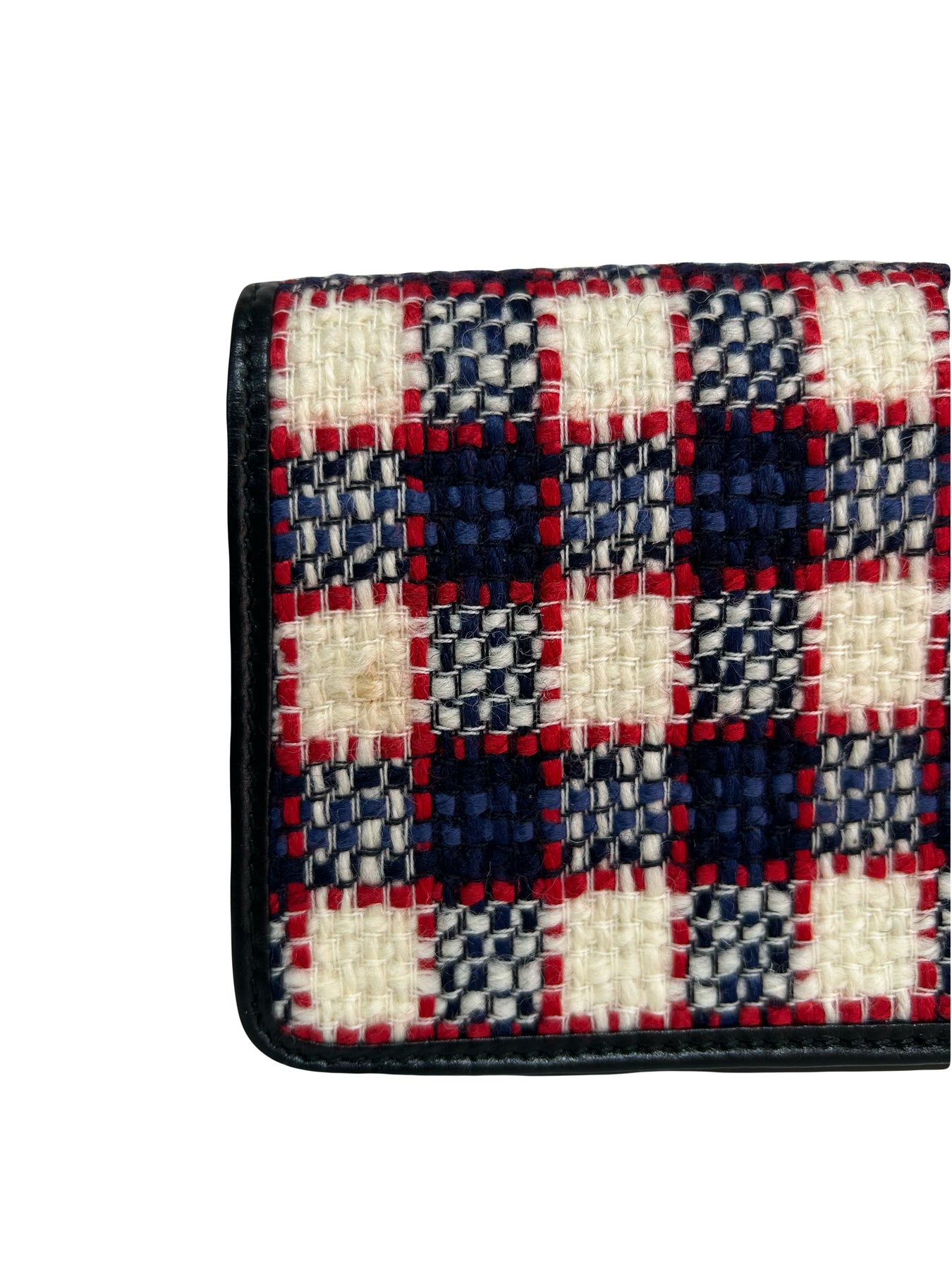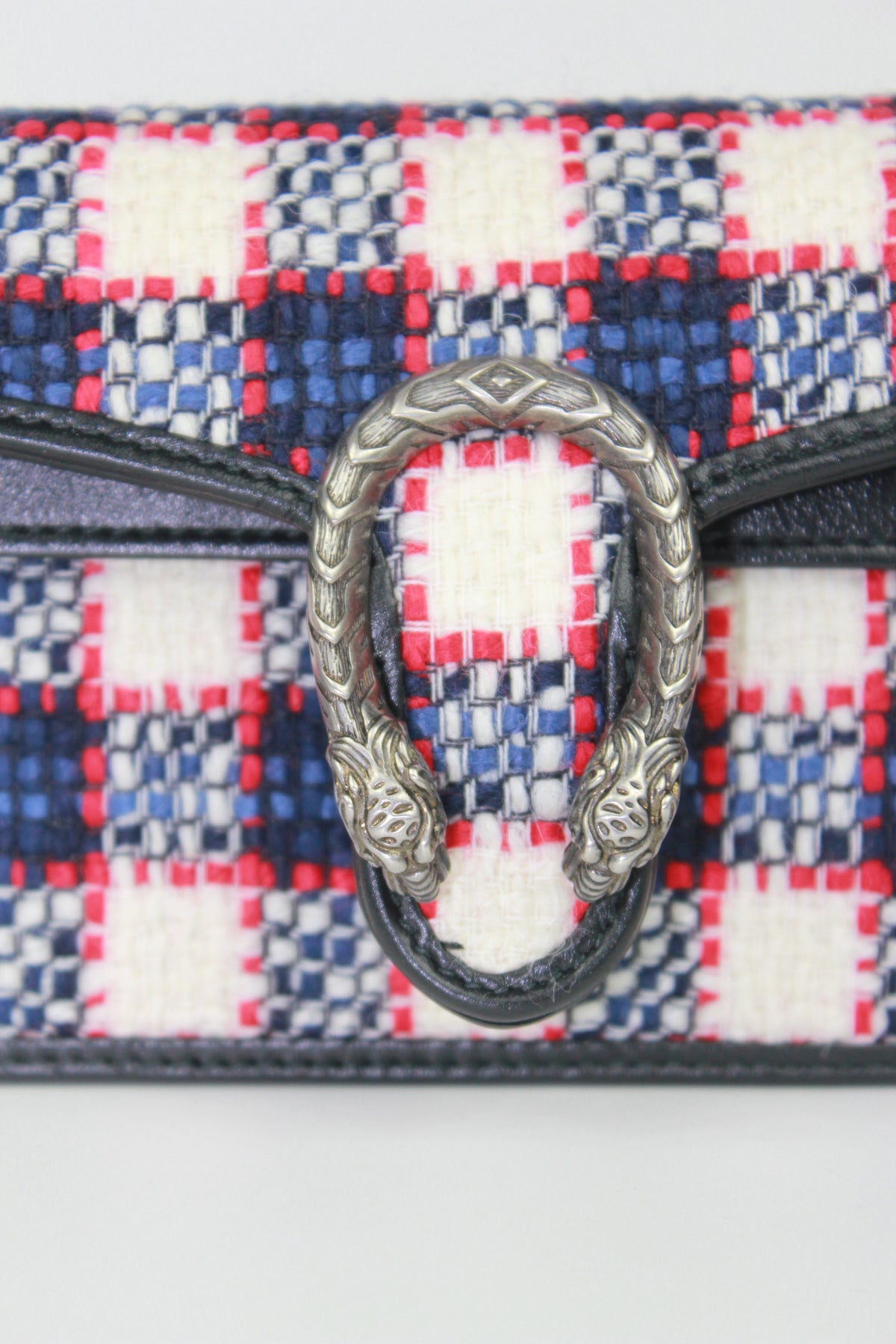 GUCCI Extra Mini handbag crated from a red, blue, white, navy tweed fabric and smooth calfskin leather. It features the GG silver metal front buckle with two feline heads and a long chain to carry crossbody or shoulder. The chain can be removed to allow wear as a clutch.