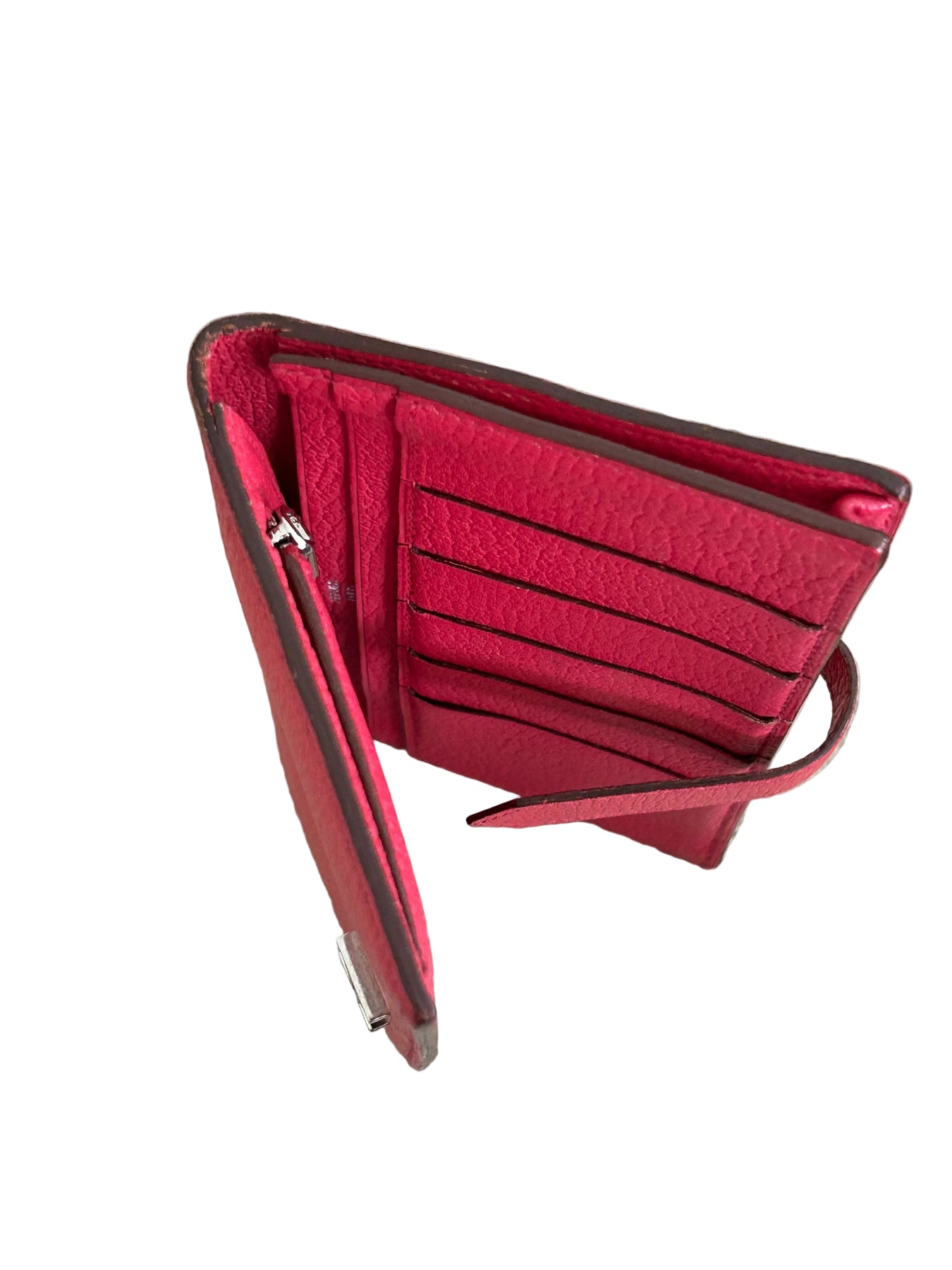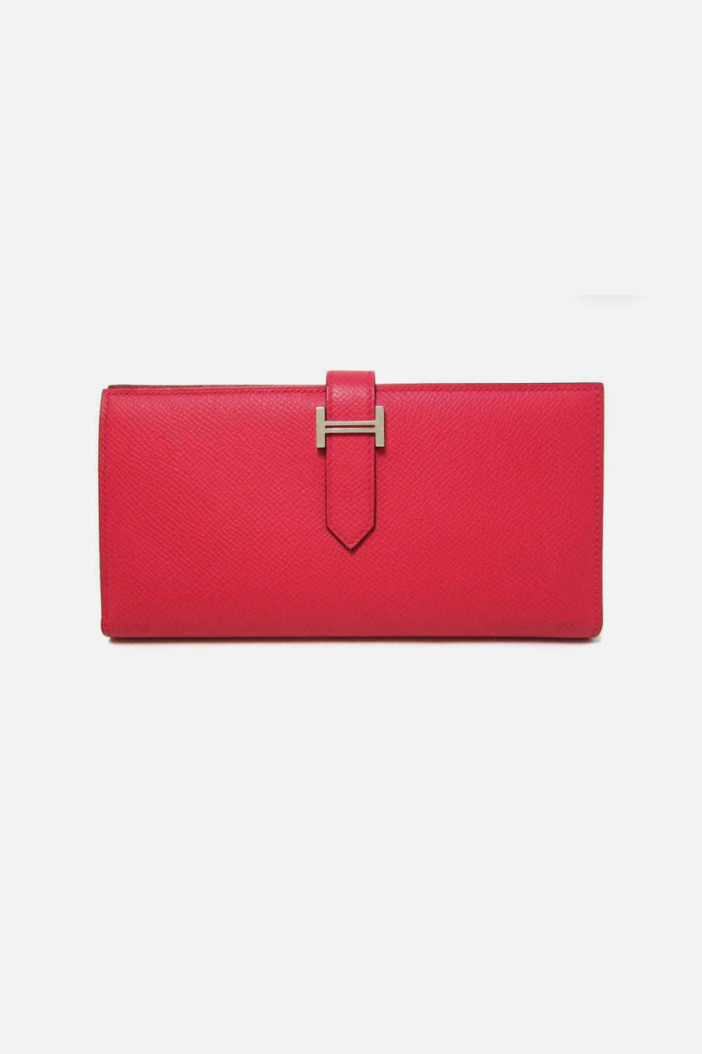 Shop this beautiful small leather good by HERMES, the Bearn wallet is identifiable by its signature leather flap and "H" shaped clasp closure. With its sleek, classic design it allows the leather strap to slide into the H metal buckle to secure it. Crafted here in rose extreme Chevre Mysore paired with a palladium hardware buckle. A timeless piece reflecting the beautiful craftmanship of the French luxury house.