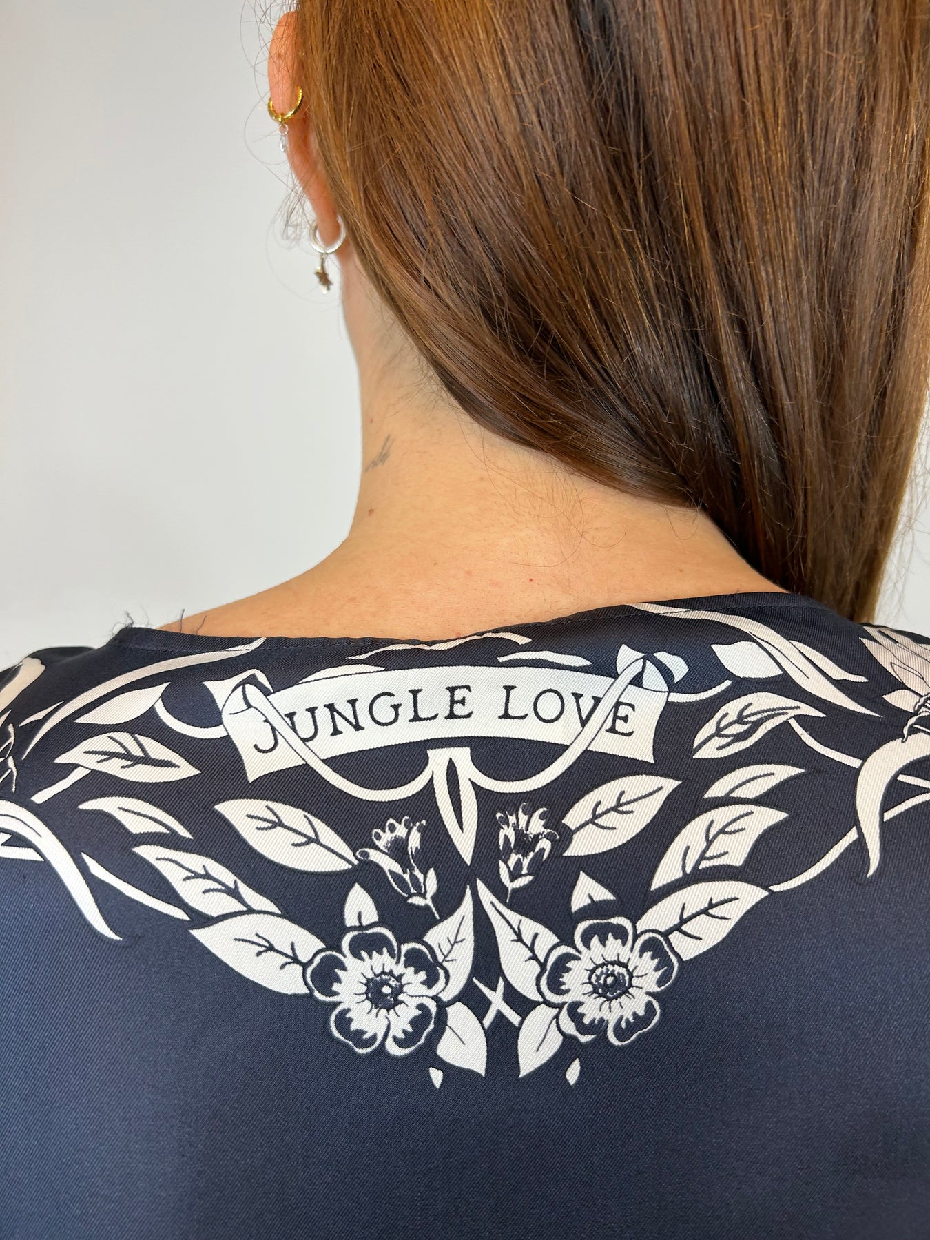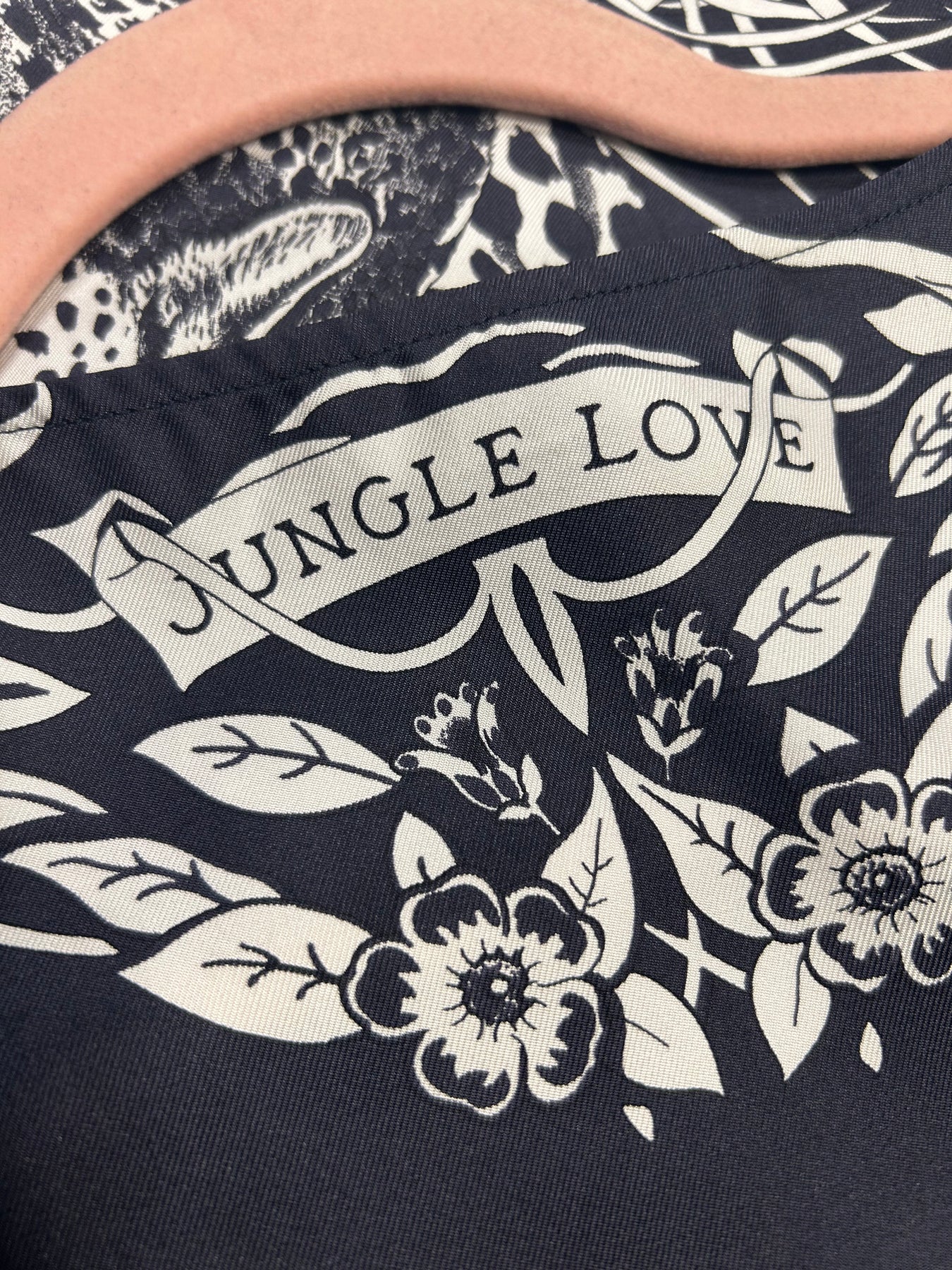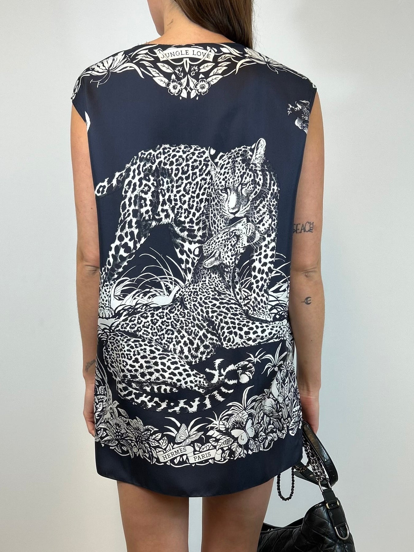 The beautiful HERMES "Jungle Love" is a classic design scarf, originally created by artist Robert Dallet, which depicts two leopards engaged in a courtship surrounded by other jungle wildlife and is created as tunic dress, to wear over a trouser or simply as it iis in the summer.